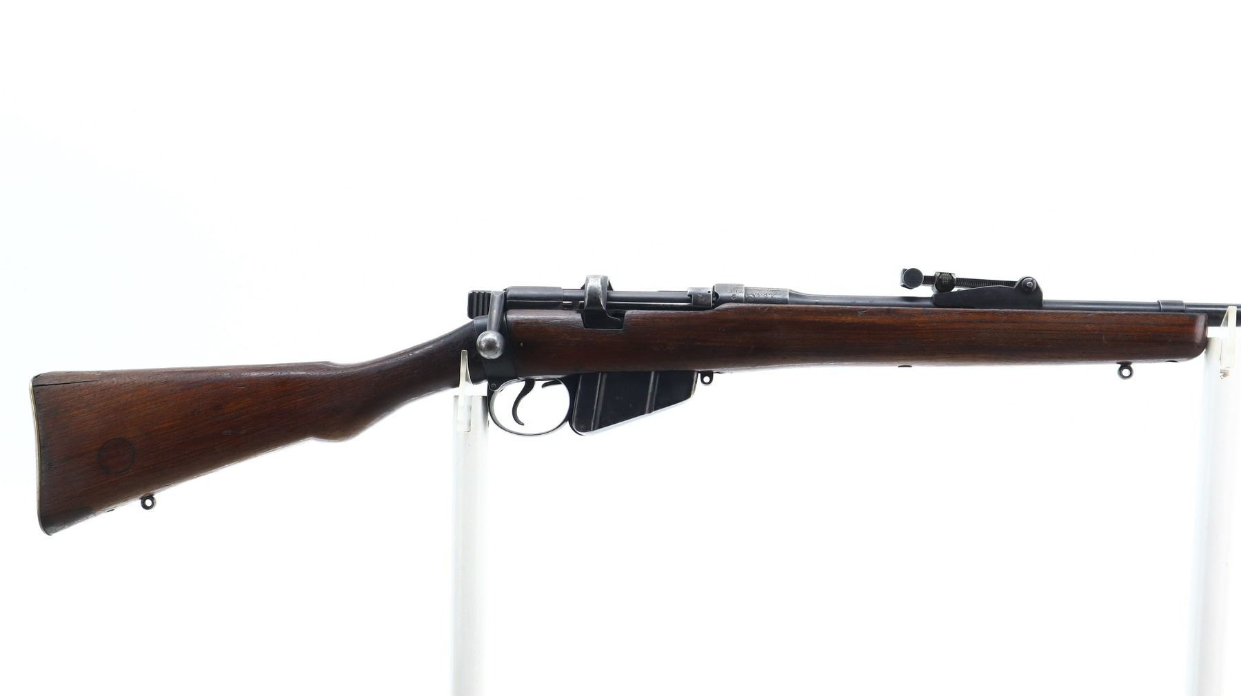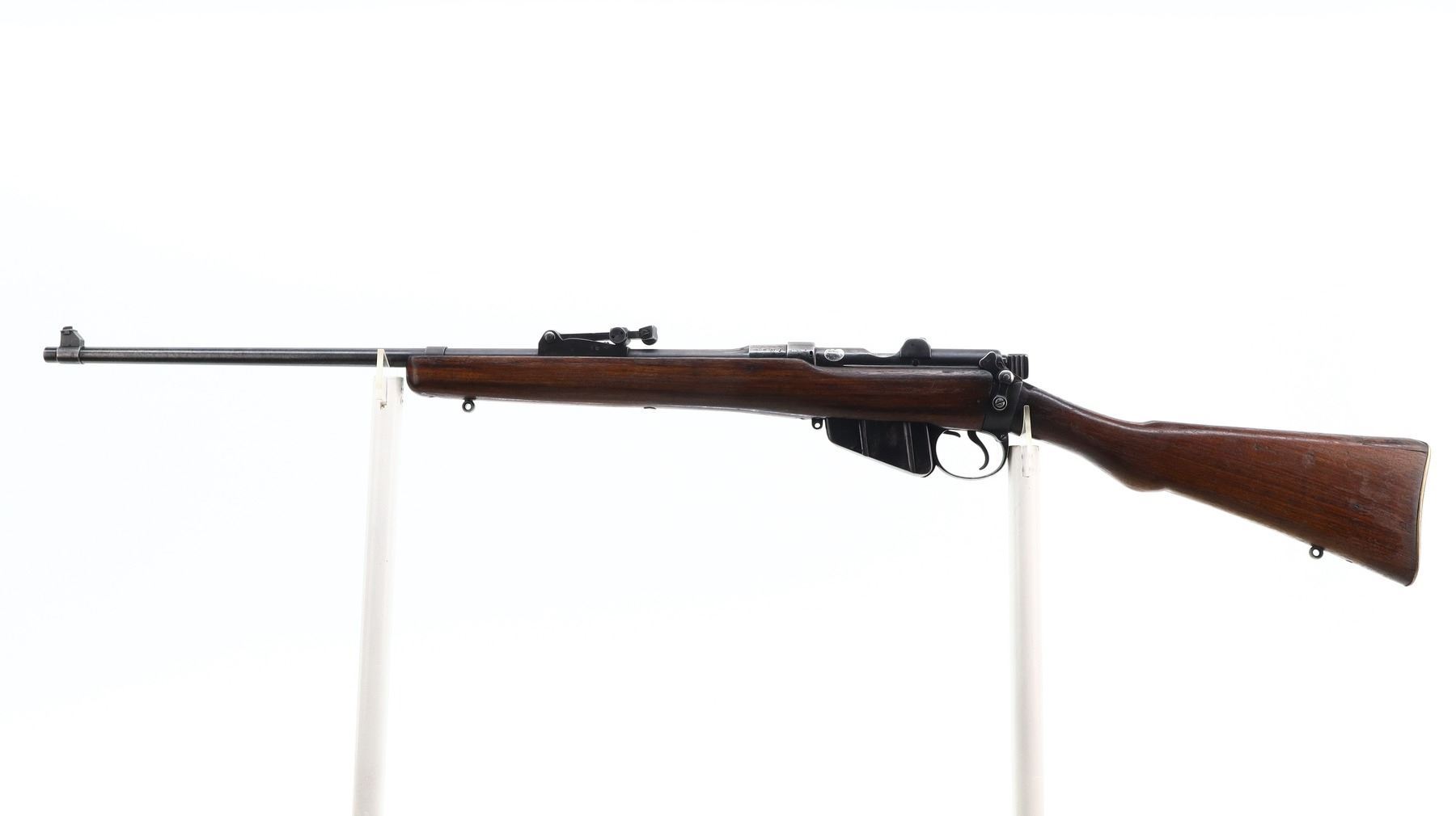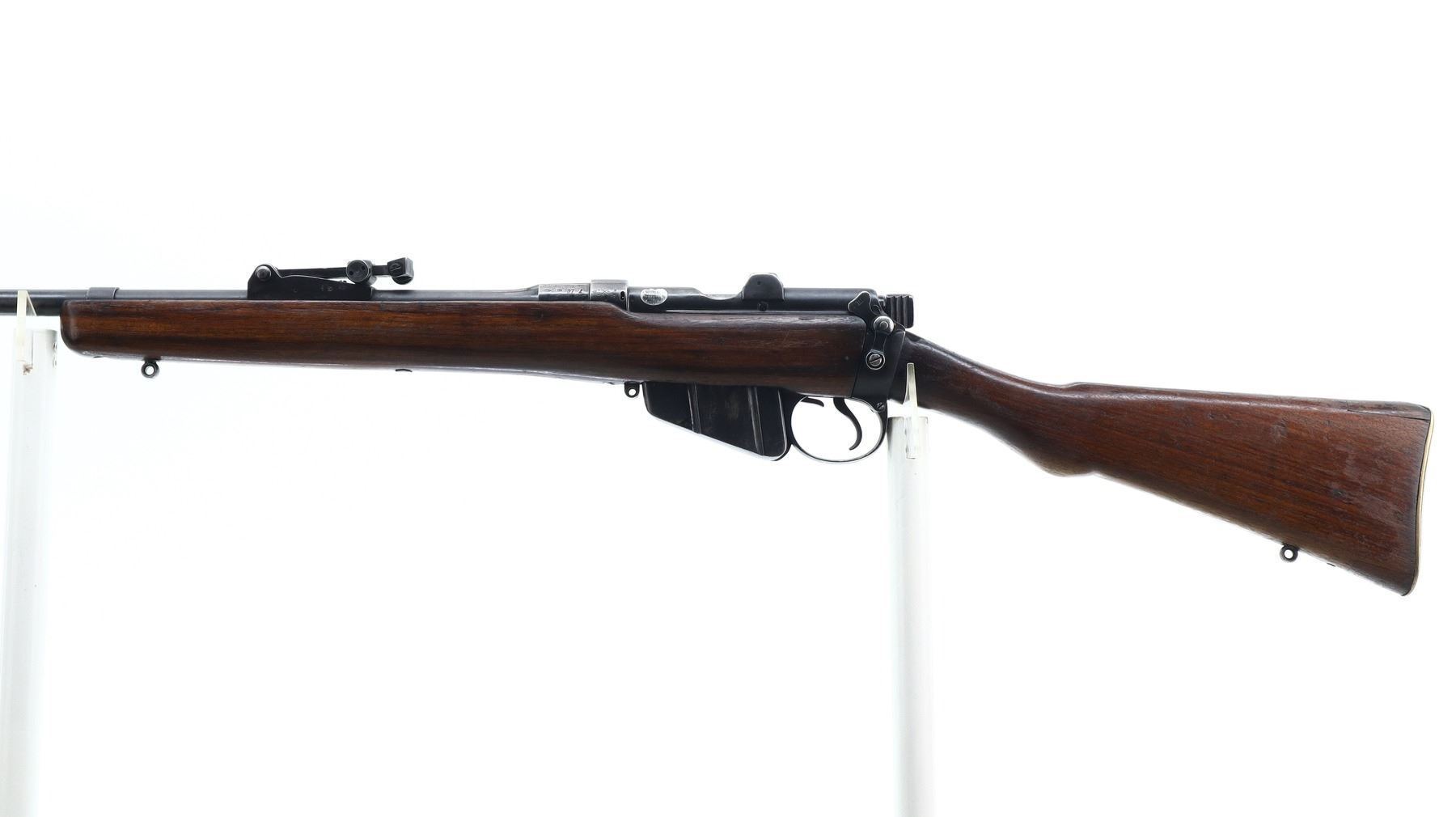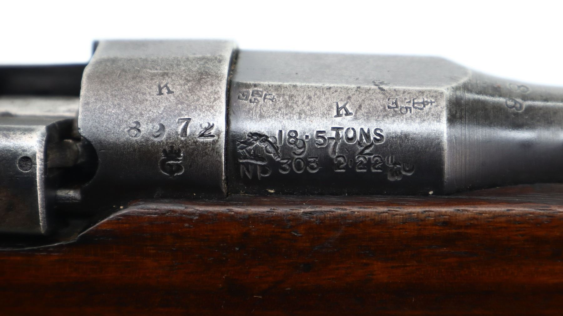 6+/10, LEE ENFIELD, MODEL: NO 1 MK III SPORTER, CALIBER:303 BR, COMES WITH MAGAZINE, BORE IS FAIR, WORN, LIGHT PITTING. MANUFACTURED BY BSA 1916, VISIBLE NUMBERS MATCH. BLADE FRONT SIGHT WITH RAMP, ADJUSTABLE U NOTCHED REAR SIGHT, BLUED FINISH. TWO PIECE SPORTERIZED WOOD STOCKS, PISTOL GRIP, SMOOTH BRASS BUTT PLATE WITH TRAP, BUTT STOCK HAS VARIOUS ARMOURERS REPAIRS, SWIVEL STUDS. METAL FINISH SHOWS SOME SCRATCHES, HANDLING MARKS AND WEAR. STOCKS SHOW SOME MARKS, SCRATCHES AND WEAR. , ACTION: BOLT ACTION RIFLE, BARREL LENGTH: 25.25", SERIAL # K8972, CONDITION: 6+/10, CLASS: CANADIAN NON RESTRICTED