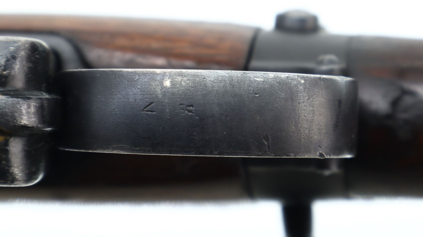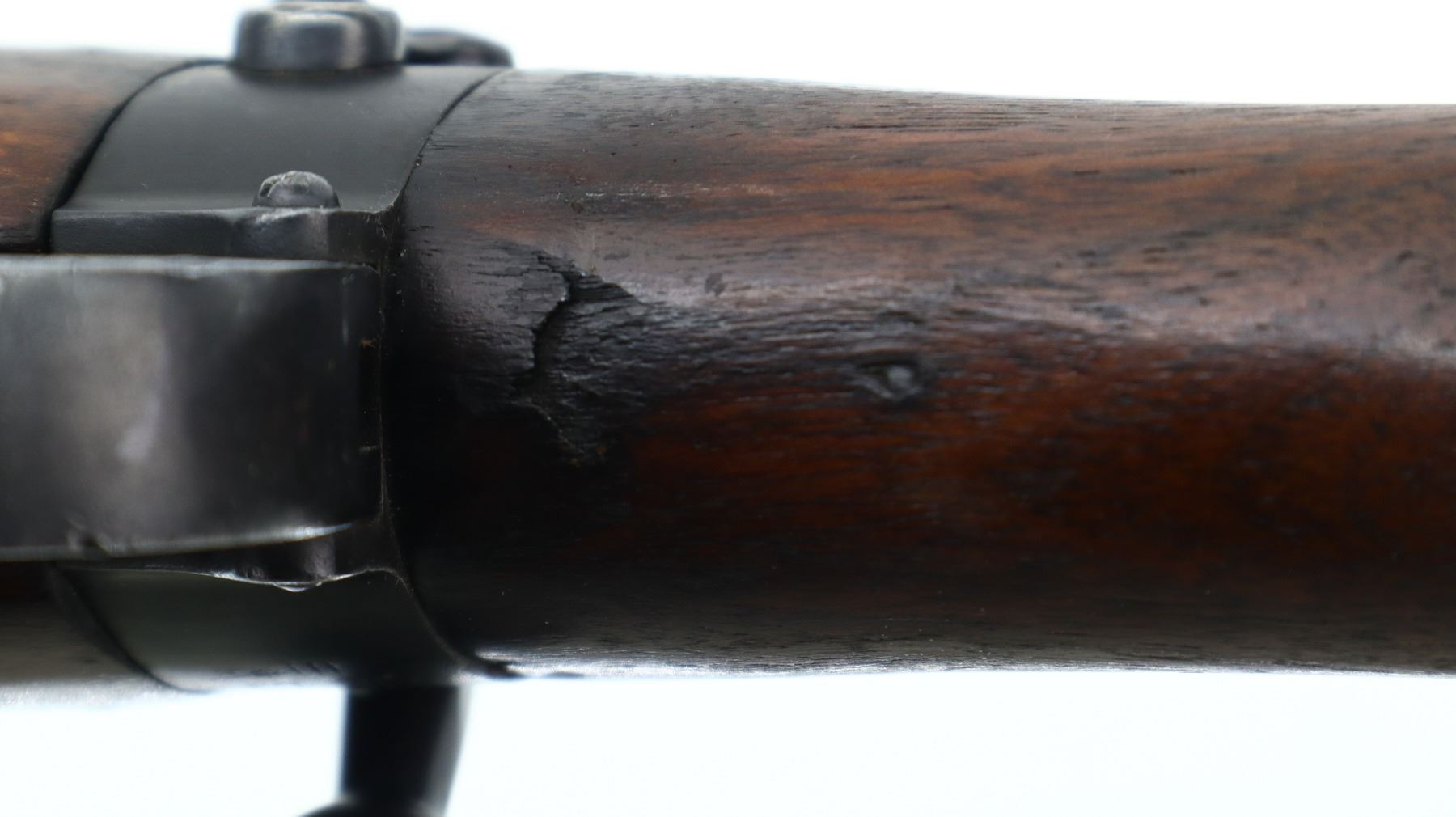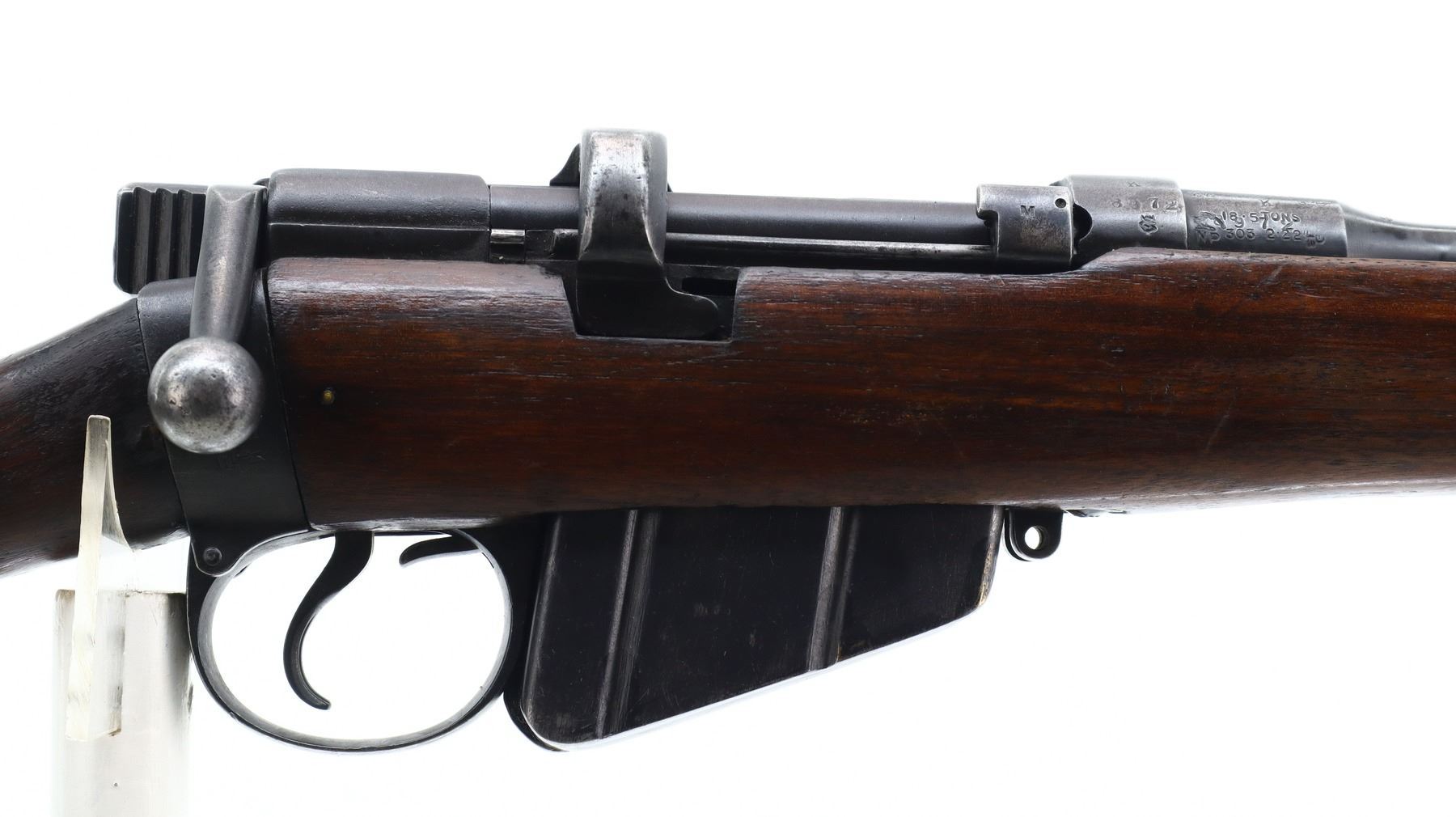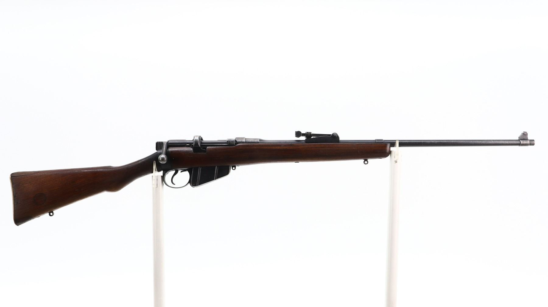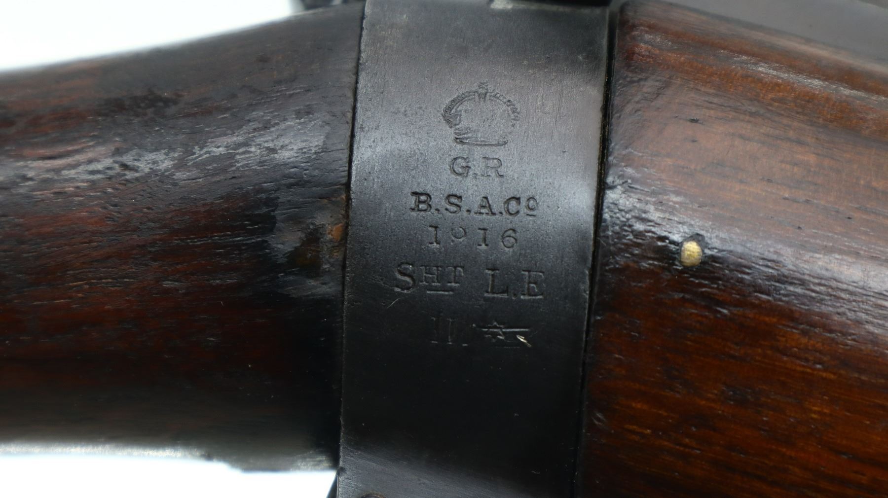 6+/10, LEE ENFIELD, MODEL: NO 1 MK III SPORTER, CALIBER:303 BR, COMES WITH MAGAZINE, BORE IS FAIR, WORN, LIGHT PITTING. MANUFACTURED BY BSA 1916, VISIBLE NUMBERS MATCH. BLADE FRONT SIGHT WITH RAMP, ADJUSTABLE U NOTCHED REAR SIGHT, BLUED FINISH. TWO PIECE SPORTERIZED WOOD STOCKS, PISTOL GRIP, SMOOTH BRASS BUTT PLATE WITH TRAP, BUTT STOCK HAS VARIOUS ARMOURERS REPAIRS, SWIVEL STUDS. METAL FINISH SHOWS SOME SCRATCHES, HANDLING MARKS AND WEAR. STOCKS SHOW SOME MARKS, SCRATCHES AND WEAR. , ACTION: BOLT ACTION RIFLE, BARREL LENGTH: 25.25", SERIAL # K8972, CONDITION: 6+/10, CLASS: CANADIAN NON RESTRICTED