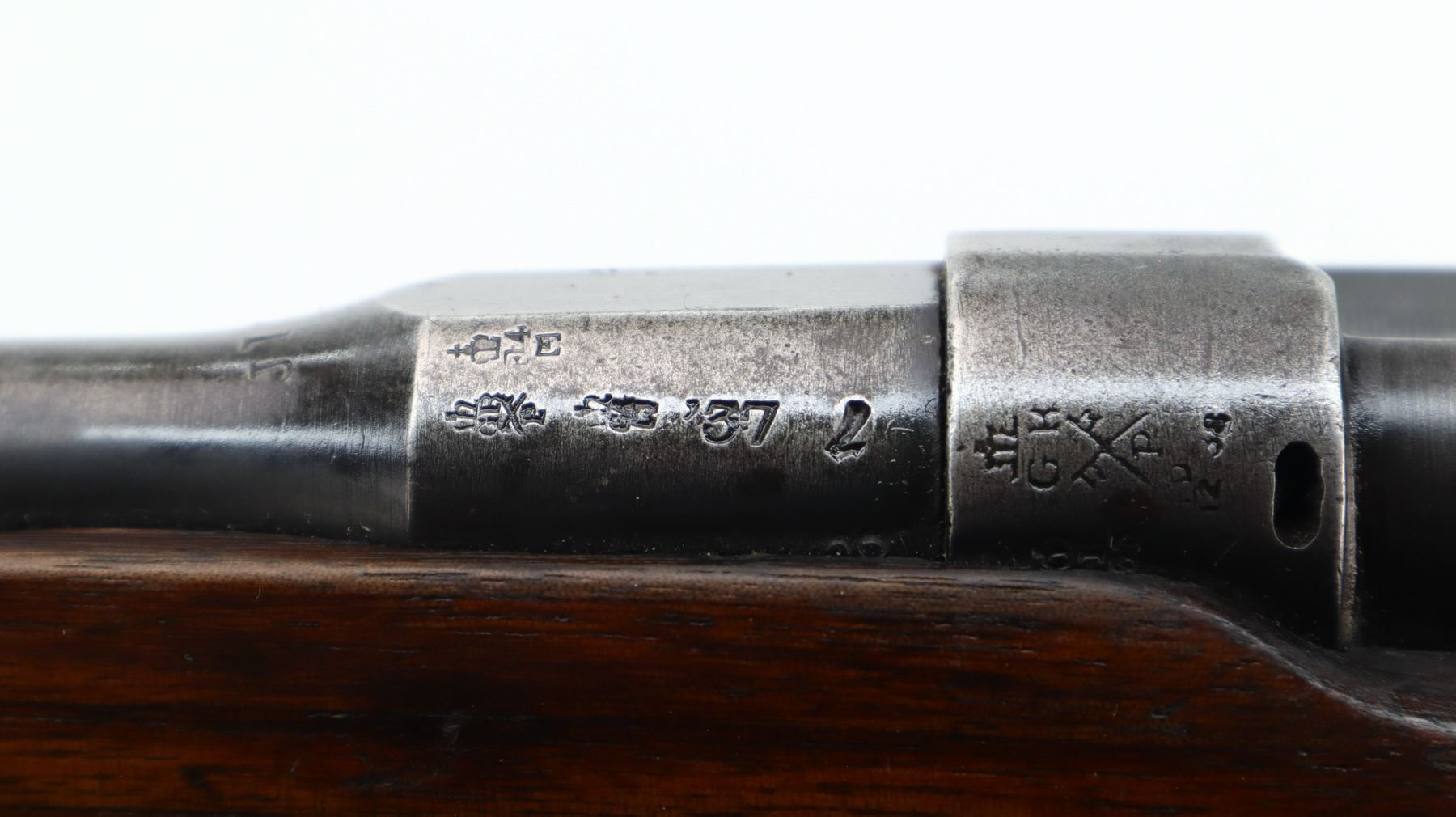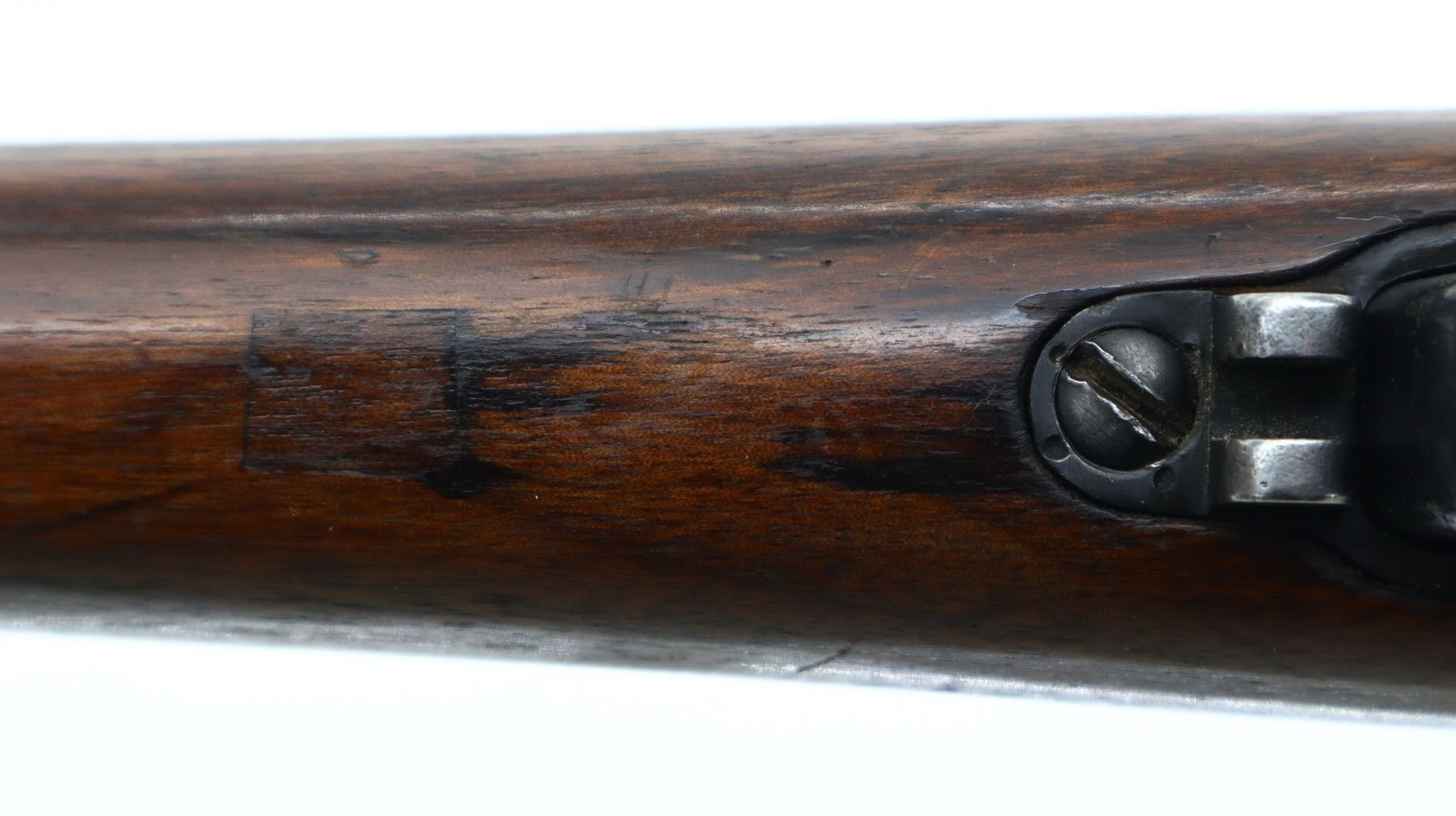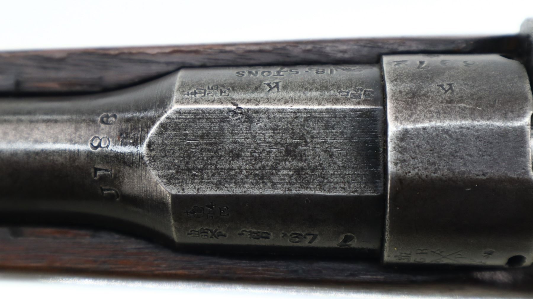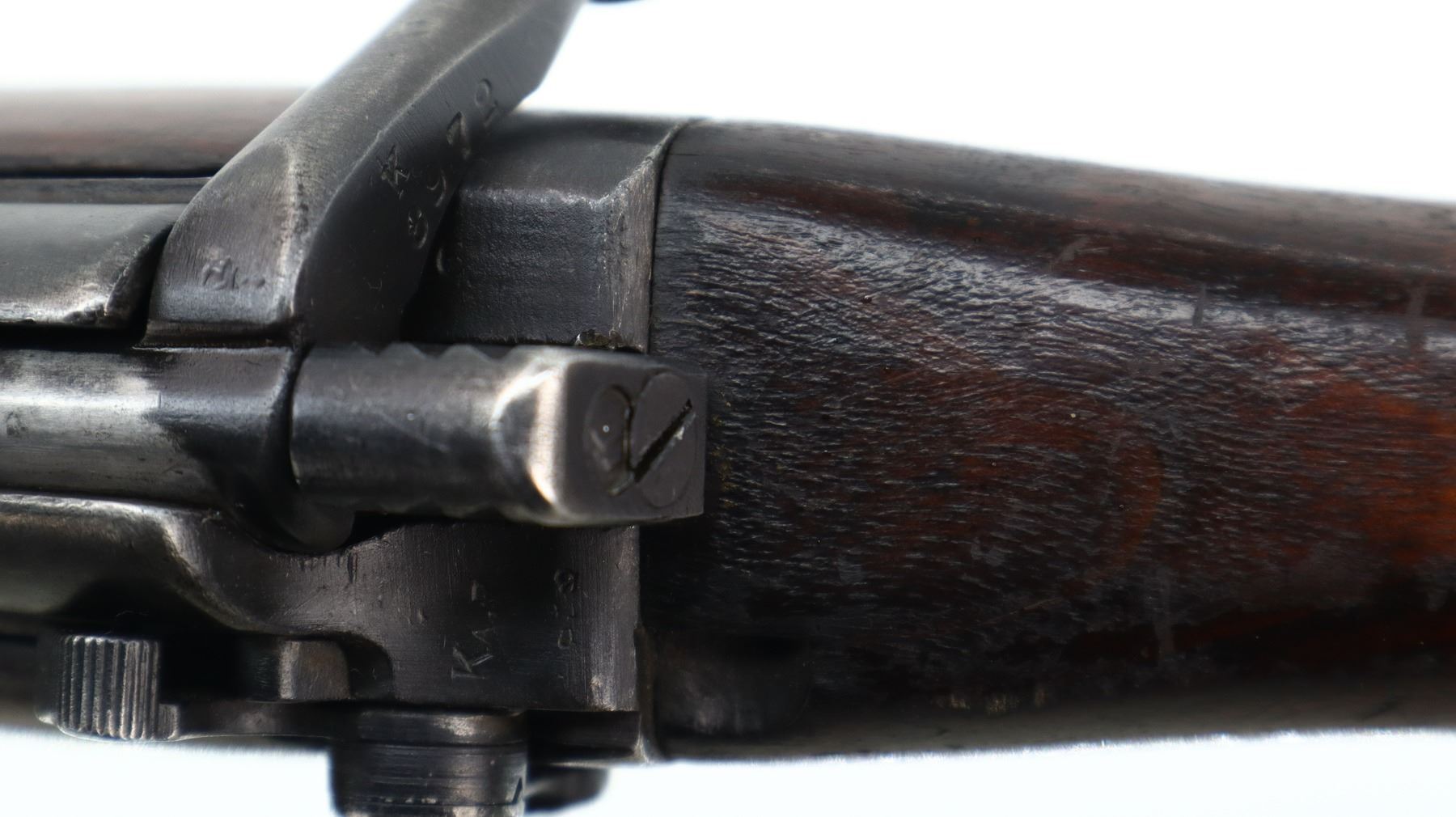 6+/10, LEE ENFIELD, MODEL: NO 1 MK III SPORTER, CALIBER:303 BR, COMES WITH MAGAZINE, BORE IS FAIR, WORN, LIGHT PITTING. MANUFACTURED BY BSA 1916, VISIBLE NUMBERS MATCH. BLADE FRONT SIGHT WITH RAMP, ADJUSTABLE U NOTCHED REAR SIGHT, BLUED FINISH. TWO PIECE SPORTERIZED WOOD STOCKS, PISTOL GRIP, SMOOTH BRASS BUTT PLATE WITH TRAP, BUTT STOCK HAS VARIOUS ARMOURERS REPAIRS, SWIVEL STUDS. METAL FINISH SHOWS SOME SCRATCHES, HANDLING MARKS AND WEAR. STOCKS SHOW SOME MARKS, SCRATCHES AND WEAR. , ACTION: BOLT ACTION RIFLE, BARREL LENGTH: 25.25", SERIAL # K8972, CONDITION: 6+/10, CLASS: CANADIAN NON RESTRICTED