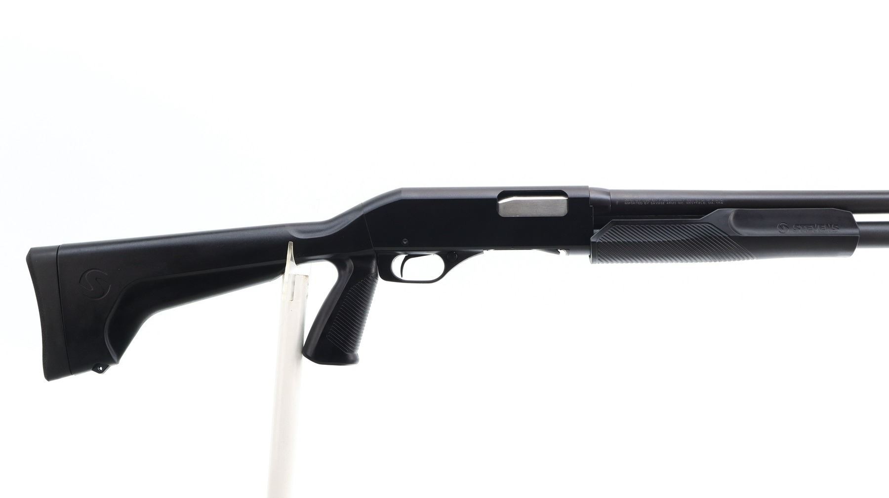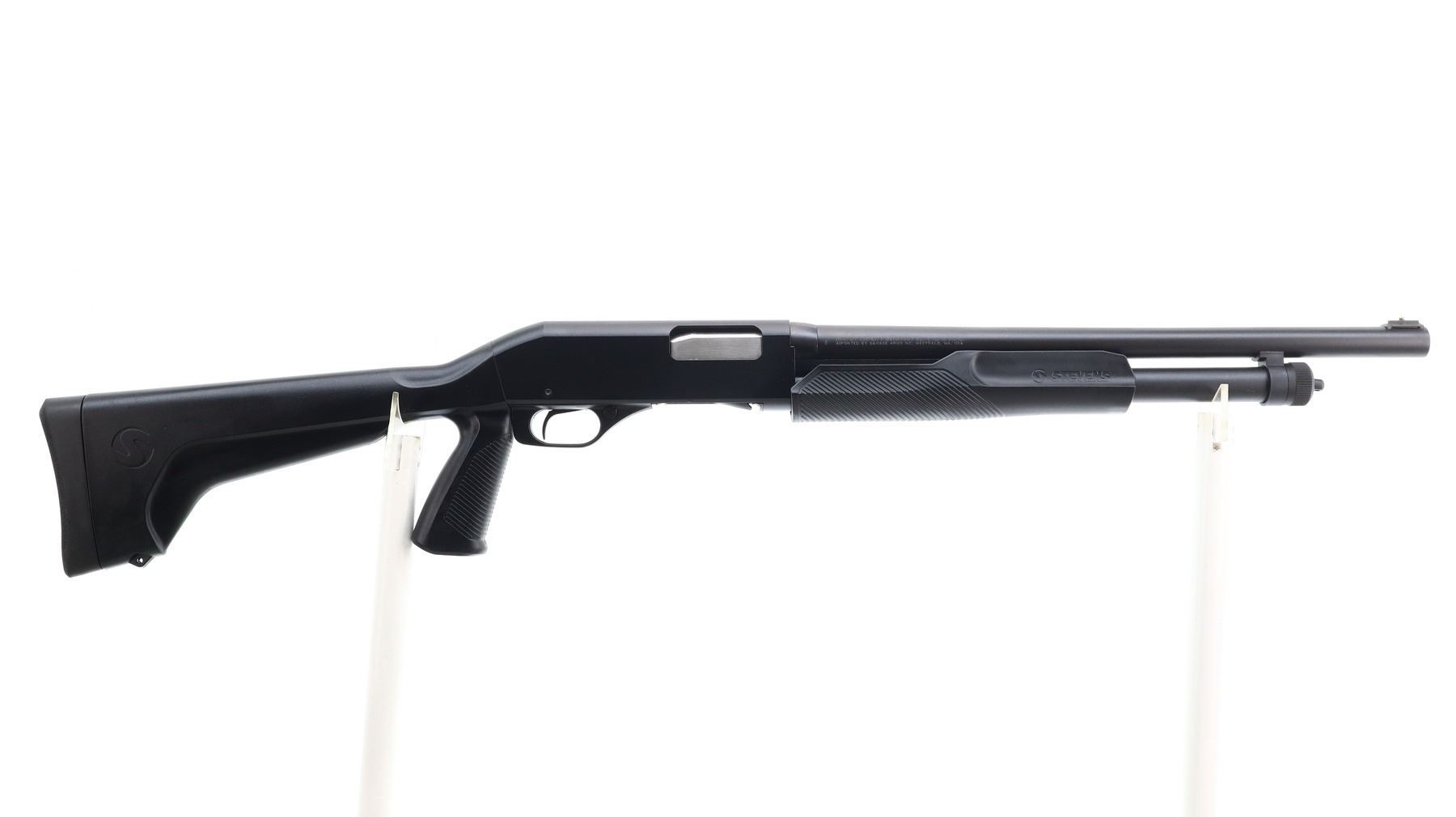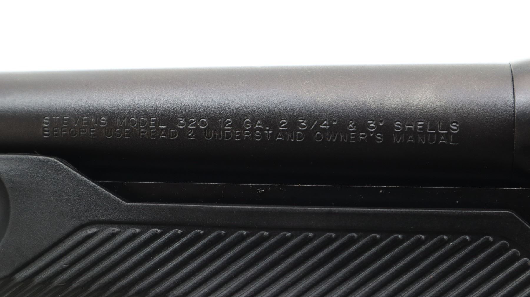 8/10, STEVENS, MODEL: 320, CALIBER:12 G X 3", BORE IS EXCELLENT. FIXED CYLINDER CHOKE. BRASS BEAD WITH RAMP, BLACK MATTE FINISH ROUND BARREL, BLACK ALLOY RECEIVER DRILLED AND TAPPED FOR SCOPE MOUNT, PLUG SCREWS INSTALLED. TWO PIECE BLACK SYNTHETIC STOCKS, GROOVED FOREARM AND PISTOL GRIP, TEXTURED BLACK RUBBER RECOIL PAD, SWIVEL STUDS, 3/4 LENGTH MAG TUBE. METAL FINISH SHOWS SOME SCRATCHES AND HANDLING MARKS. STOCKS SHOW SOME SLIGHT MARKS AND SCRATCHES. , ACTION: PUMP ACTION SHOTGUN, BARREL LENGTH: 18.5", SERIAL # 214486X, CONDITION: 8/10, CLASS: CANADIAN NON RESTRICTED