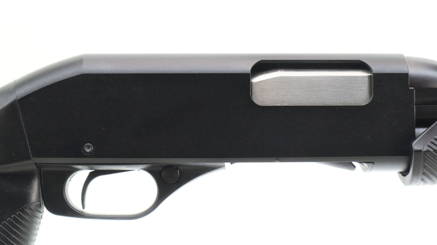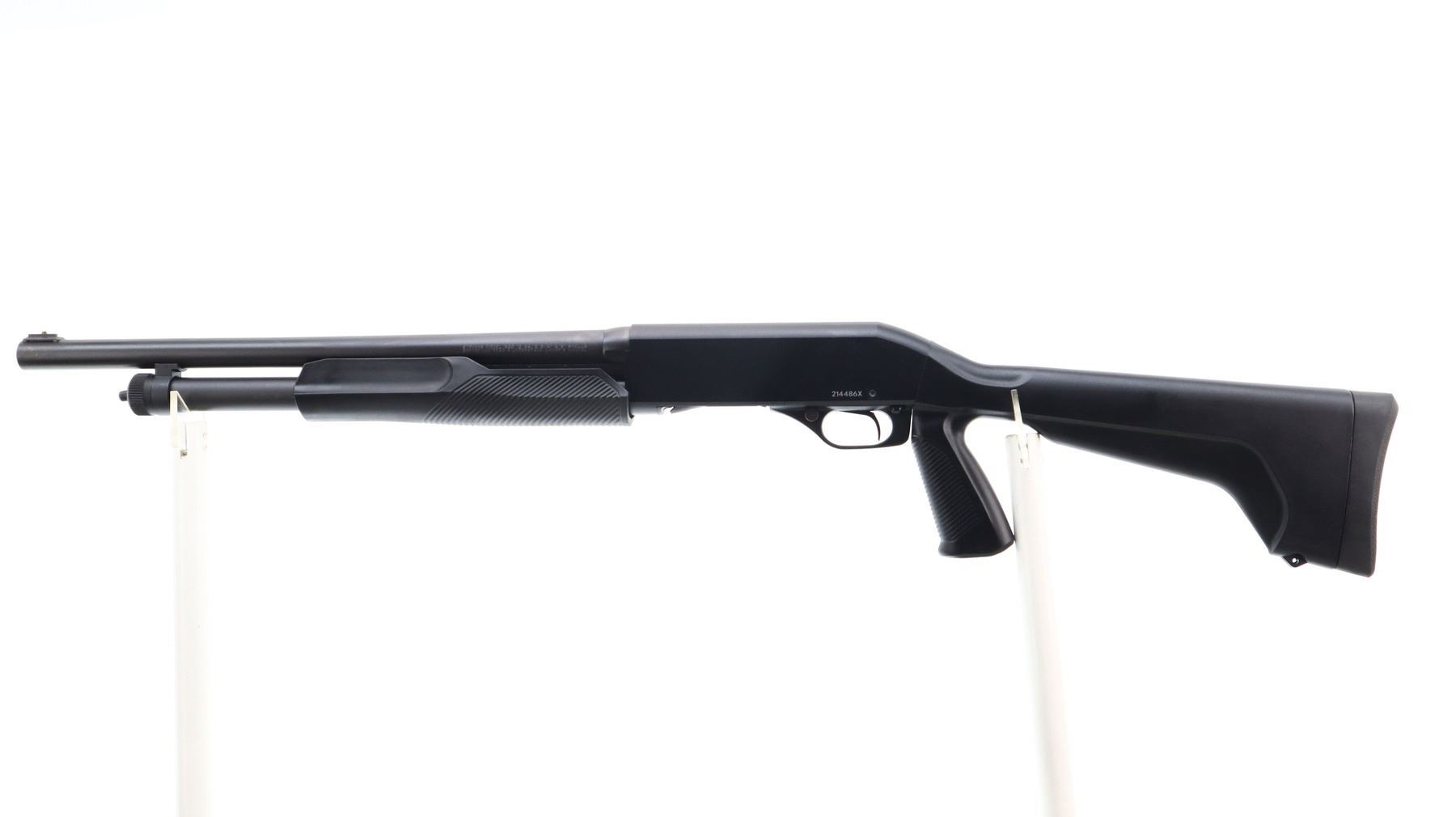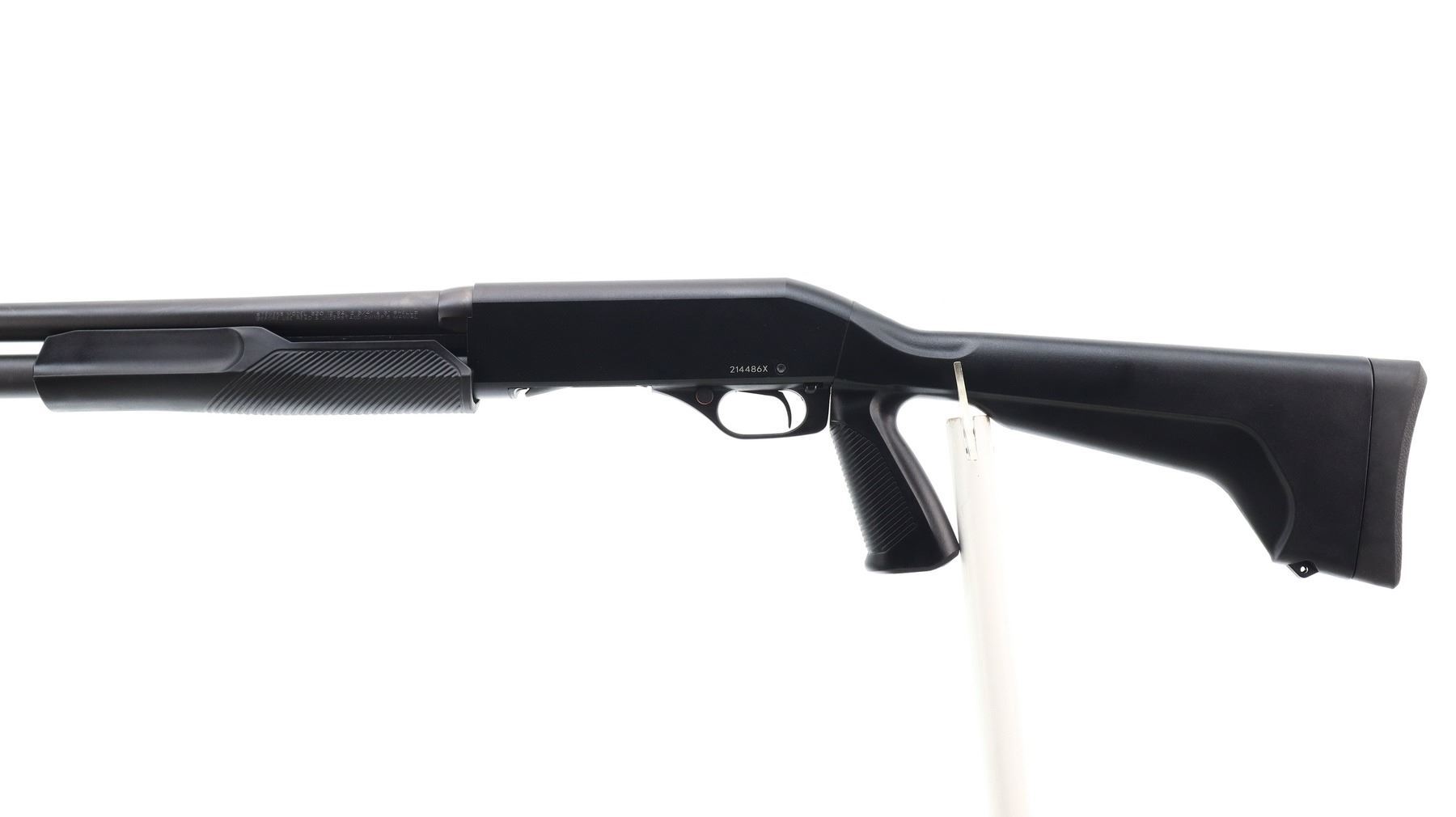 8/10, STEVENS, MODEL: 320, CALIBER:12 G X 3", BORE IS EXCELLENT. FIXED CYLINDER CHOKE. BRASS BEAD WITH RAMP, BLACK MATTE FINISH ROUND BARREL, BLACK ALLOY RECEIVER DRILLED AND TAPPED FOR SCOPE MOUNT, PLUG SCREWS INSTALLED. TWO PIECE BLACK SYNTHETIC STOCKS, GROOVED FOREARM AND PISTOL GRIP, TEXTURED BLACK RUBBER RECOIL PAD, SWIVEL STUDS, 3/4 LENGTH MAG TUBE. METAL FINISH SHOWS SOME SCRATCHES AND HANDLING MARKS. STOCKS SHOW SOME SLIGHT MARKS AND SCRATCHES. , ACTION: PUMP ACTION SHOTGUN, BARREL LENGTH: 18.5", SERIAL # 214486X, CONDITION: 8/10, CLASS: CANADIAN NON RESTRICTED
