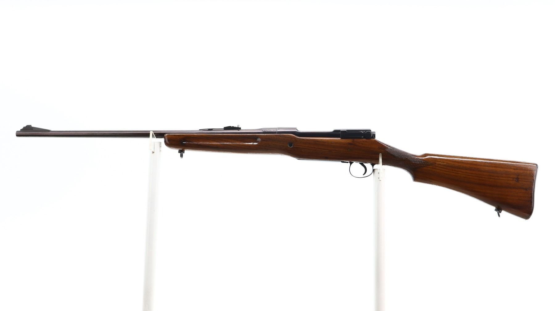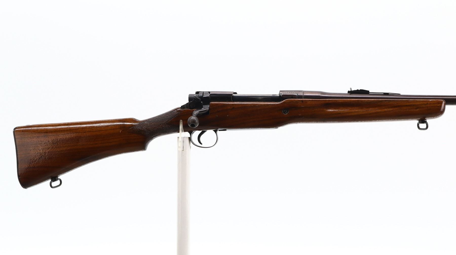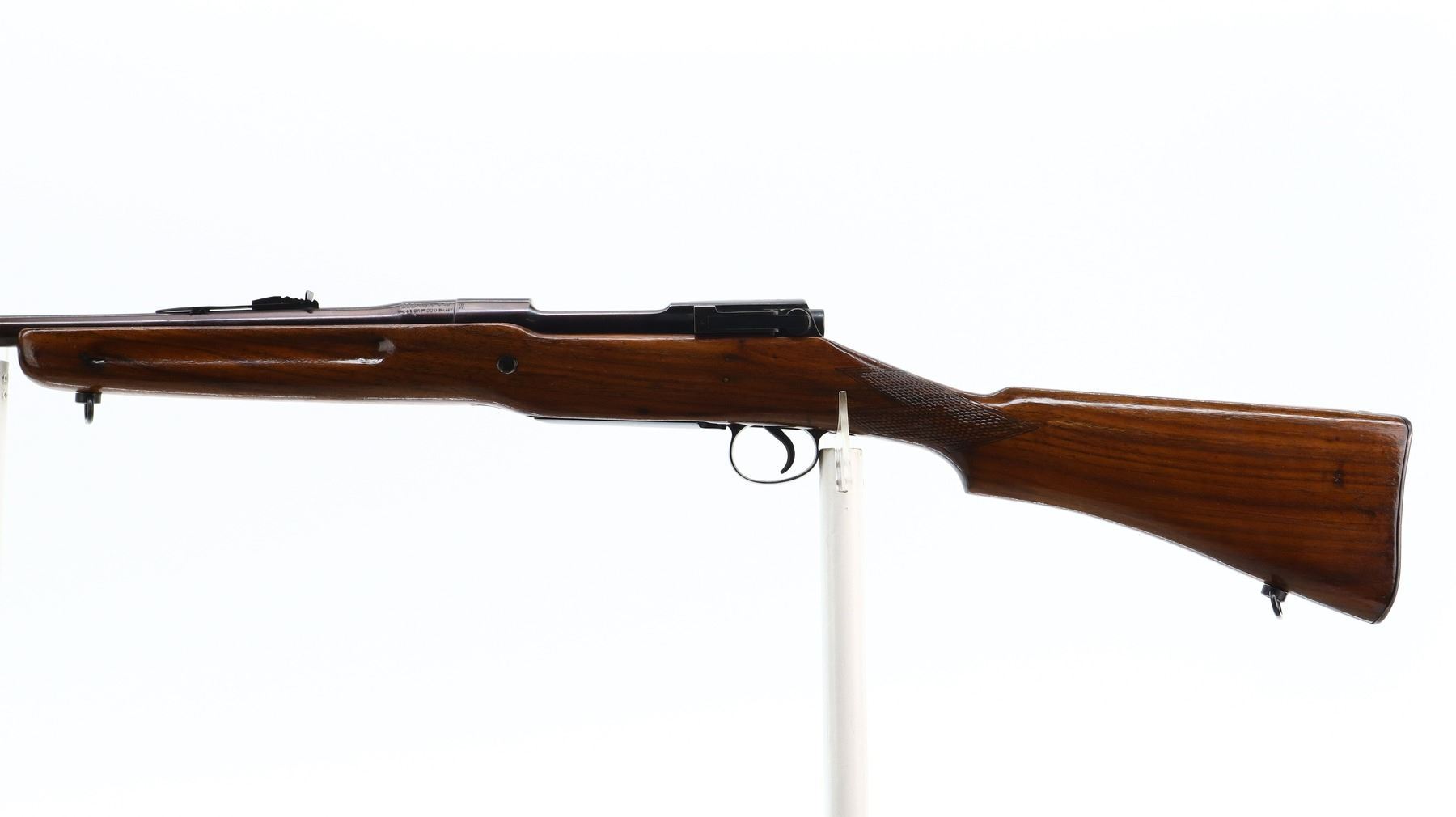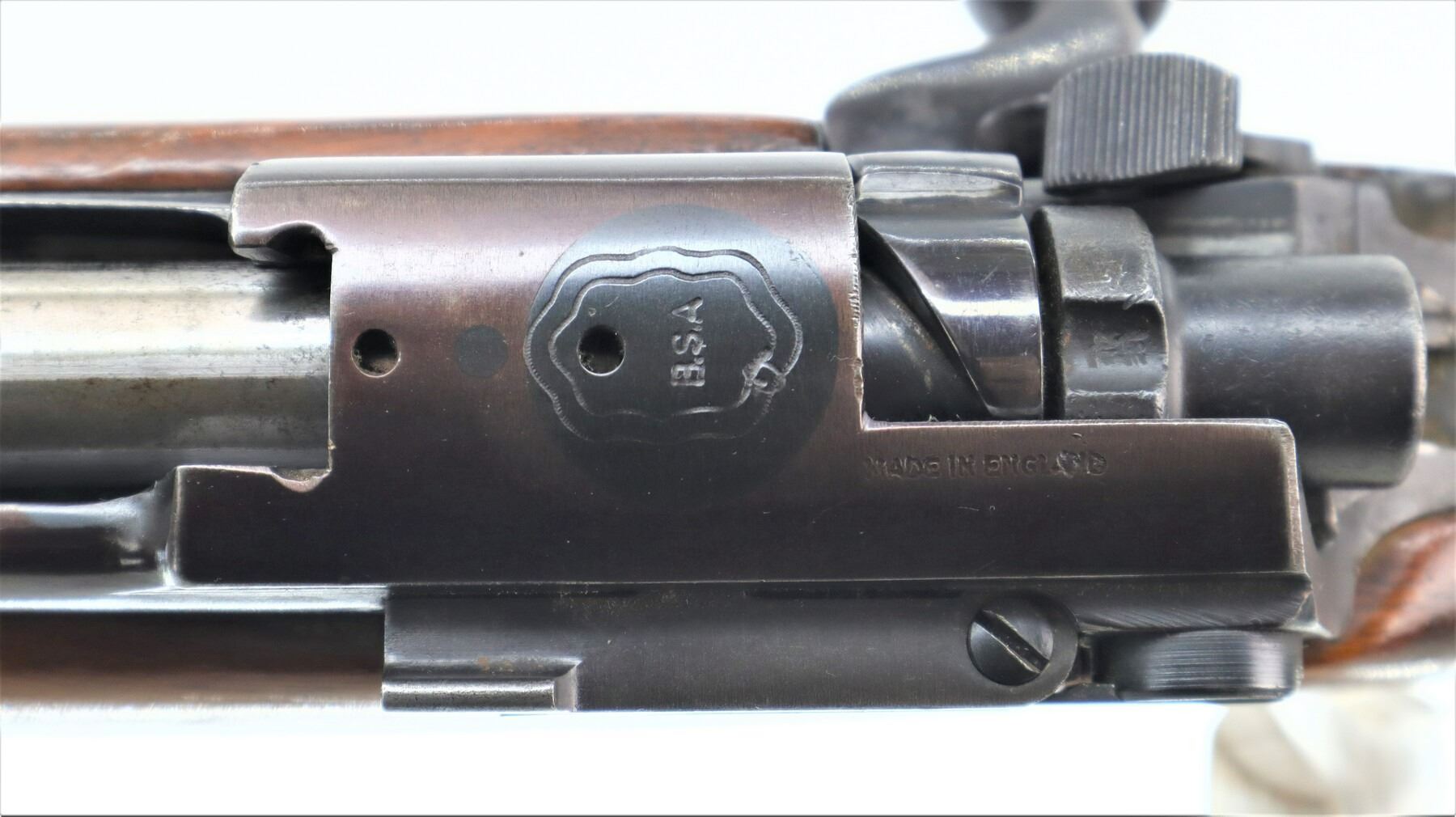 5+/10, BSA ENFIELD, MODEL: P17 SPORTER, CALIBER:30-06 SPRG, BORE IS GOOD. BLADE FRONT SIGHT WITH RAMP, ADJUSTABLE U NOTCHED REAR SIGHT, RECEIVER DRILLED AND TAPPED FOR SCOPE MOUNT, NO PLUG SCREWS. COCKING PIECE LACKS TENSION TURNS SOMETIMES REQUIRES ADJUSTMENT. ONE PIECE SPORTERIZED WOOD STOCK, FINGER GROOVED FOREND, CHECKERED PISTOL GRIP, SMOOTH STEEL BUTT PLATE WITH TRAP, SLING SWIVELS. METAL FINISH SHOWS SOME SCRATCHES, HANDLING MARKS AND WEAR. STOCKS SHOW SOME MARKS, SCRATCHES AND WEAR. , ACTION: BOLT ACTION RIFLE, BARREL LENGTH: 24", SERIAL # H11325, CONDITION: 5+/10, CLASS: CANADIAN NON RESTRICTED