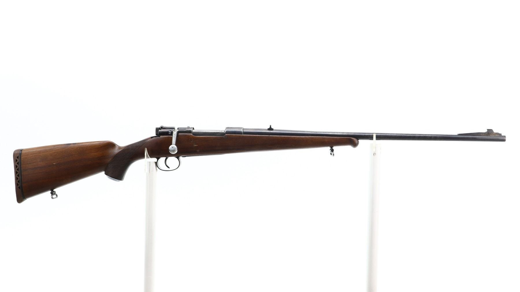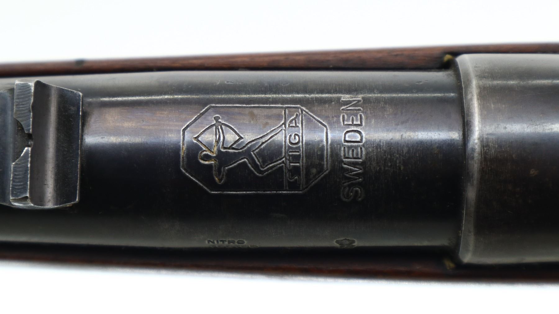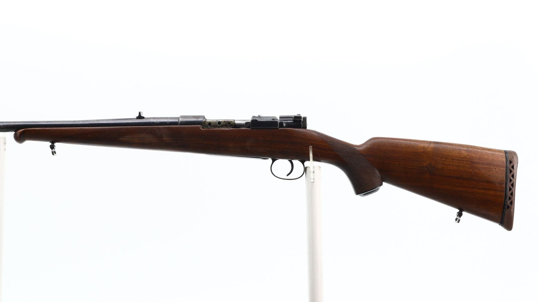 6/10, STIGA, MODEL: M96 SPORTER, CALIBER:30-06 SPRG, BORE IS FAIR, WORN, LIGHT PITTING. BLADE FRONT SIGHT WITH RAMP, U NOTCHED REAR SIGHT, BLUED FINISH, RECEIVER DRILLED AND TAPPED WITH THREE HOLES ON LEFT SIDE, TURNED DOWN BOLT HANDLE WITH FLATTENED KNOB. ONE PIECE WOOD STOCK, CHECKERED PISTOL GRIP, BROWN VENTED RUBBER RECOIL PAD, GRIP CAP, SLING SWIVELS. METAL FINISH SHOWS SCRATCHES, HANDLING MARKS AND WEAR. STOCKS SHOW SOME MARKS, SCRATCHES AND WEAR. , ACTION: BOLT ACTION RIFLE, BARREL LENGTH: 23.5", SERIAL # 160, CONDITION: 6/10, CLASS: CANADIAN NON RESTRICTED