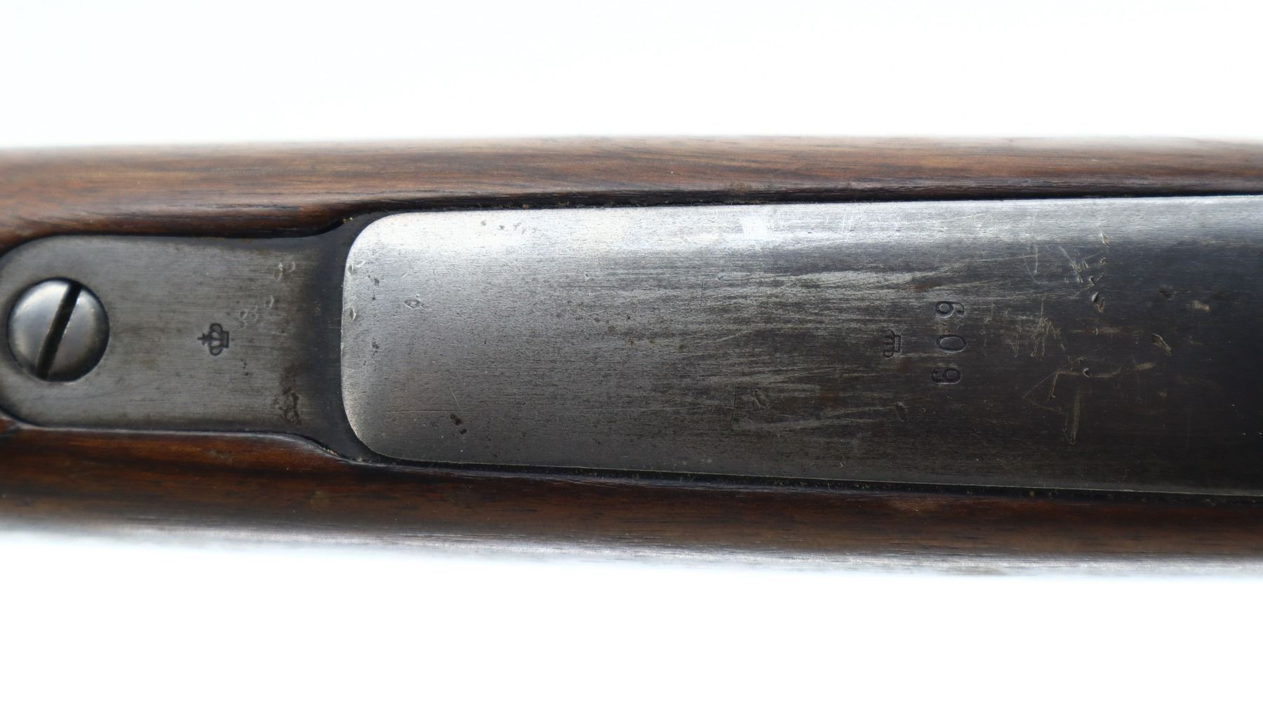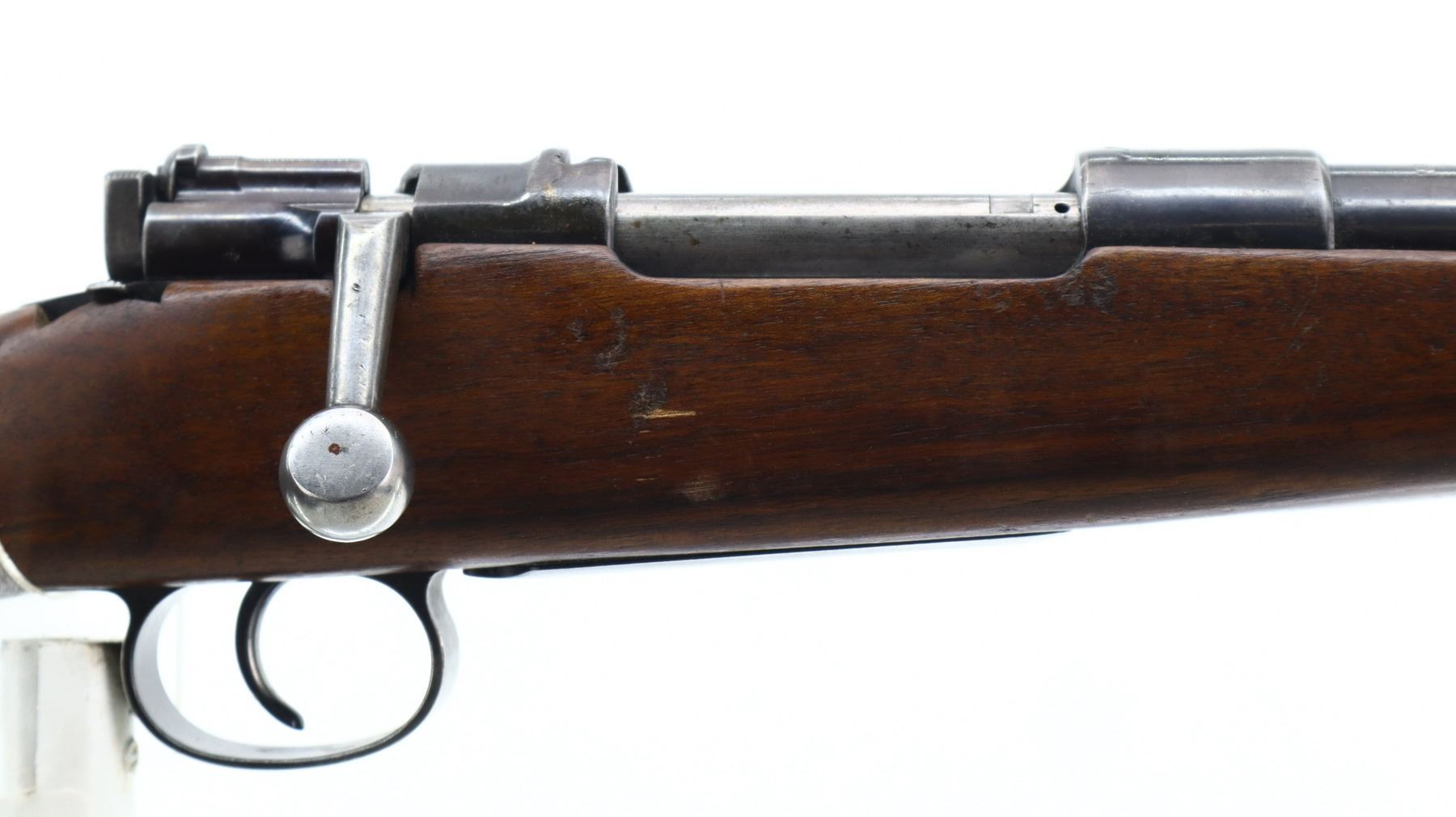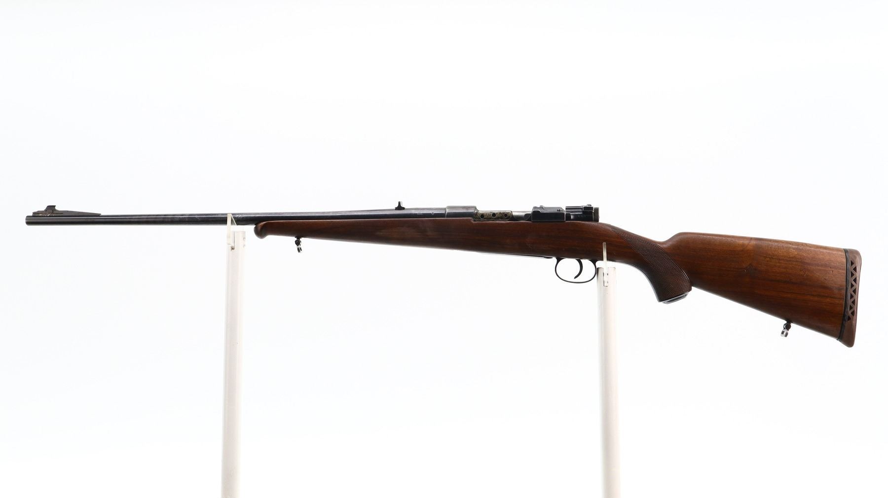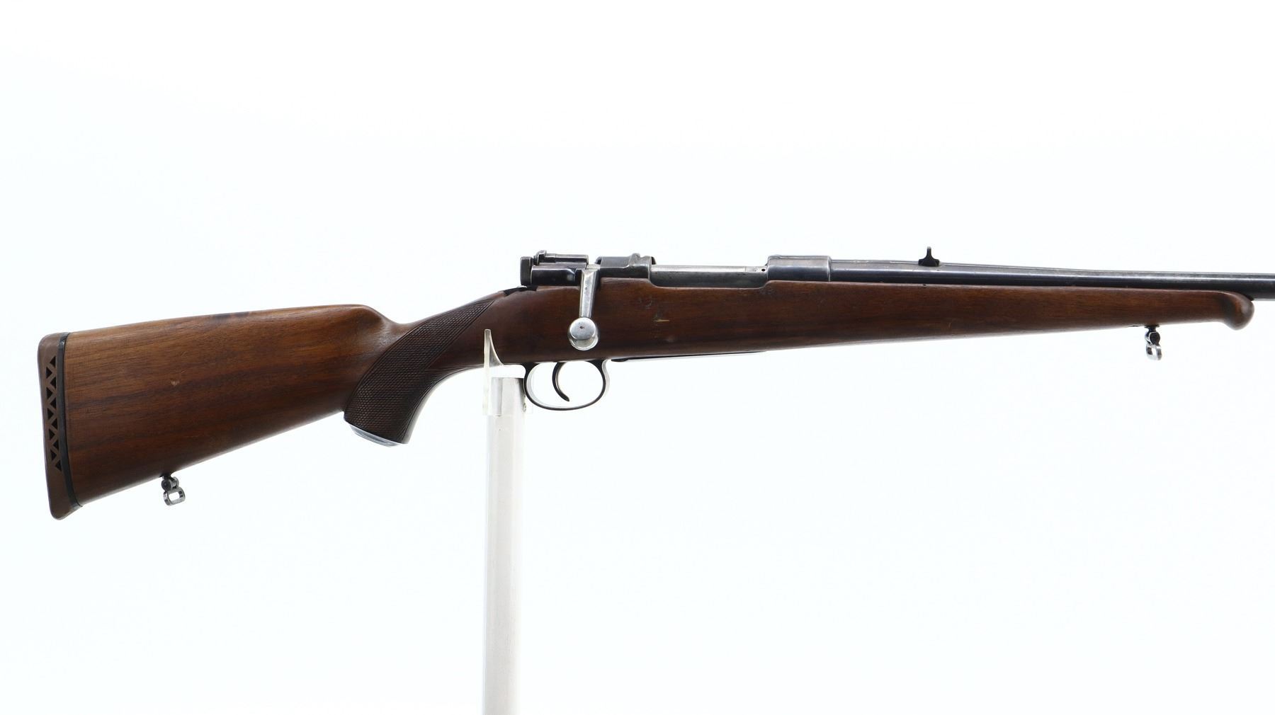 6/10, STIGA, MODEL: M96 SPORTER, CALIBER:30-06 SPRG, BORE IS FAIR, WORN, LIGHT PITTING. BLADE FRONT SIGHT WITH RAMP, U NOTCHED REAR SIGHT, BLUED FINISH, RECEIVER DRILLED AND TAPPED WITH THREE HOLES ON LEFT SIDE, TURNED DOWN BOLT HANDLE WITH FLATTENED KNOB. ONE PIECE WOOD STOCK, CHECKERED PISTOL GRIP, BROWN VENTED RUBBER RECOIL PAD, GRIP CAP, SLING SWIVELS. METAL FINISH SHOWS SCRATCHES, HANDLING MARKS AND WEAR. STOCKS SHOW SOME MARKS, SCRATCHES AND WEAR. , ACTION: BOLT ACTION RIFLE, BARREL LENGTH: 23.5", SERIAL # 160, CONDITION: 6/10, CLASS: CANADIAN NON RESTRICTED