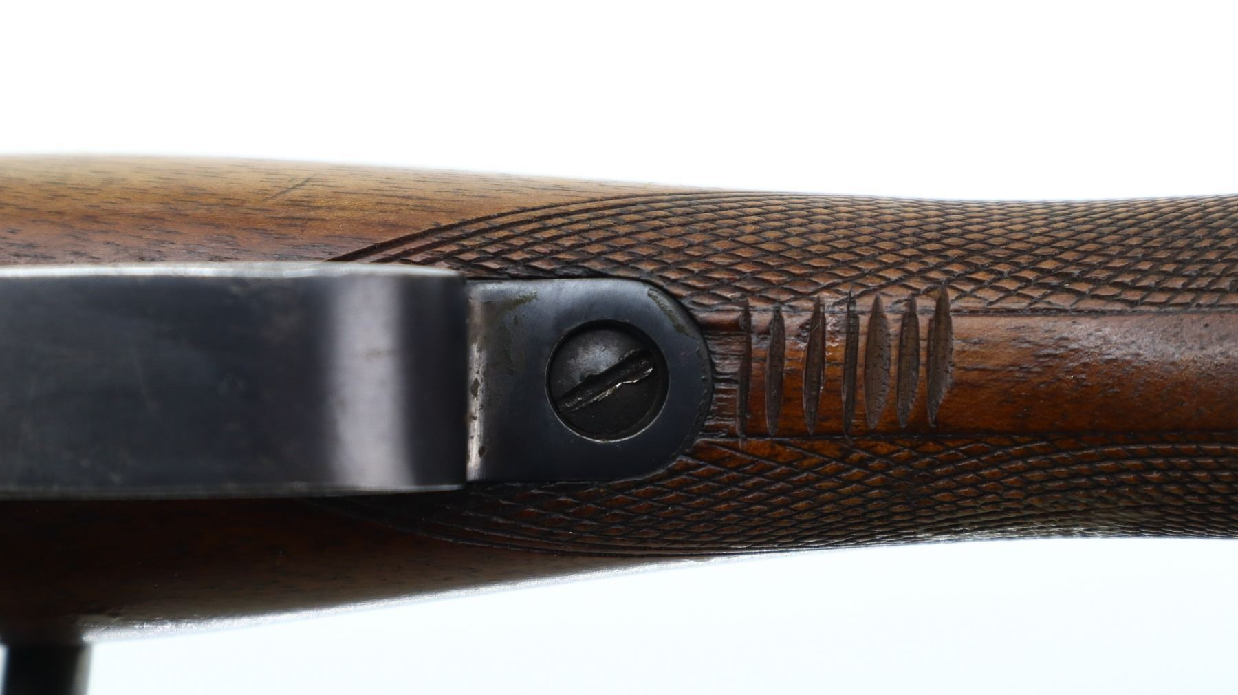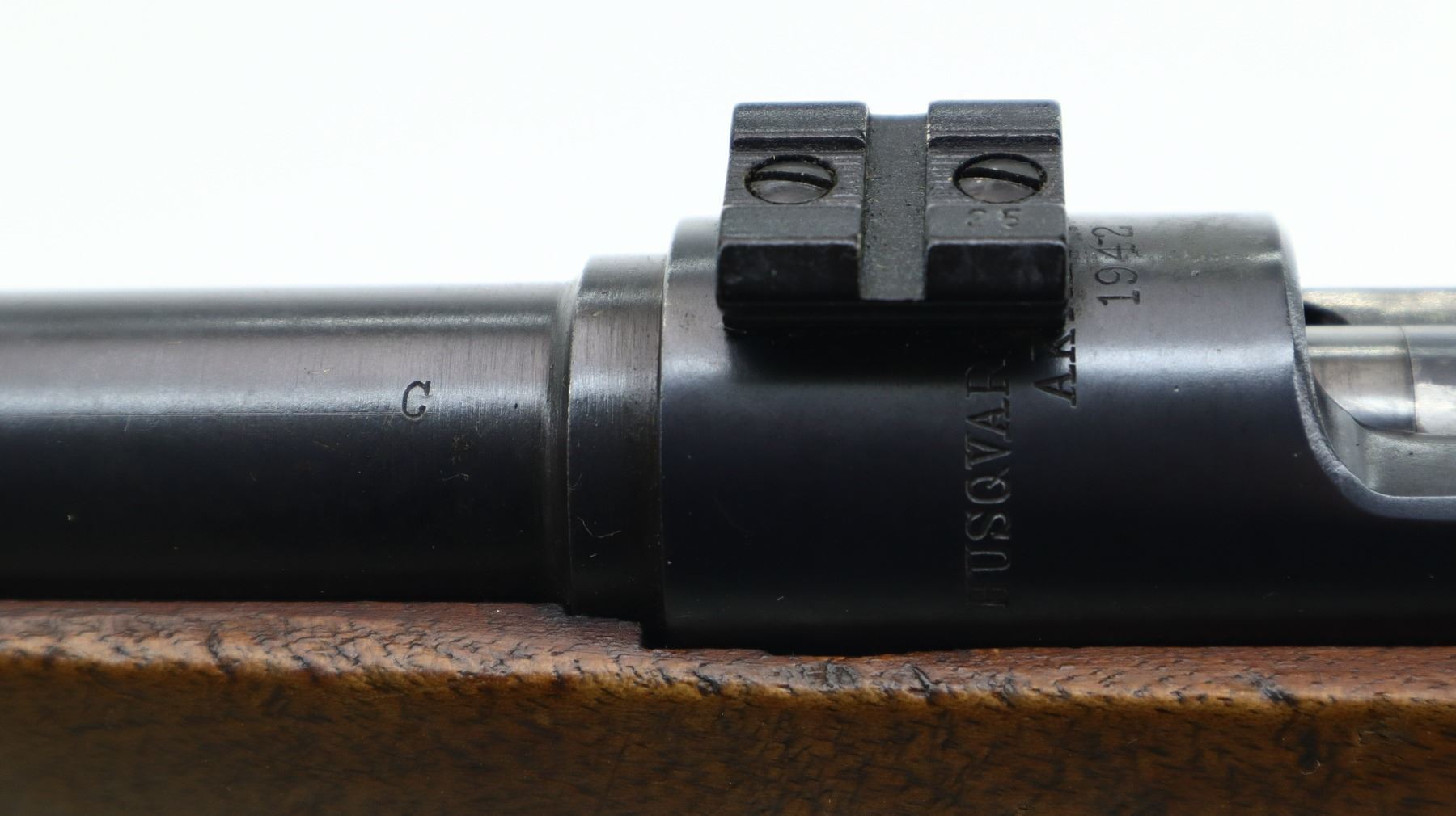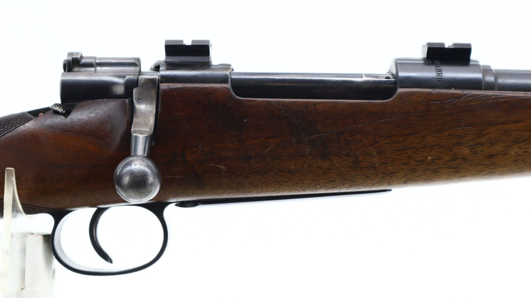 6/10, SWEDISH MAUSER, MODEL: SMALL RING SPORTER, CALIBER:8 X 57, BORE IS GOOD. MANUFACTURED BY HUSQVARNA 1942, MISSING FRONT SIGHT BLADE BASE IS PRESENT, U NOTCHED REAR SIGHT, BLUED FINISH, RECEIVER DRILLED AND TAPPED WITH TWO PIECE SCOPE BASES INSTALLED, MODIFIED BOLT HANDLE. ONE PIECE WOOD STOCK, CHECKERED PISTOL GRIP, ADDED ON COMB, BROWN VENTED RUBBER RECOIL PAD, GRIP CAP, REAR SWIVEL FRONT STUD. METAL FINISH SHOWS SOME SCRATCHES, HANDLING MARKS AND WEAR. STOCK SHOWS SOME MARKS, SCRATCHES AND WEAR. , ACTION: BOLT ACTION RIFLE, BARREL LENGTH: 26", SERIAL # NA, CONDITION: 6/10, CLASS: CANADIAN NON RESTRICTED