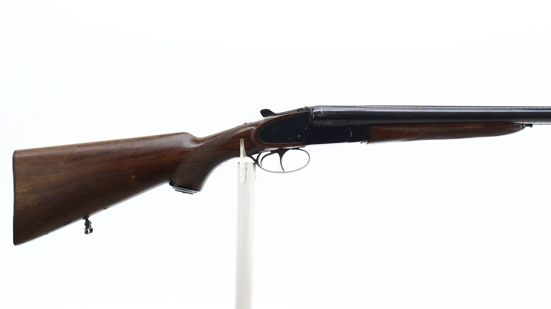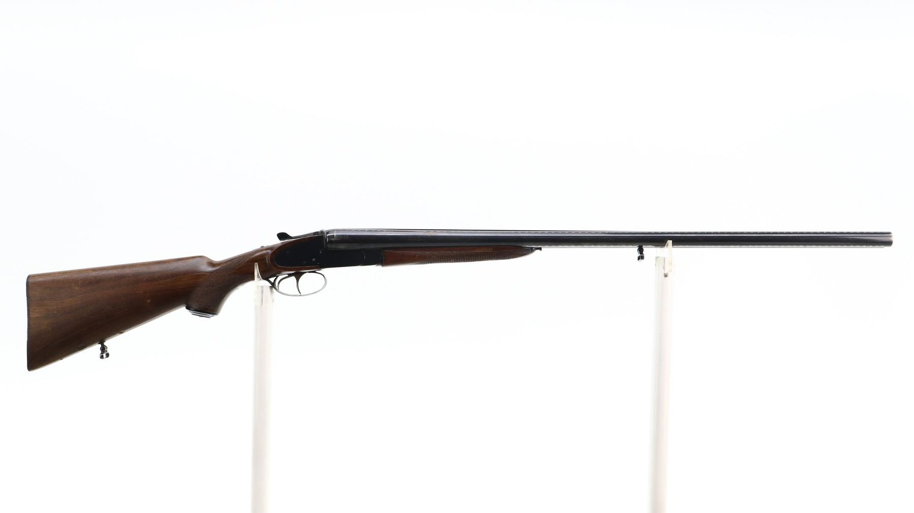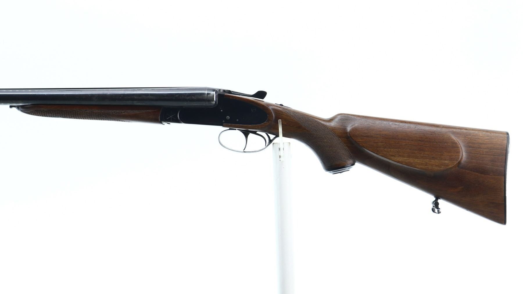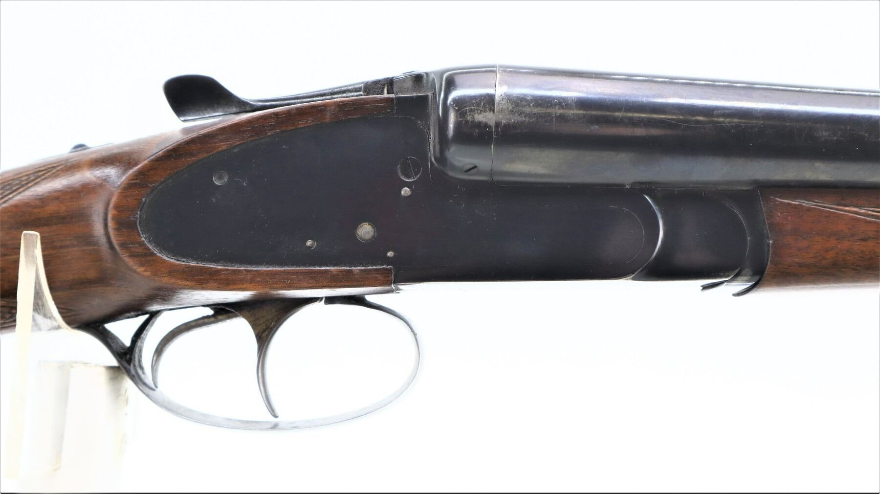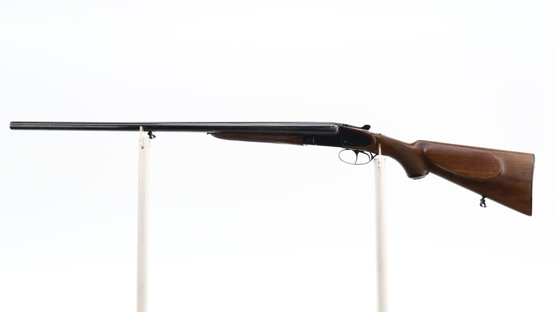 5+/10, BRNO, MODEL: SIDE BY SIDE, CALIBER:12 G X 2 3/4", BORES ARE GOOD. FIXED IM AND MOD CHOKES. BRASS BEAD, BLUED FINISH, RAISED RIB, SIDE LOCKS, SAFETY SEIZED (POSSIBLY OLD OIL AND GREASE), HAS EXTRACTOR, DOUBLE TRIGGERS. TWO PIECE WOOD STOCKS, CHECKERED FOREARM AND PISTOL GRIP, CHEEK REST, GROOVED BLACK POLYMER BUTT PLATE, GRIP CAP, SLING SWIVELS. NOTE: FOREARM LUG ON BARREL HAS BEEN REPAIRED. METAL FINISH SHOWS SOME SCRATCHES, HANDLING MARKS AND WEAR. STOCKS SHOW SOME MARKS, SCRATCHES AND WEAR. , ACTION: HINGED SIDE BY SIDE SHOTGUN, BARREL LENGTH: 28.25", SERIAL # 71705, CONDITION: 5+/10, CLASS: CANADIAN NON RESTRICTED