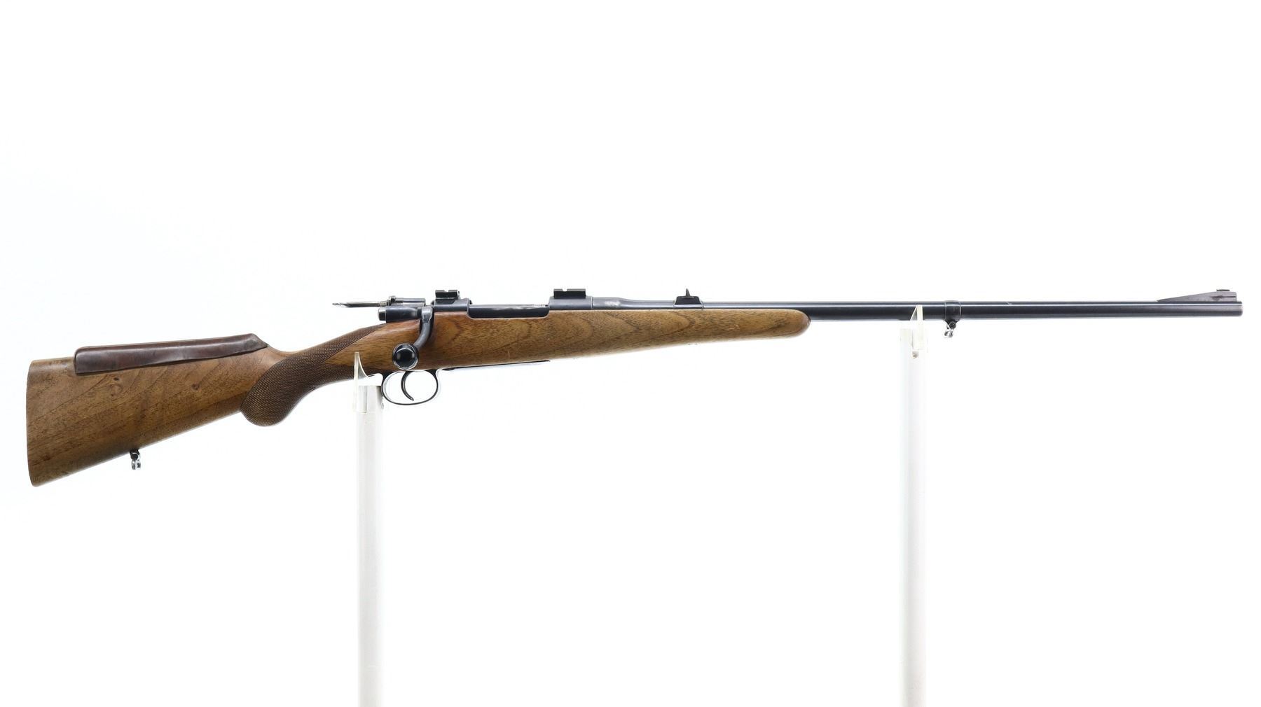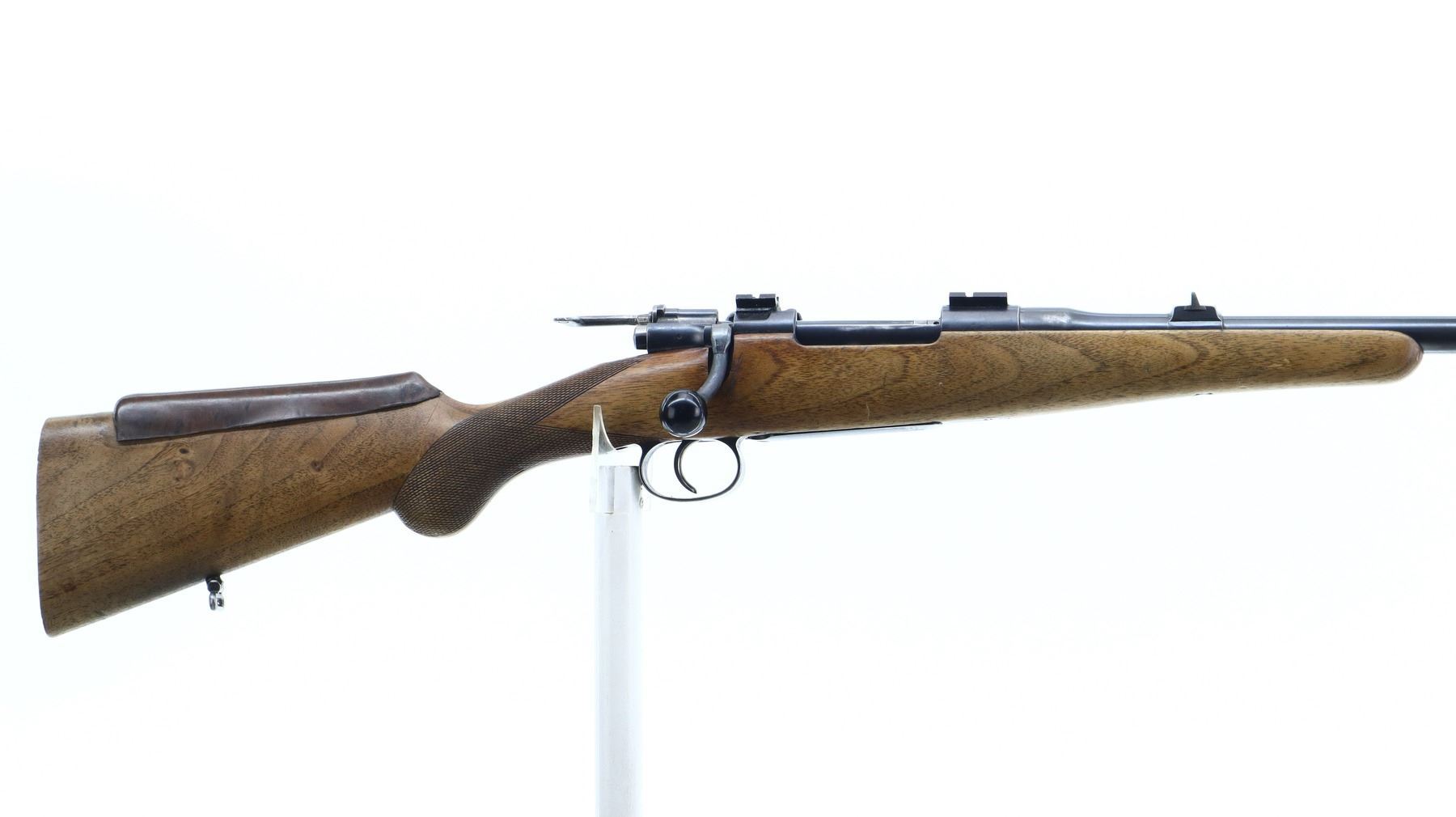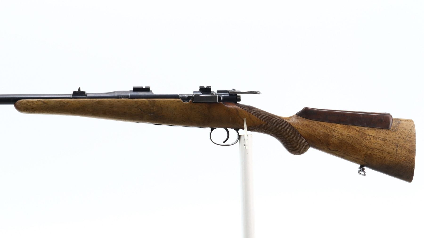 5+/10, HUSQVARNA, MODEL: M96 SPORTER, CALIBER:9.3 X 57, BORE IS FAIR, WORN, LIGHT PITTING. BLADE FRONT SIGHT WITH RAMP, U NOTCHED REAR SIGHT, BLUED FINISH, RECEIVER DRILLED AND TAPPED WITH TWO PIECE SCOPE BASES INSTALLED, BLACK POLYMER BOLT KNOB WHICH IS LOOSE ON HANDLE, CUSTOM EXTENDED SAFETY LEVER. ONE PIECE WOOD STOCK, CHECKERED PISTOL GRIP, ADDED ON BROWN RUBBER COMB, MISSING BUTT PLATE. HAS SLING SWIVELS. METAL FINISH SHOWS SOME SCRATCHES, HANDLING MARKS AND WEAR. STOCK SHOWS SOME MARKS, SCRATCHES AND WEAR. , ACTION: BOLT ACTION RIFLE, BARREL LENGTH: 24.5", SERIAL # 8311, CONDITION: 5+/10, CLASS: CANADIAN NON RESTRICTED