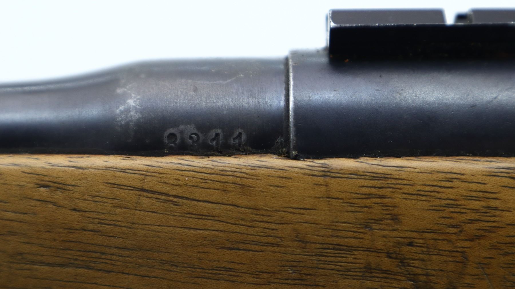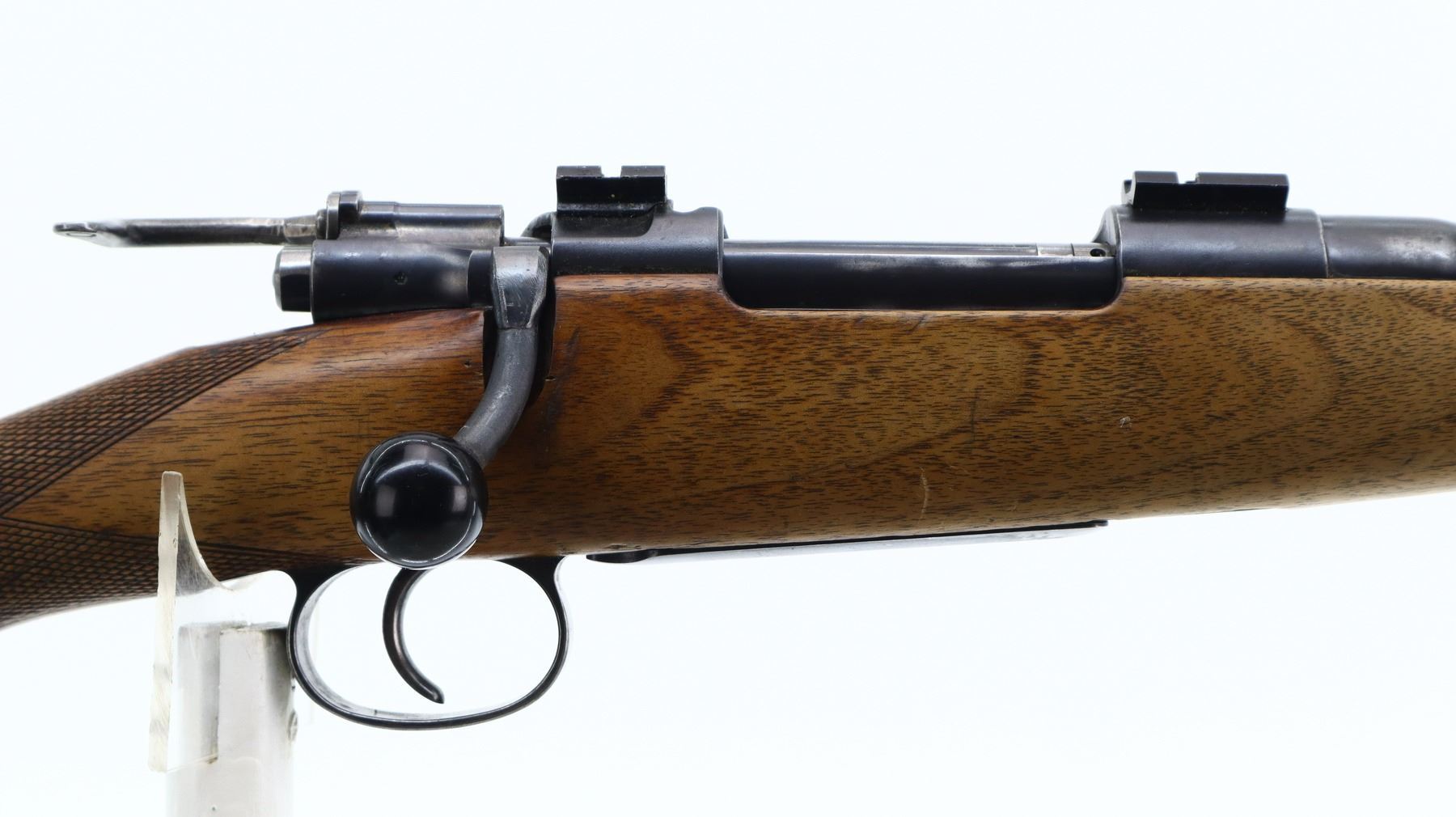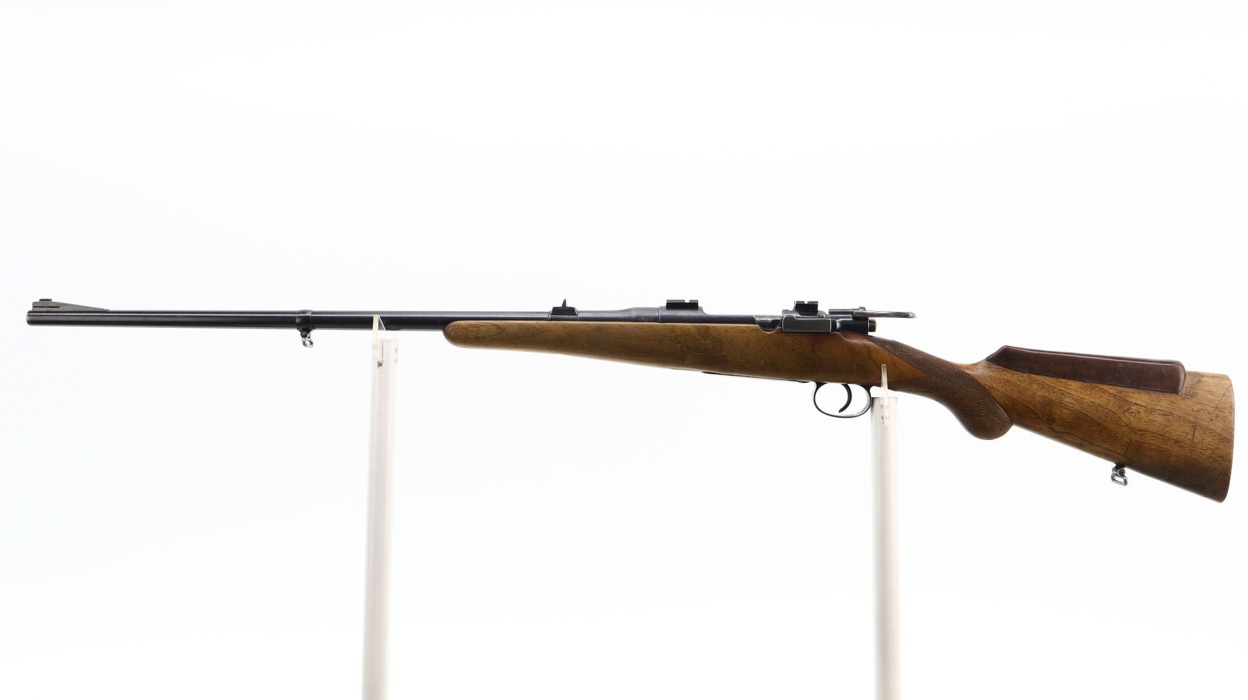 5+/10, HUSQVARNA, MODEL: M96 SPORTER, CALIBER:9.3 X 57, BORE IS FAIR, WORN, LIGHT PITTING. BLADE FRONT SIGHT WITH RAMP, U NOTCHED REAR SIGHT, BLUED FINISH, RECEIVER DRILLED AND TAPPED WITH TWO PIECE SCOPE BASES INSTALLED, BLACK POLYMER BOLT KNOB WHICH IS LOOSE ON HANDLE, CUSTOM EXTENDED SAFETY LEVER. ONE PIECE WOOD STOCK, CHECKERED PISTOL GRIP, ADDED ON BROWN RUBBER COMB, MISSING BUTT PLATE. HAS SLING SWIVELS. METAL FINISH SHOWS SOME SCRATCHES, HANDLING MARKS AND WEAR. STOCK SHOWS SOME MARKS, SCRATCHES AND WEAR. , ACTION: BOLT ACTION RIFLE, BARREL LENGTH: 24.5", SERIAL # 8311, CONDITION: 5+/10, CLASS: CANADIAN NON RESTRICTED