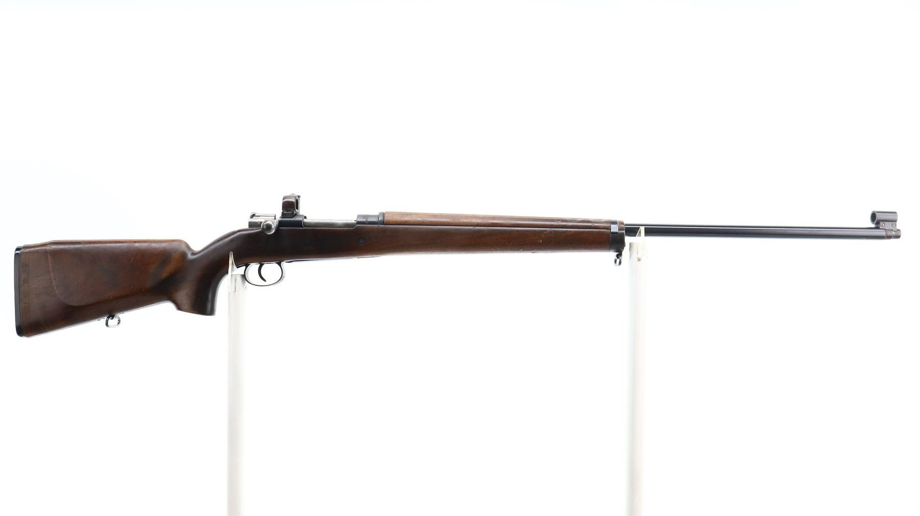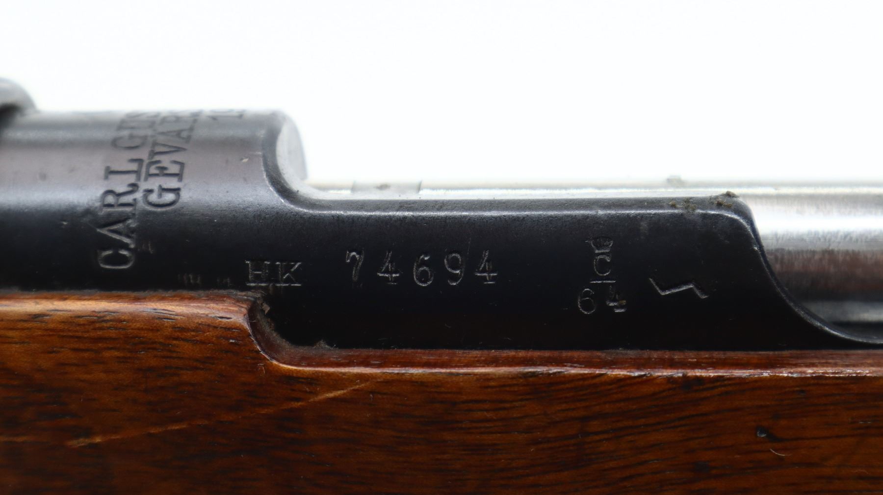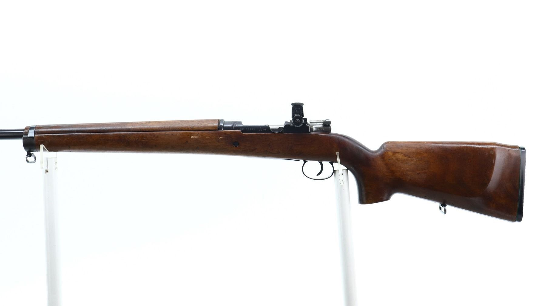 7/10, SWEDISH MAUSER, MODEL: CG63 TARGET, CALIBER:6.5 X 55, BORE IS GOOD, SLIGHT WEAR. MANUFACTURED BY CARL GUSTAF 1916, BOLT MATCHES. GLOBE FRONT SIGHT WITH INSERT, ADJUSTABLE PEEP SIGHT ON RECEIVER, HEAVY BARREL, SILVER BOLT WITH MODIFIED HANDLE. TWO PIECE TARGET STYLE WOOD STOCKS, PISTOL GRIP, AMBI CHEEK REST, GROOVED BLACK POLYMER BUTT PLATE, SLING SWIVELS. METAL FINISH SHOWS SCRATCHES, HANDLING MARKS AND WEAR. STOCKS SHOW MARKS, SCRATCHES AND WEAR. , ACTION: BOLT ACTION RIFLE, BARREL LENGTH: 29.5", SERIAL # 74694, CONDITION: 7/10, CLASS: CANADIAN NON RESTRICTED