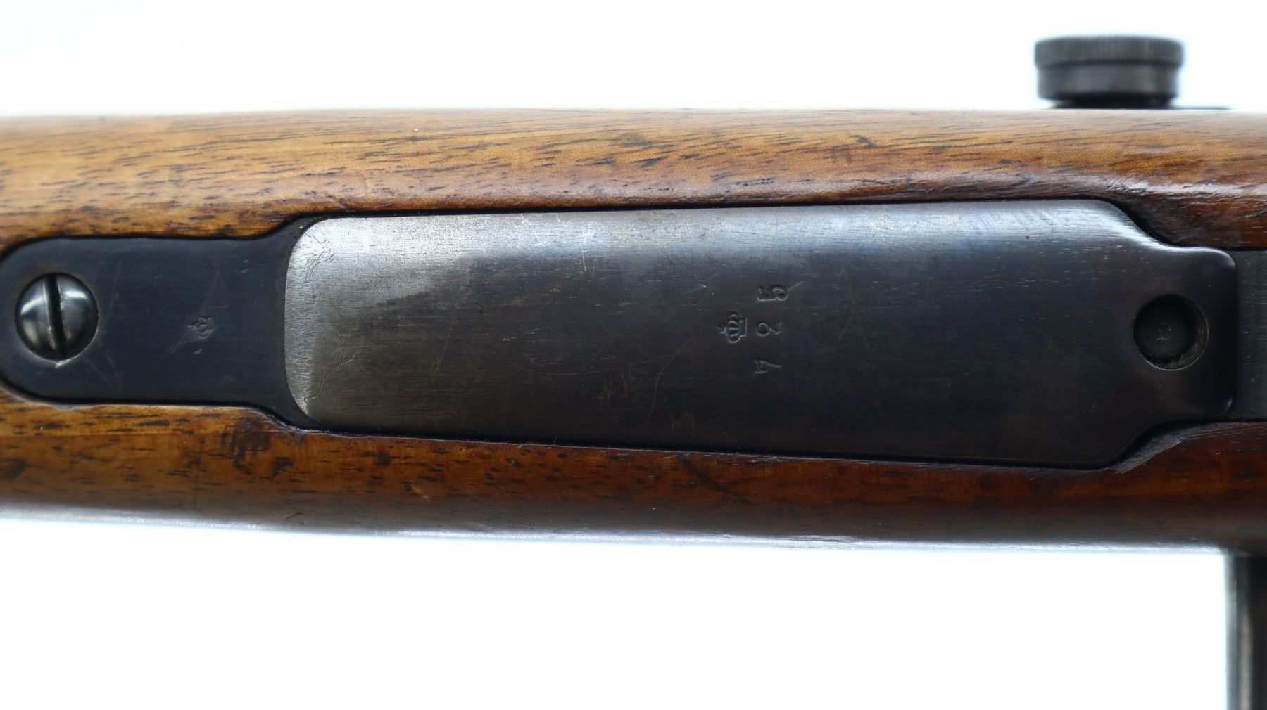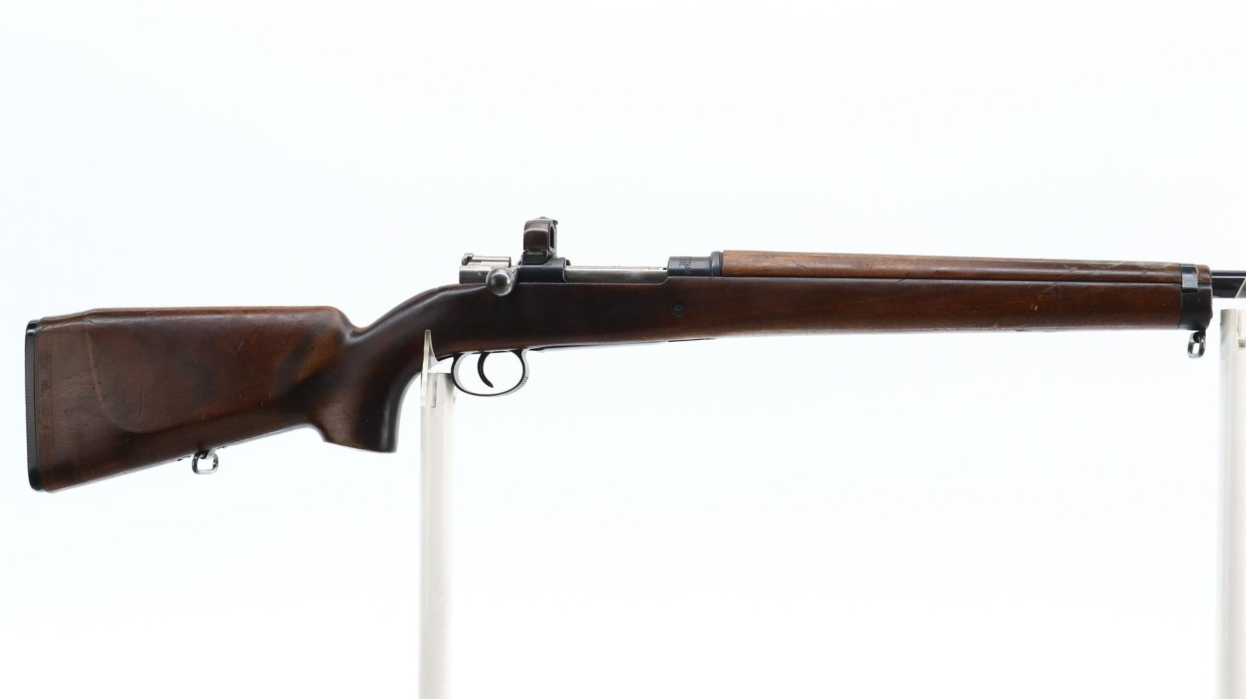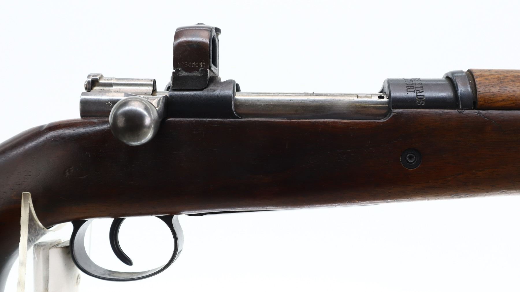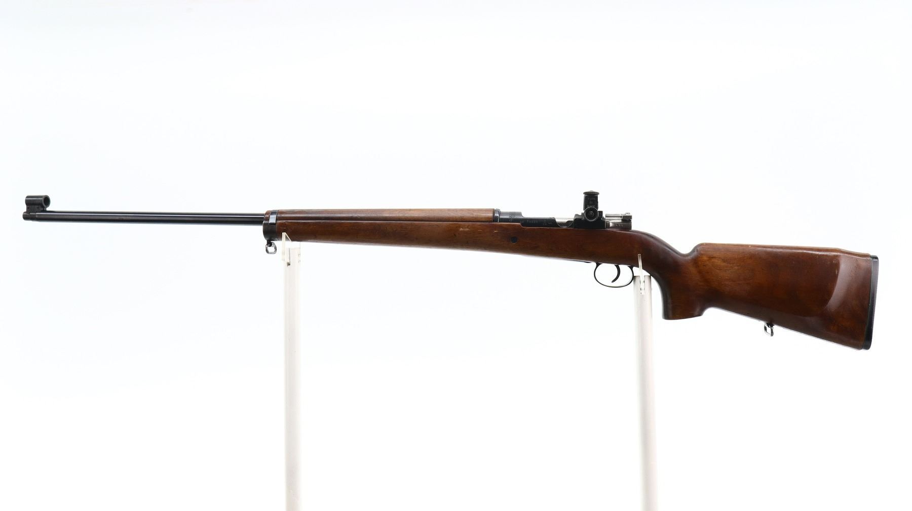 7/10, SWEDISH MAUSER, MODEL: CG63 TARGET, CALIBER:6.5 X 55, BORE IS GOOD, SLIGHT WEAR. MANUFACTURED BY CARL GUSTAF 1916, BOLT MATCHES. GLOBE FRONT SIGHT WITH INSERT, ADJUSTABLE PEEP SIGHT ON RECEIVER, HEAVY BARREL, SILVER BOLT WITH MODIFIED HANDLE. TWO PIECE TARGET STYLE WOOD STOCKS, PISTOL GRIP, AMBI CHEEK REST, GROOVED BLACK POLYMER BUTT PLATE, SLING SWIVELS. METAL FINISH SHOWS SCRATCHES, HANDLING MARKS AND WEAR. STOCKS SHOW MARKS, SCRATCHES AND WEAR. , ACTION: BOLT ACTION RIFLE, BARREL LENGTH: 29.5", SERIAL # 74694, CONDITION: 7/10, CLASS: CANADIAN NON RESTRICTED