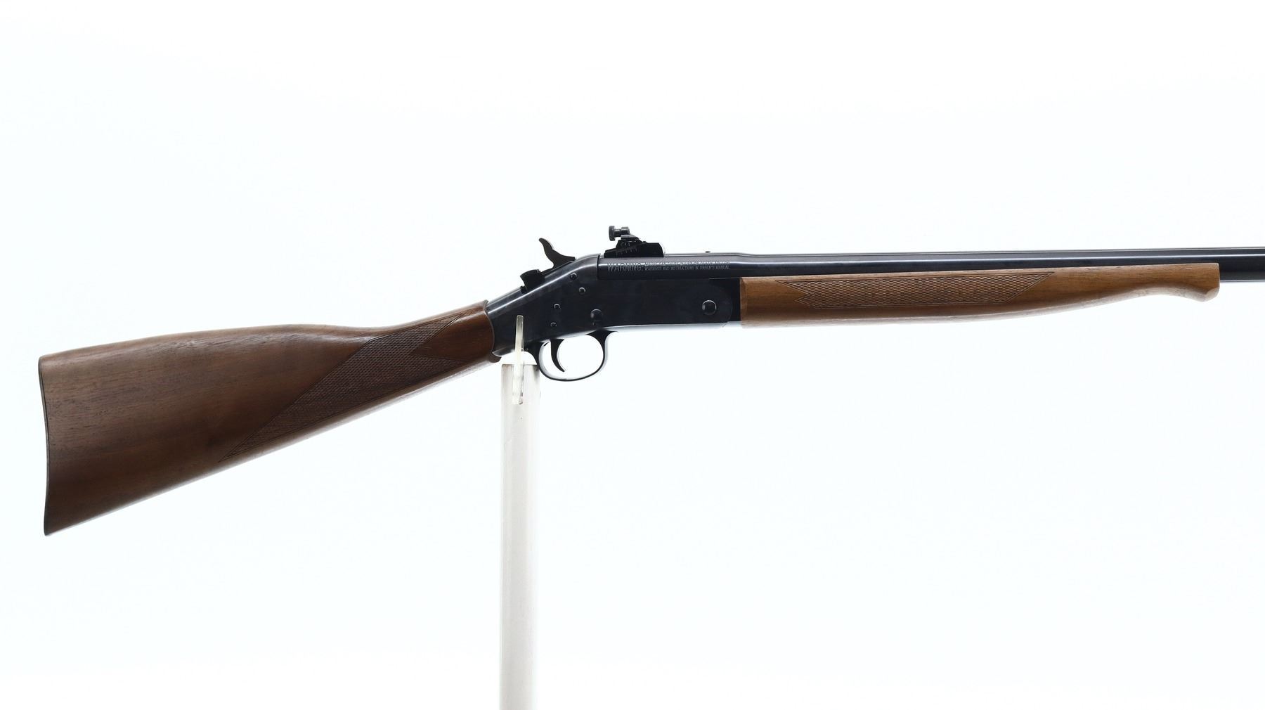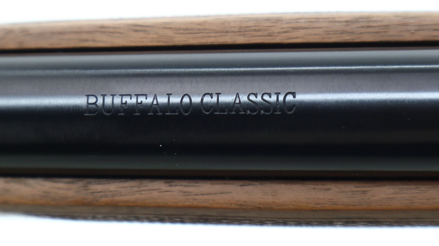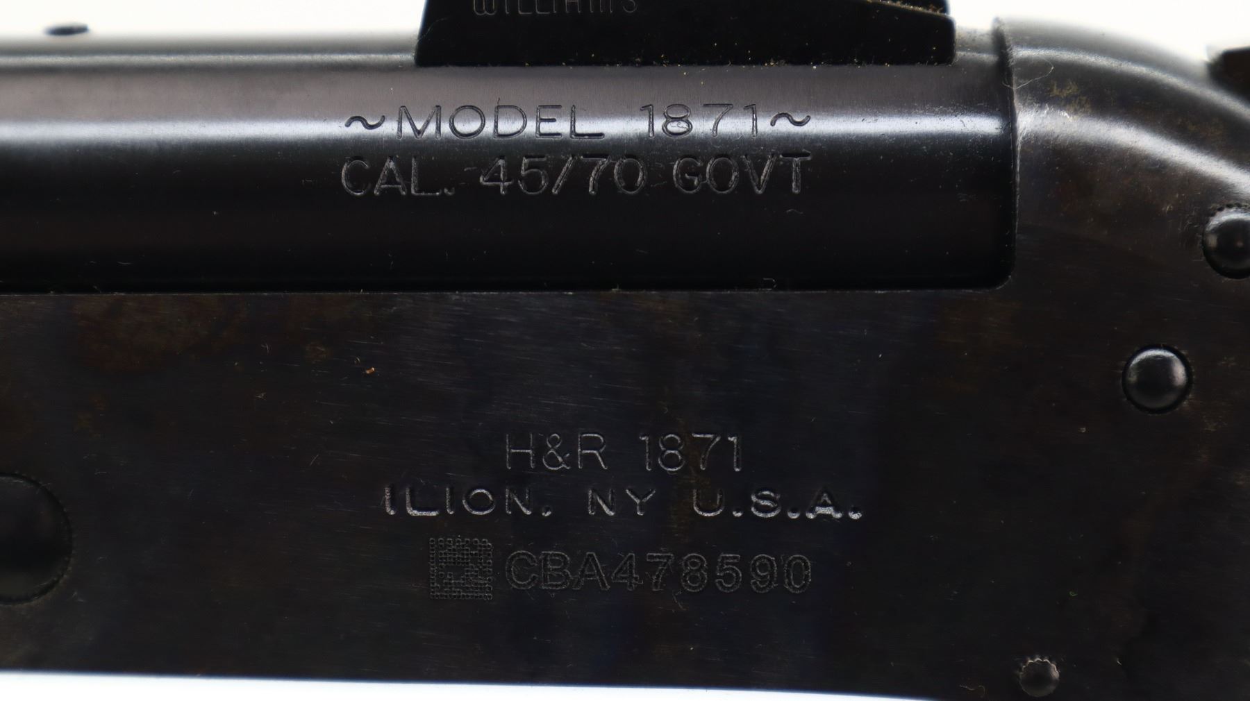 8+/10, HARRINGTON & RICHARDSON, MODEL: BUFFALO CLASSIC 1871, CALIBER:45-70 GOVT, BORE EXCELLENT. GLOBE FRONT SIGHT WITH INSERT, ADJUSTABLE REAR WILLIAMS PEEP SIGHT, BLUED STEEL BARREL, COLOUR CASE HARDENED RECEIVER, SMOOTH BARREL OPENING LEVER, GROOVED HAMMER, EXTRACTOR. TWO PIECE SMOOTH WOOD STOCKS, CHECKERED FOREARM AND STRAIGHT GRIP, SMOOTH CURVED STEEL BUTT PLATE. METAL FINISH SHOWS SOME SCRATCHES AND HANDLING MARKS. STOCKS SHOW SOME SLIGHT MARKS AND SCRATCHES. , ACTION: HINGED SINGLE SHOT RIFLE, BARREL LENGTH: 32", SERIAL # CBA478590, CONDITION: 8+/10, CLASS: CANADIAN NON RESTRICTED