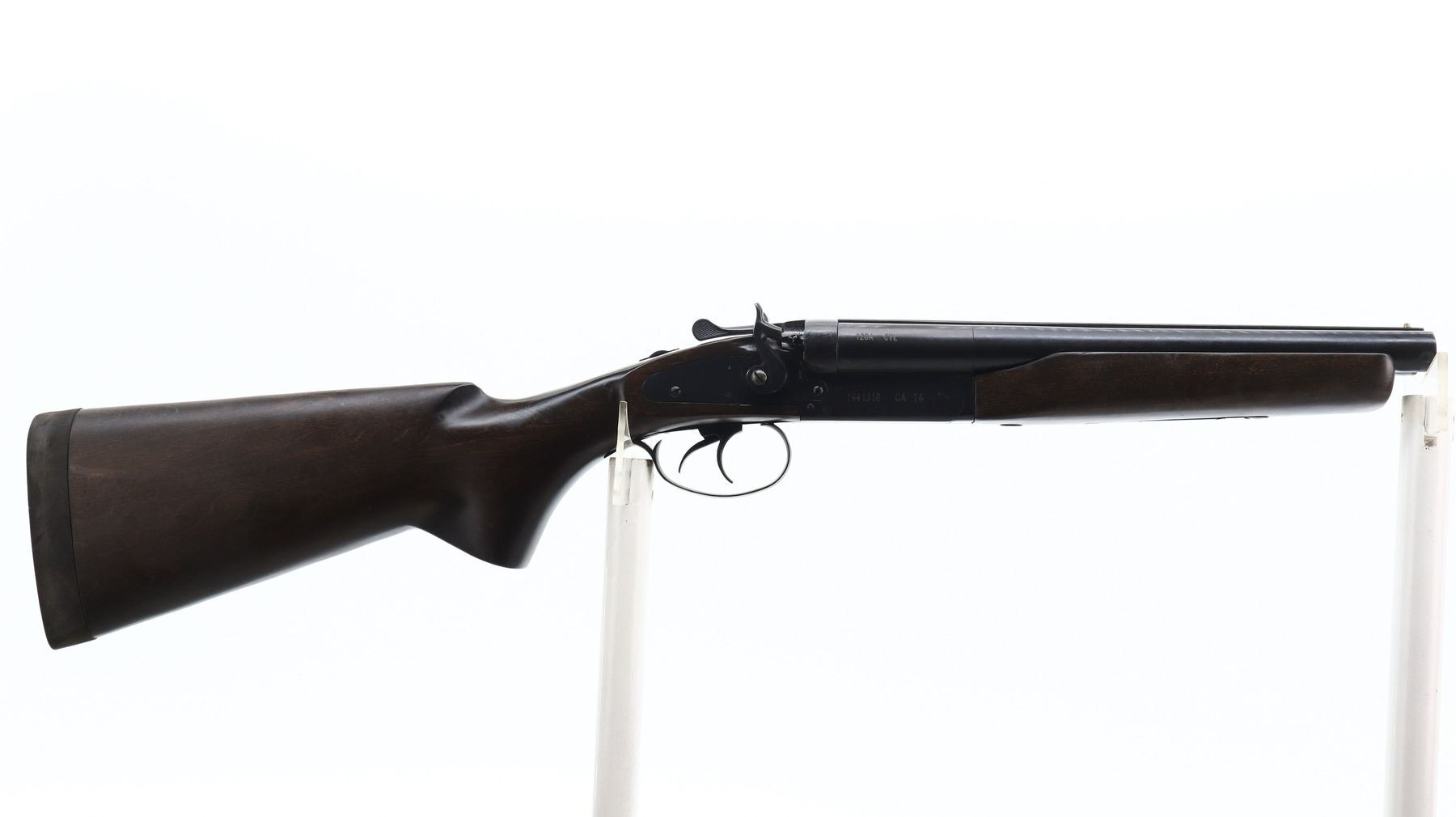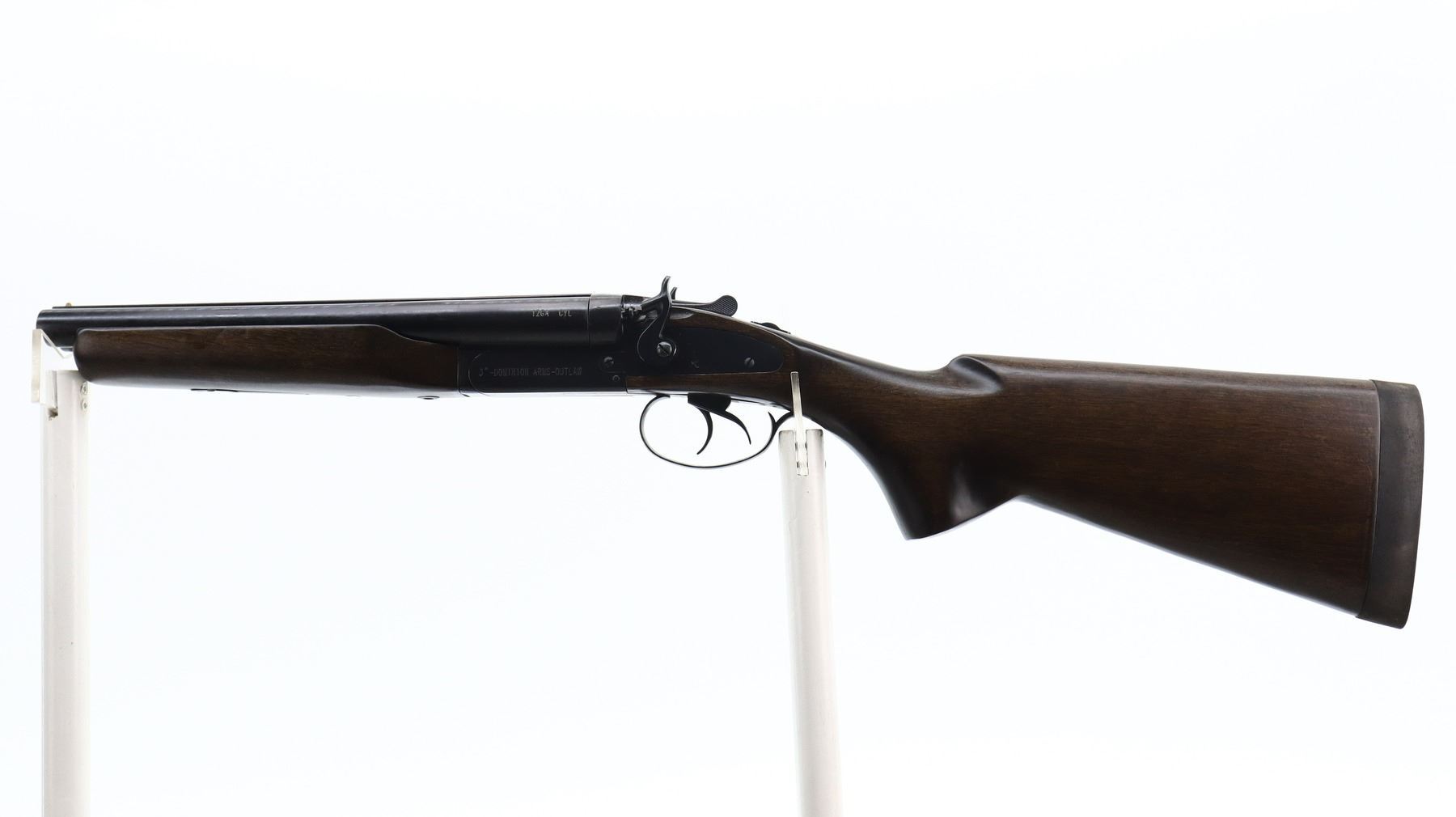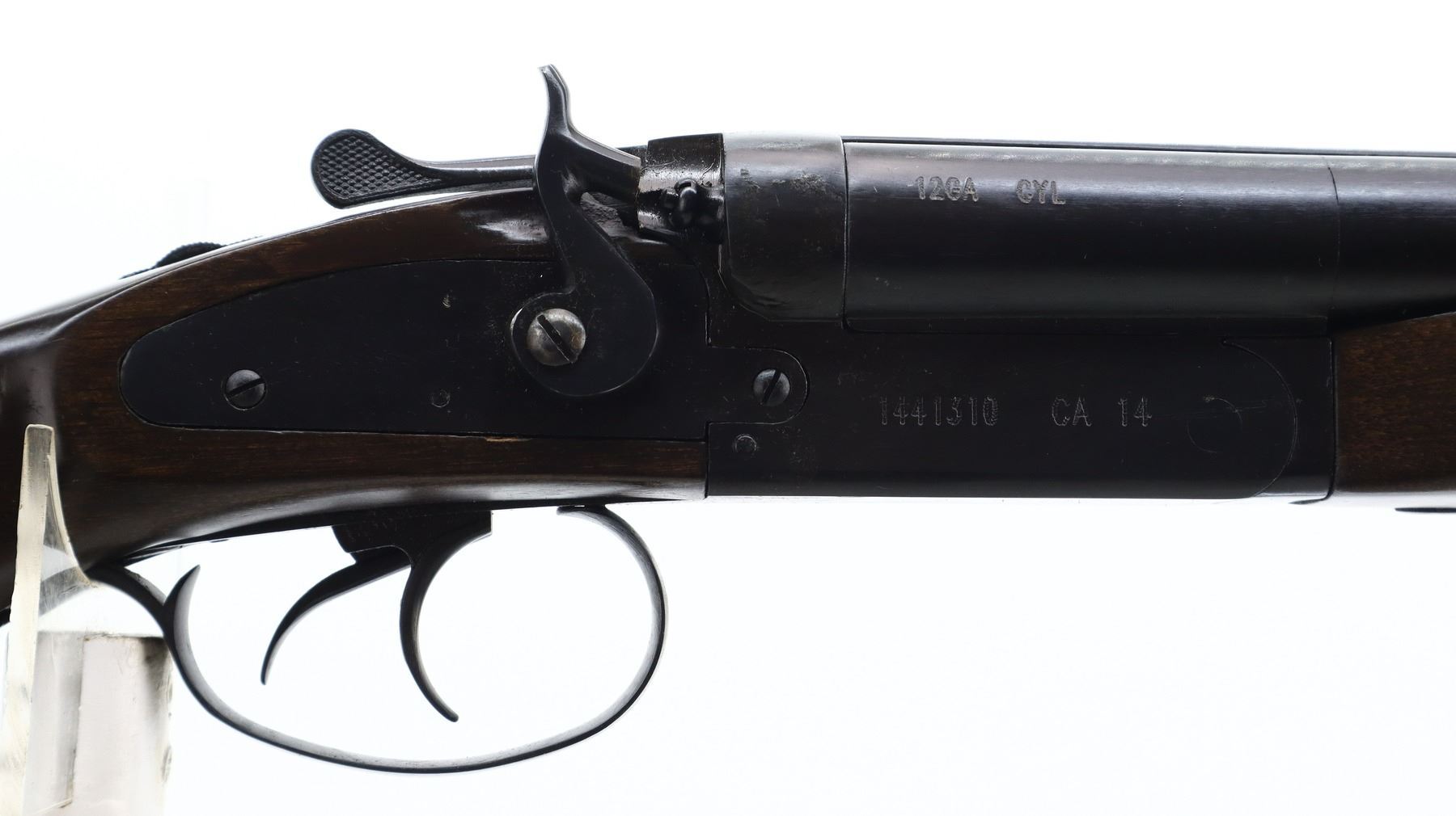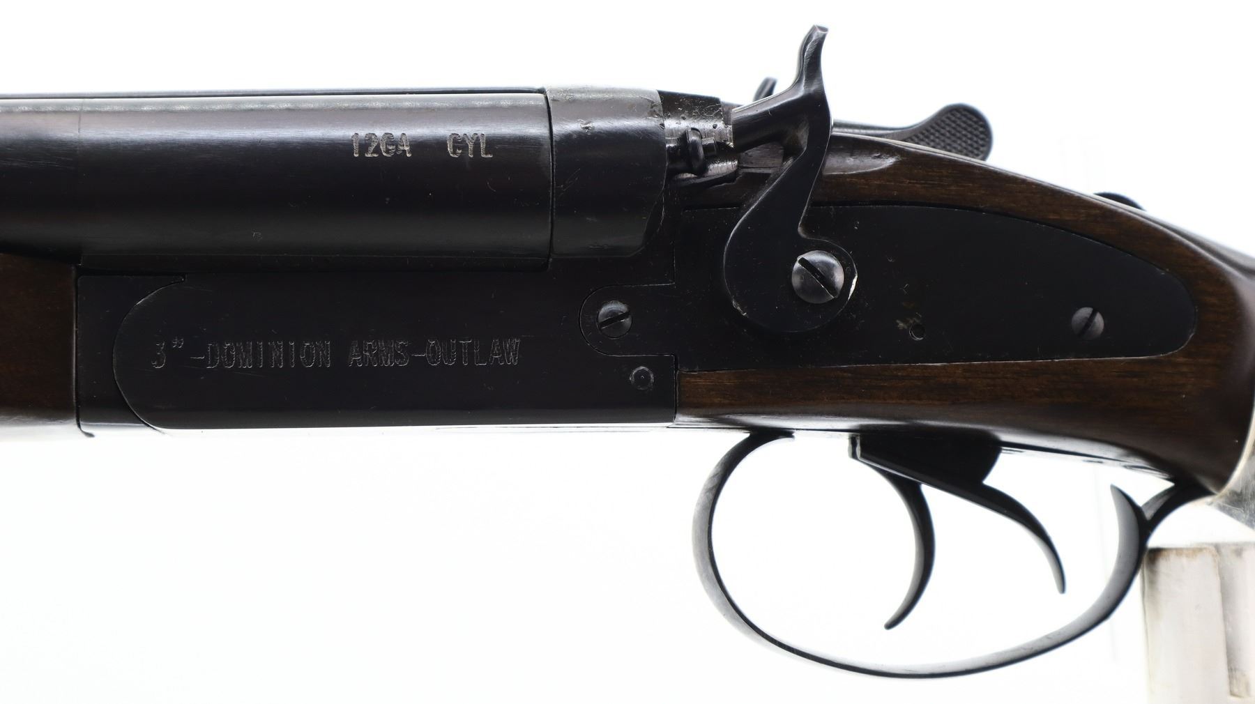 9/10, DOMINION ARMS, MODEL: OUTLAW, CALIBER:12 G X 3", BORES ARE EXCELLENT. FIXED IC CHOKES. BRASS BEAD, RAISED RIB, BLUED FINISH, SIDE PLATES WITH EXTERNAL HAMMERS, MANUAL SAFETY, EXTRACTOR, DOUBLE TRIGGERS. TWO PIECE WOOD STOCKS, SMOOTH BEAVER TAIL FOREARM, PISTOL GRIP, SMOOTH BLACK RUBBER RECOIL PAD. METAL FINISH SHOWS SOME SCRATCHES AND HANDLING MARKS. STOCKS SHOW SOME SLIGHT MARKS AND SCRATCHES. , ACTION: HINGED SIDE BY SIDE SHOTGUN, BARREL LENGTH: 12", SERIAL # 1441310, CONDITION: 9/10, CLASS: CANADIAN NON RESTRICTED