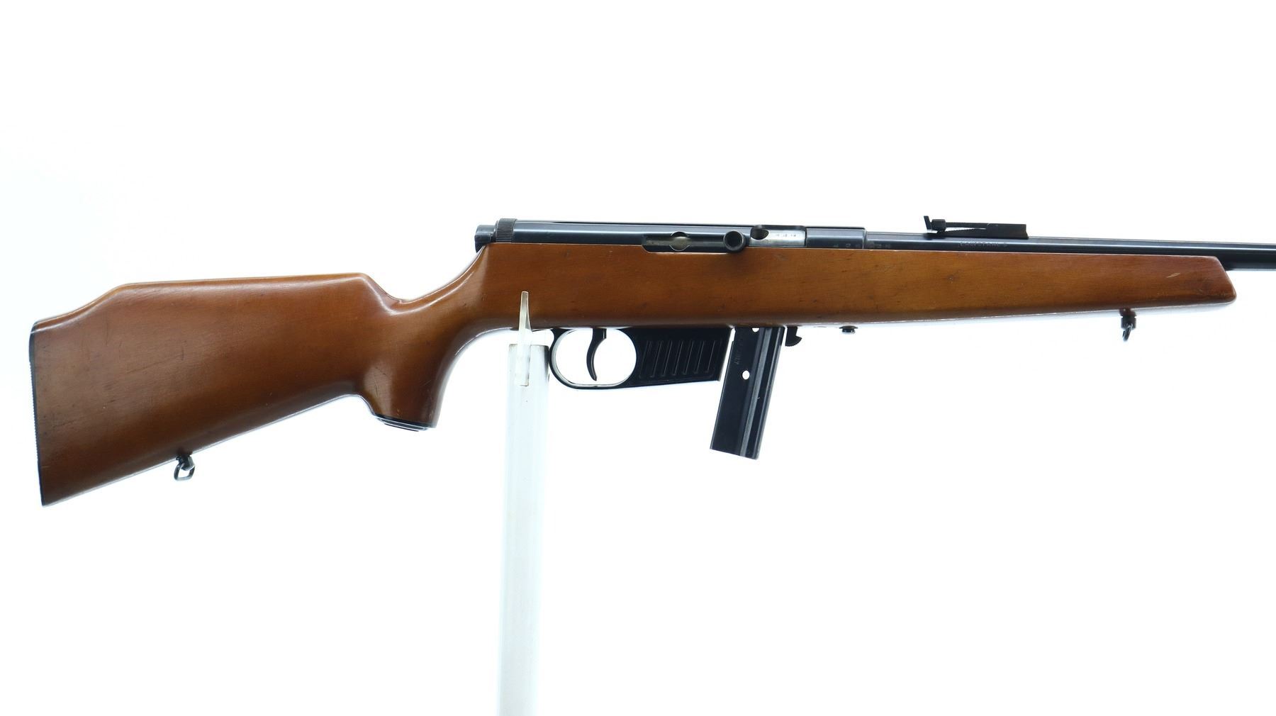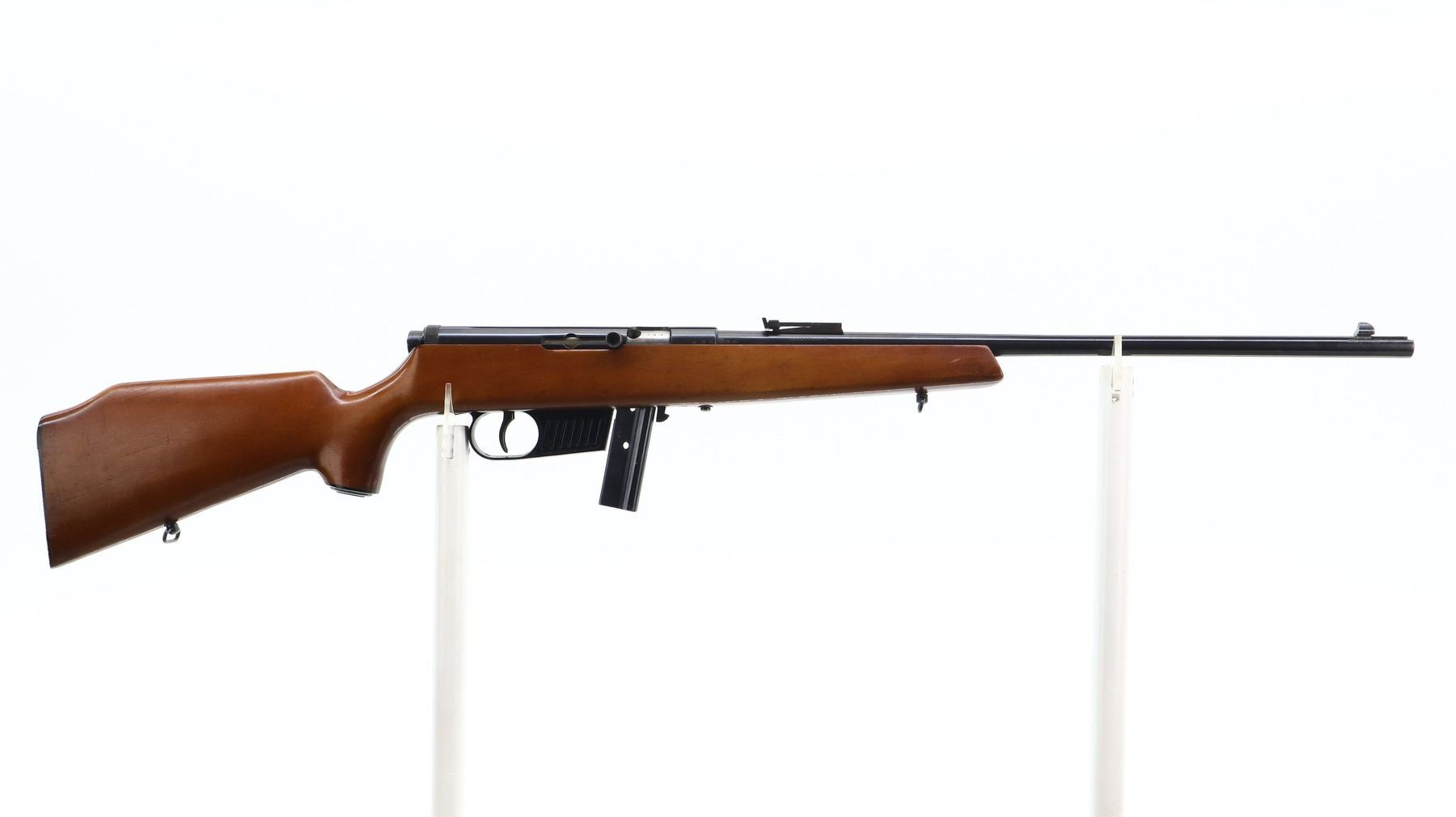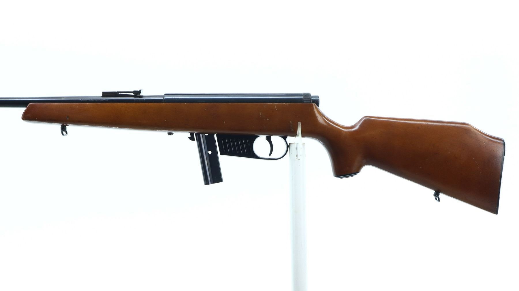 7/10, VOERE, MODEL: SEMI AUTOMATIC, CALIBER:22 LR, COMES WITH MAGAZINE, BORE IS VERY GOOD. BLADE FRONT SIGHT, MISSING RAMP, ADJUSTABLE U NOTCHED REAR SIGHT, BLUED FINISH, GROOVED RECEIVER. ONE PIECE SMOOTH WOOD STOCK, PISTOL GRIP, GROOVED BLACK POLYMER BUTT PLATE, GRIP CAP, SLING SWIVELS. METAL FINISH SHOWS SOME SCRATCHES, HANDLING MARKS AND WEAR. STOCK SHOWS SOME MARKS, SCRATCHES AND WEAR. , ACTION: SEMI AUTOMATIC RIFLE, BARREL LENGTH: 21.25", SERIAL # 164535, CONDITION: 7/10, CLASS: CANADIAN NON RESTRICTED