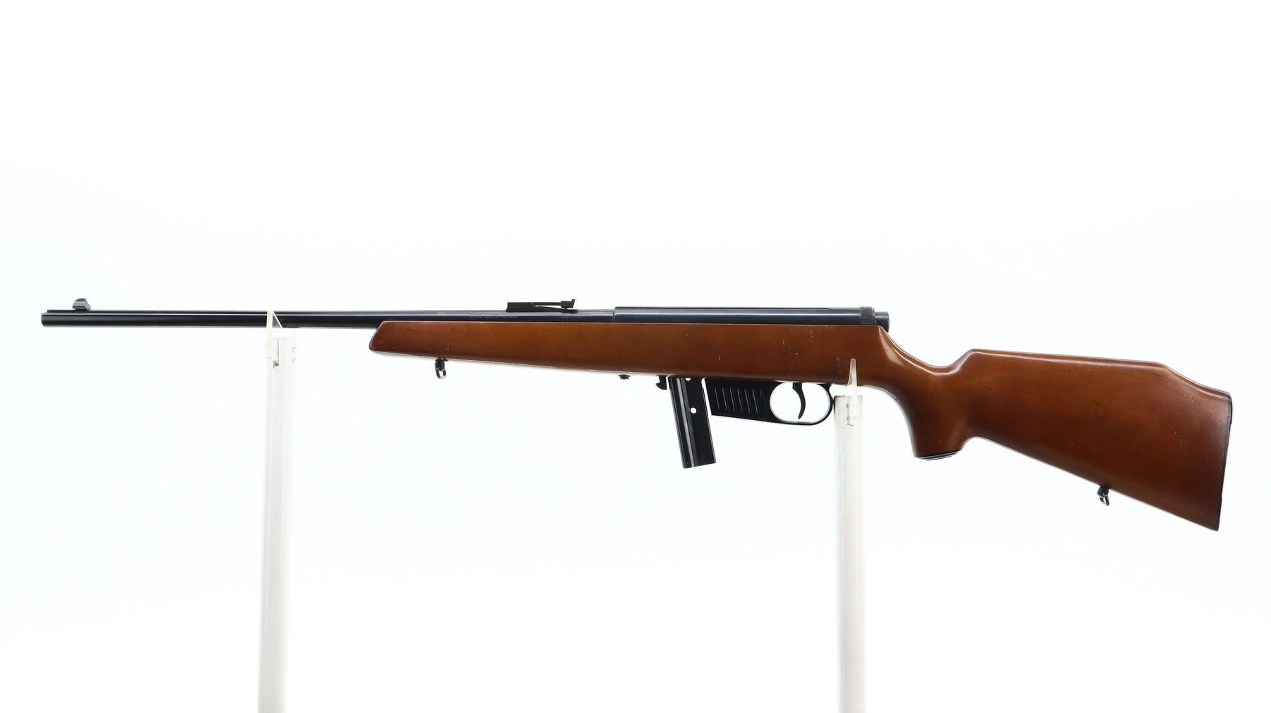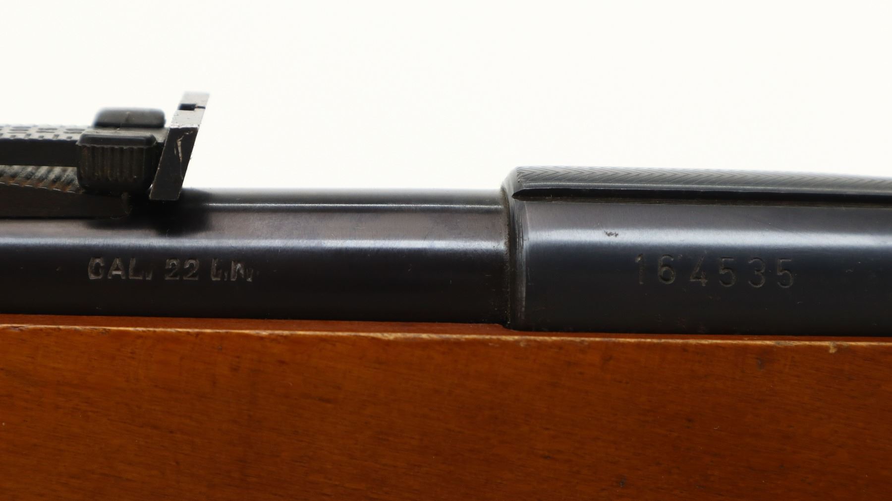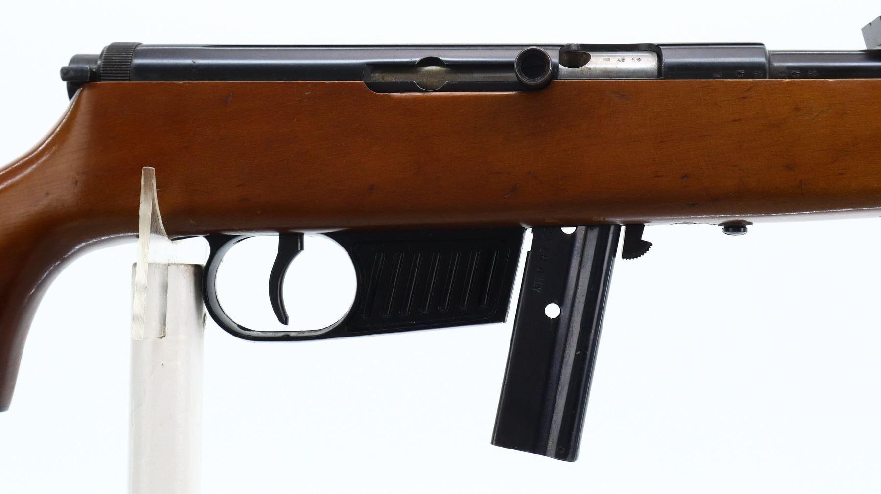 7/10, VOERE, MODEL: SEMI AUTOMATIC, CALIBER:22 LR, COMES WITH MAGAZINE, BORE IS VERY GOOD. BLADE FRONT SIGHT, MISSING RAMP, ADJUSTABLE U NOTCHED REAR SIGHT, BLUED FINISH, GROOVED RECEIVER. ONE PIECE SMOOTH WOOD STOCK, PISTOL GRIP, GROOVED BLACK POLYMER BUTT PLATE, GRIP CAP, SLING SWIVELS. METAL FINISH SHOWS SOME SCRATCHES, HANDLING MARKS AND WEAR. STOCK SHOWS SOME MARKS, SCRATCHES AND WEAR. , ACTION: SEMI AUTOMATIC RIFLE, BARREL LENGTH: 21.25", SERIAL # 164535, CONDITION: 7/10, CLASS: CANADIAN NON RESTRICTED
