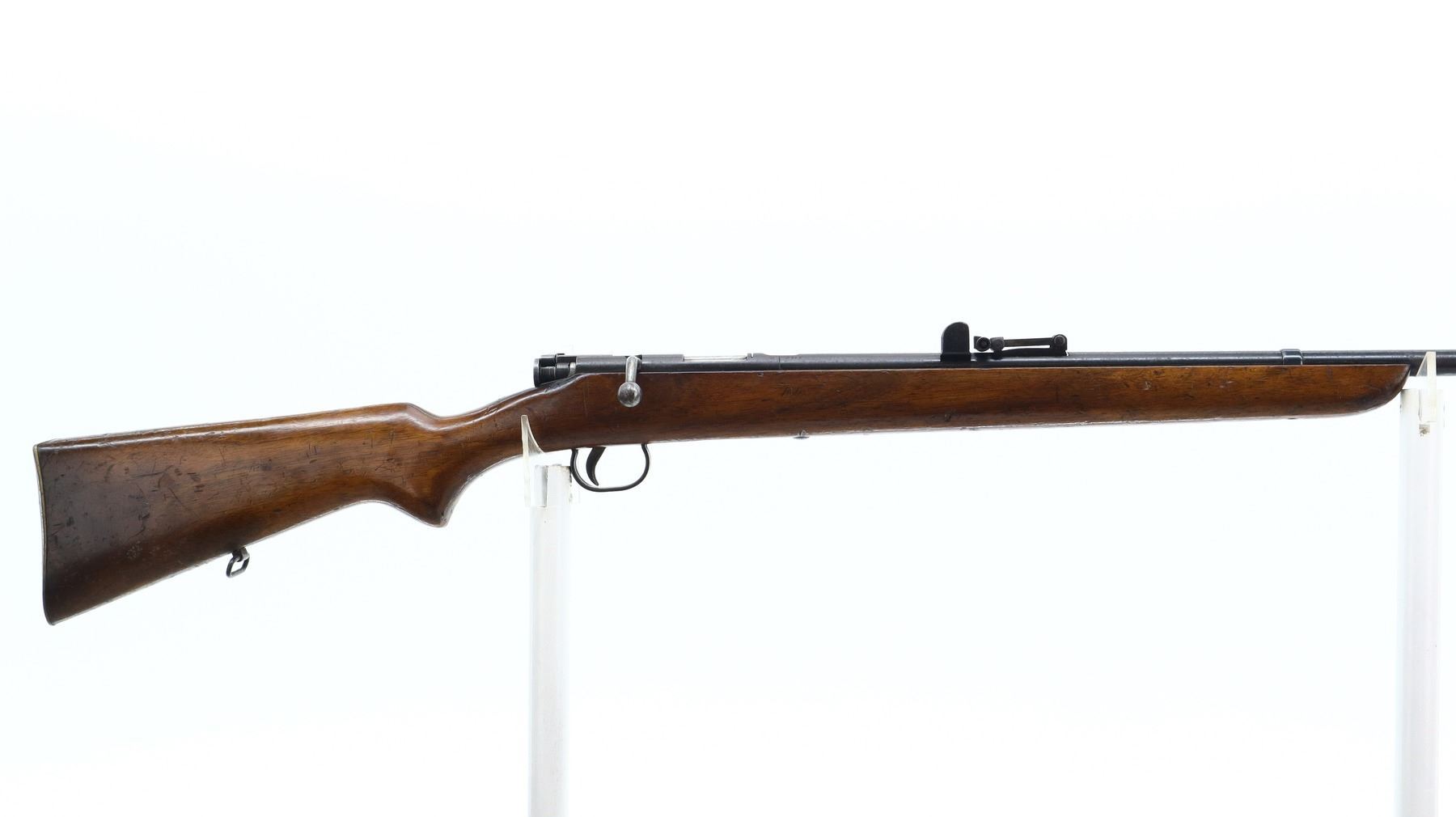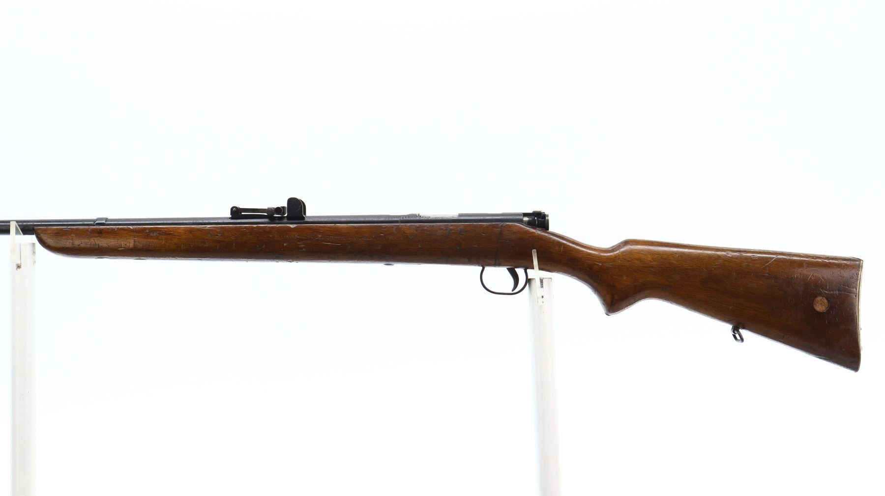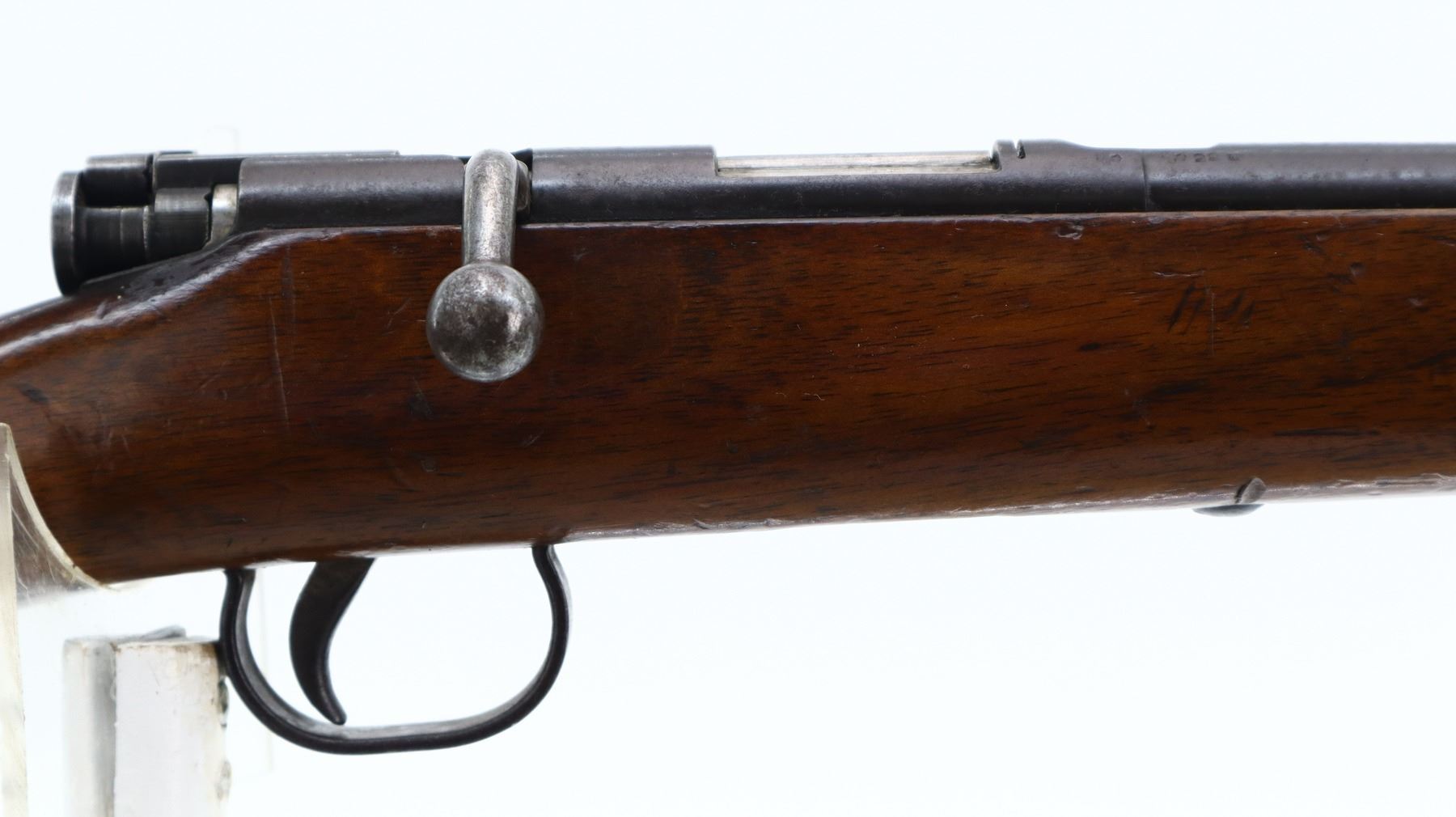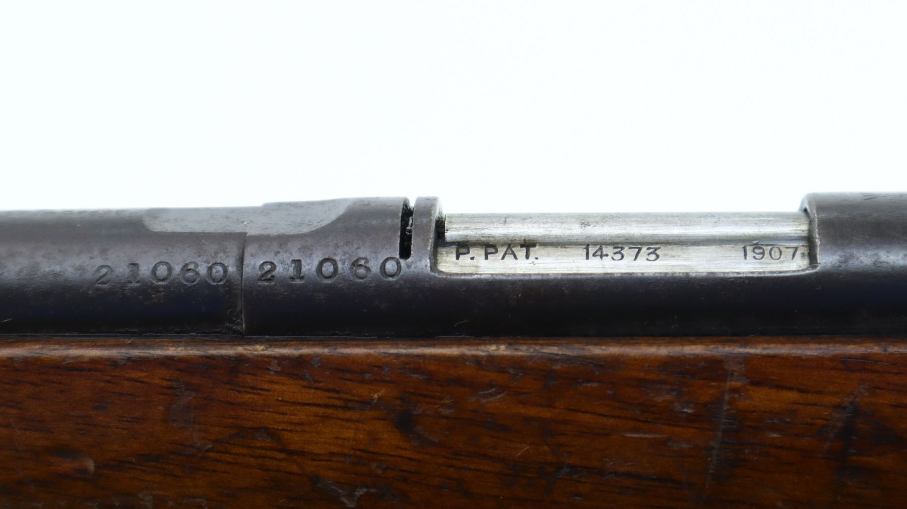 5+/10, BSA, MODEL: 1907 TRAINER, CALIBER:22 LR, BORE IS FAIR, WORN, LIGHT PITTING. MISSING FRONT SIGHT, ADJUSTABLE U NOTCHED REAR SIGHT WITH EARS, TURNED DOWN BOLT HANDLE. ONE PIECE SMOOTH WOOD STOCK, PISTOL GRIP, SMOOTH BRASS BUTT PLATE WITH TRAP, MISSING RIGHT SIDE STOCK DISK, REAR SWIVEL ONLY. METAL FINISH TURNING BROWN WITH LIGHT RUST, PITTING, HANDLING MARKS AND WEAR. STOCK SHOWS DINGS, SCRATCHES AND WEAR. , ACTION: BOLT ACTION RIFLE, BARREL LENGTH: 23.75", SERIAL # 21060, CONDITION: 5+/10, CLASS: CANADIAN NON RESTRICTED