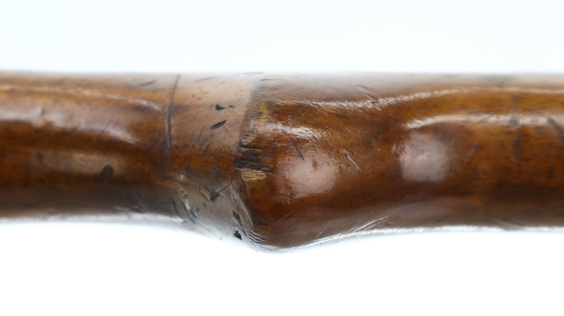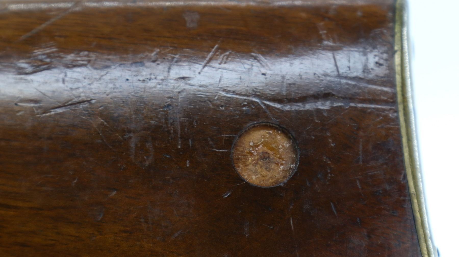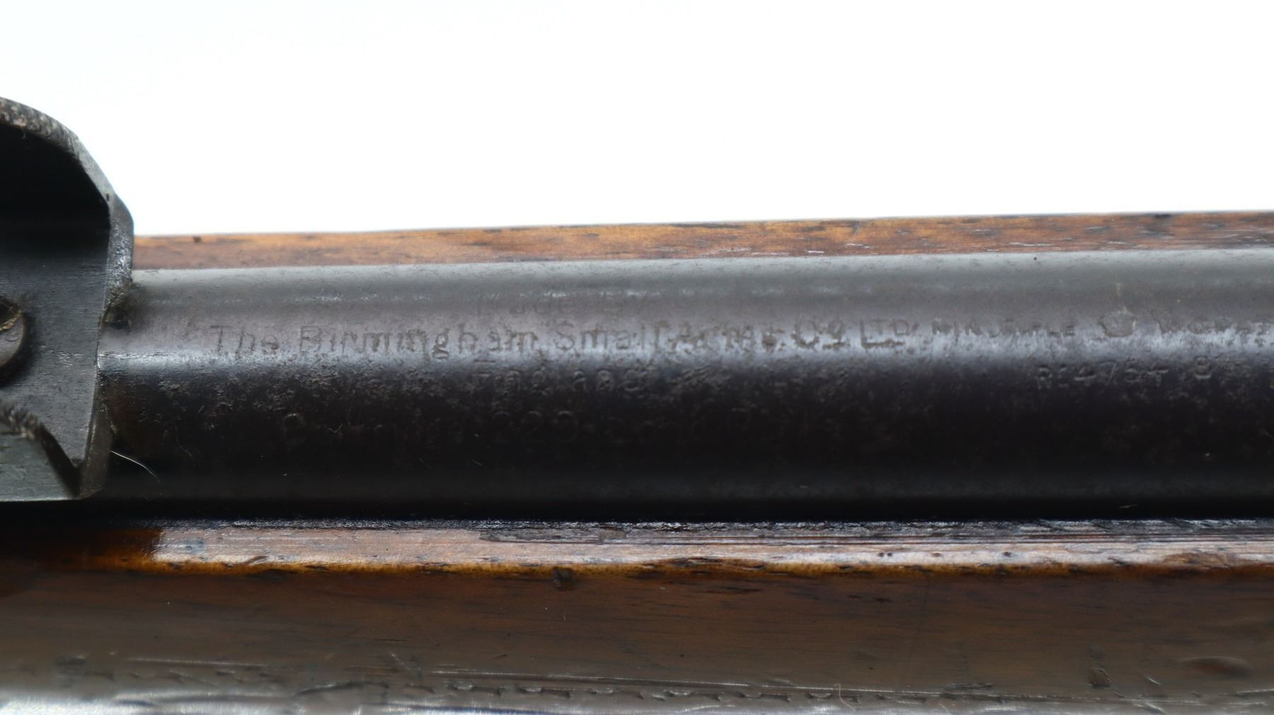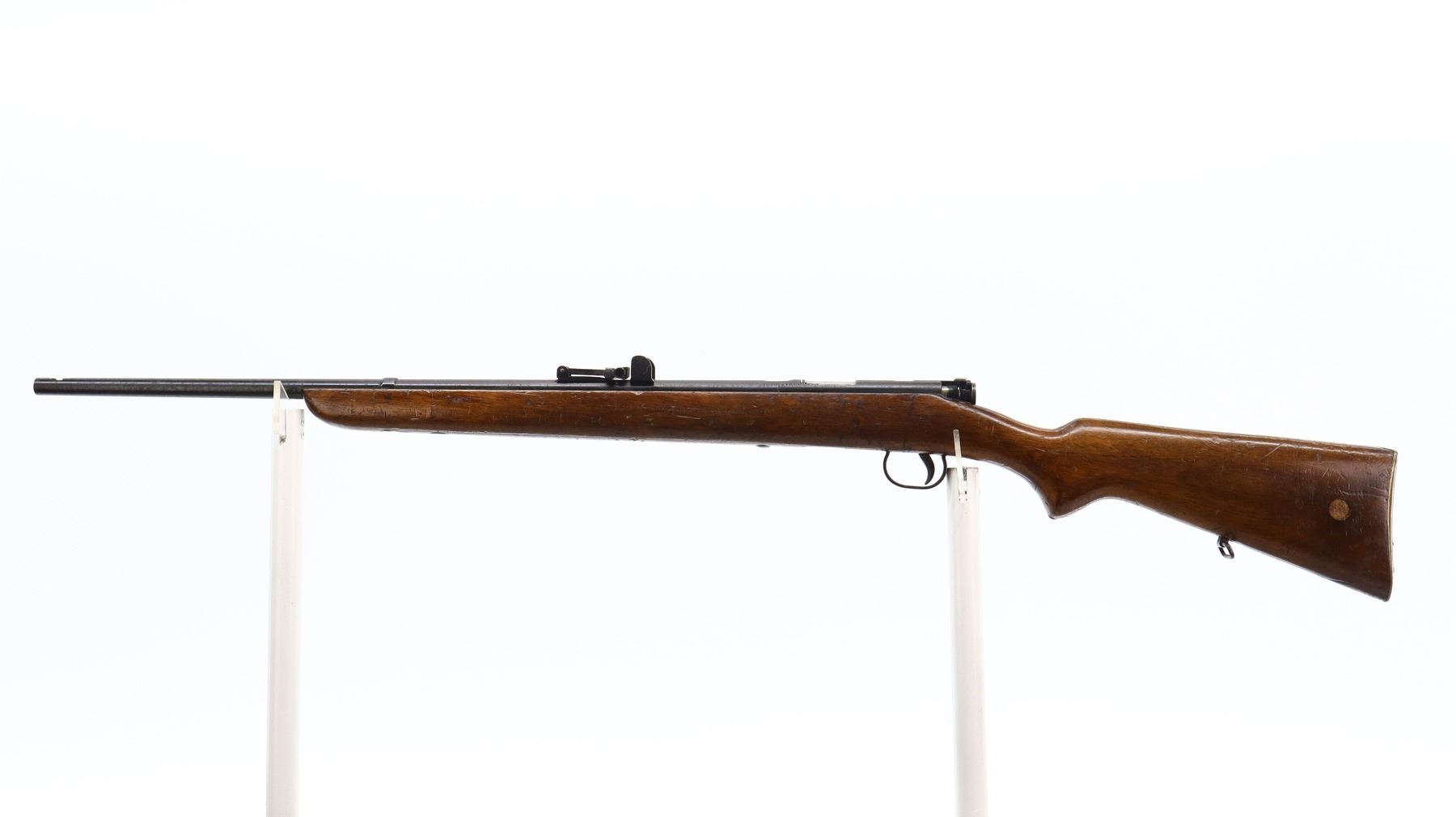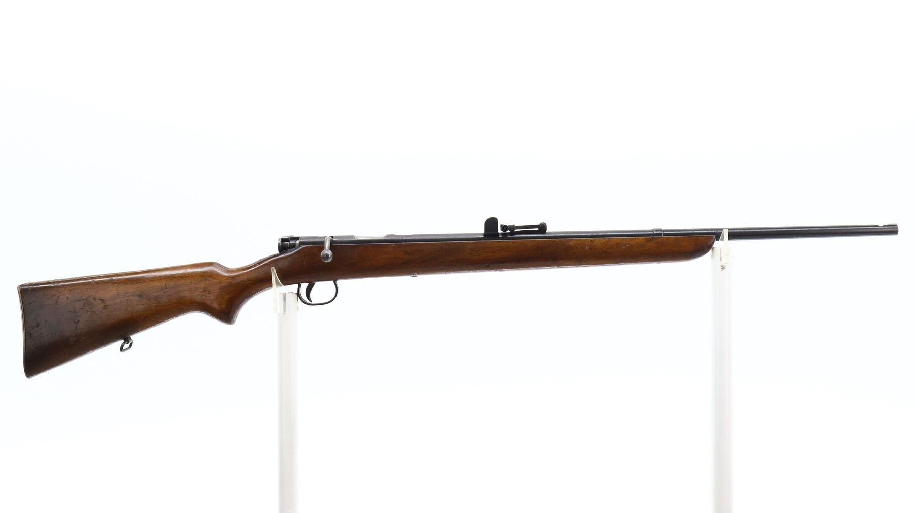 5+/10, BSA, MODEL: 1907 TRAINER, CALIBER:22 LR, BORE IS FAIR, WORN, LIGHT PITTING. MISSING FRONT SIGHT, ADJUSTABLE U NOTCHED REAR SIGHT WITH EARS, TURNED DOWN BOLT HANDLE. ONE PIECE SMOOTH WOOD STOCK, PISTOL GRIP, SMOOTH BRASS BUTT PLATE WITH TRAP, MISSING RIGHT SIDE STOCK DISK, REAR SWIVEL ONLY. METAL FINISH TURNING BROWN WITH LIGHT RUST, PITTING, HANDLING MARKS AND WEAR. STOCK SHOWS DINGS, SCRATCHES AND WEAR. , ACTION: BOLT ACTION RIFLE, BARREL LENGTH: 23.75", SERIAL # 21060, CONDITION: 5+/10, CLASS: CANADIAN NON RESTRICTED