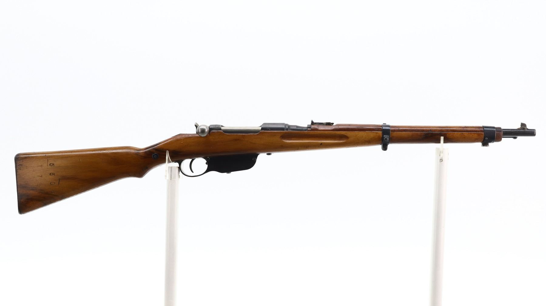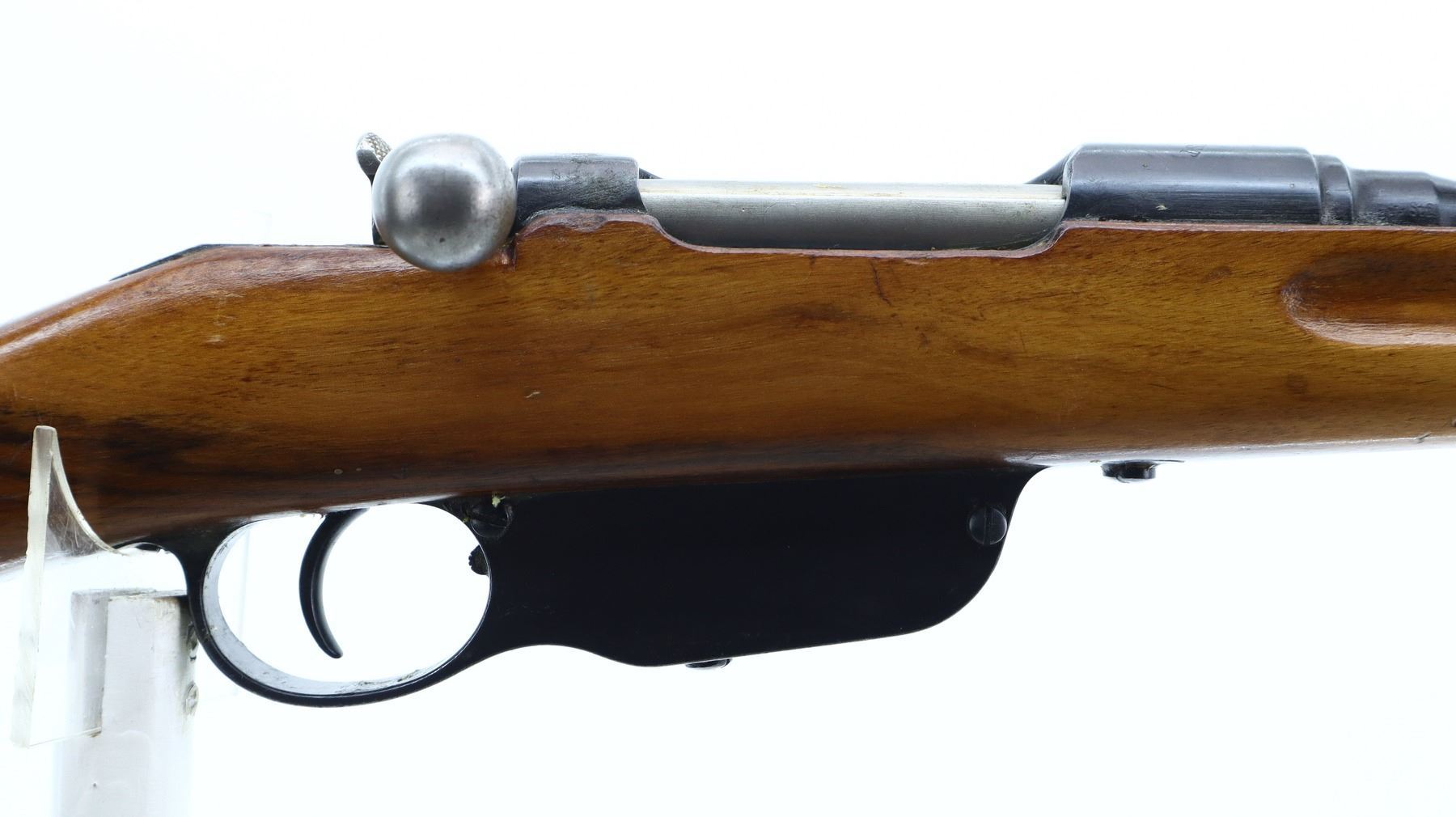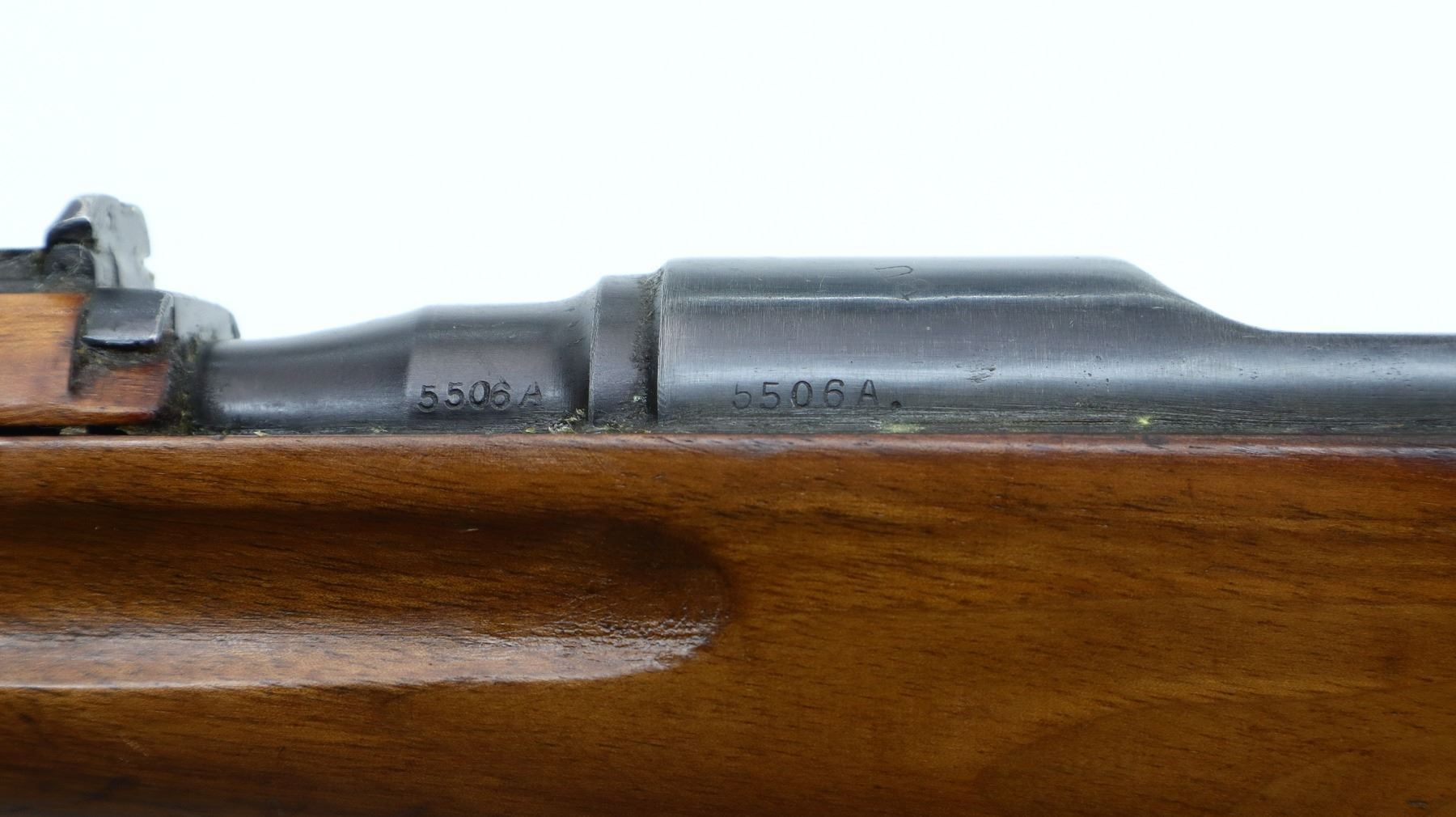 7+/10, STEYR, MODEL: M95, CALIBER:8 X 56R, BORE IS FAIR, WORN, LIGHT PITTING. MANUFACTURED IN BUDAPEST 1932, ARSENAL REBUILT NUMBERED TO MATCH. BARLEY CORN FRONT SIGHT WITH RAMP, ADJUSTABLE U NOTCHED LADDER REAR SIGHT, SILVER BOLT WITH STRAIGHT HANDLE. TWO PIECE FULL MILITARY WOOD STOCKS, FINGER GROOVED FOREND, PISTOL GRIP, SMOOTH STEEL BUTT PLATE, SLING SWIVELS, STACKING HOOK, BAYONET LUG. METAL FINISH SHOWS SOME SCRATCHES, HANDLING MARKS AND WEAR. STOCKS SHOW SOME MARKS, SCRATCHES AND WEAR. , ACTION: STRAIGHT PULL RIFLE, BARREL LENGTH: 19.5", SERIAL # 5506A, CONDITION: 7+/10, CLASS: CANADIAN NON RESTRICTED