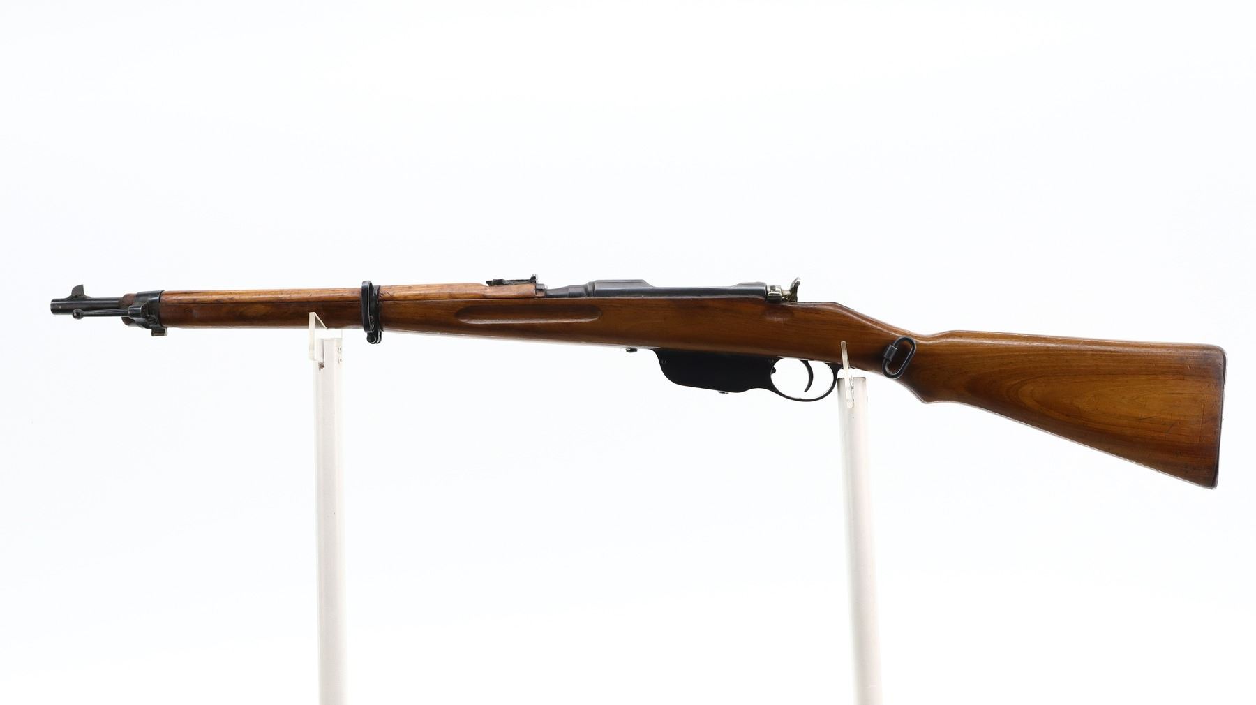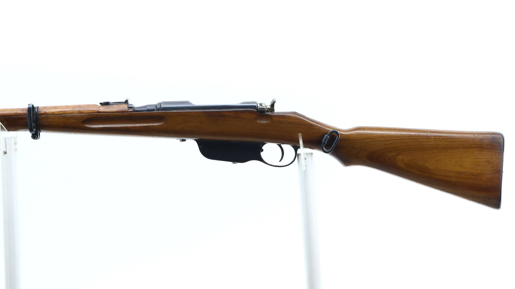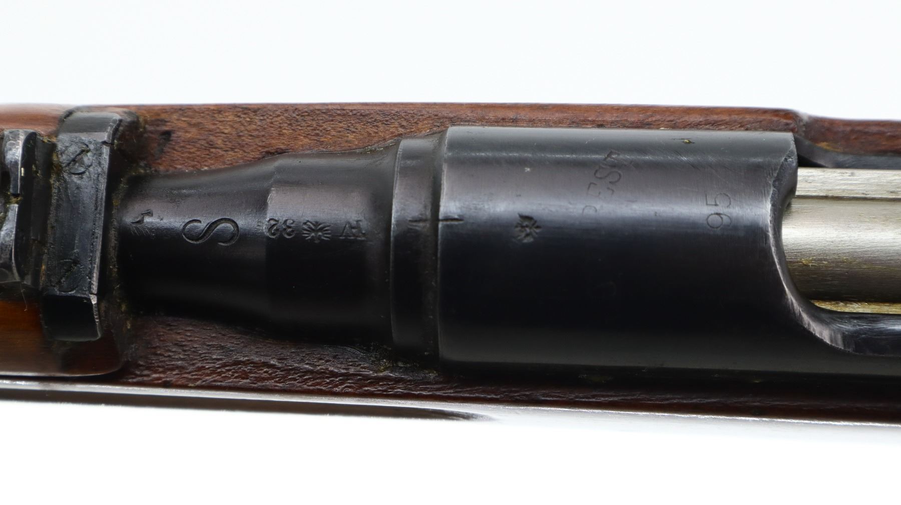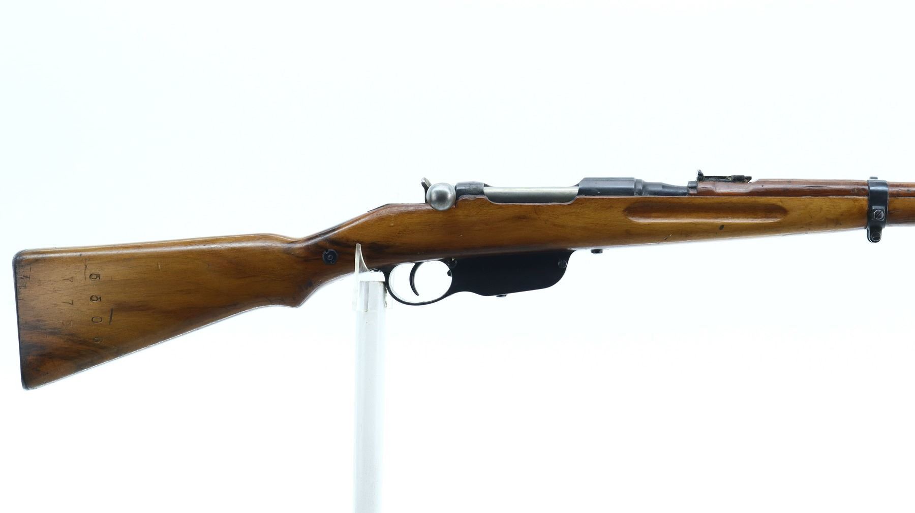 7+/10, STEYR, MODEL: M95, CALIBER:8 X 56R, BORE IS FAIR, WORN, LIGHT PITTING. MANUFACTURED IN BUDAPEST 1932, ARSENAL REBUILT NUMBERED TO MATCH. BARLEY CORN FRONT SIGHT WITH RAMP, ADJUSTABLE U NOTCHED LADDER REAR SIGHT, SILVER BOLT WITH STRAIGHT HANDLE. TWO PIECE FULL MILITARY WOOD STOCKS, FINGER GROOVED FOREND, PISTOL GRIP, SMOOTH STEEL BUTT PLATE, SLING SWIVELS, STACKING HOOK, BAYONET LUG. METAL FINISH SHOWS SOME SCRATCHES, HANDLING MARKS AND WEAR. STOCKS SHOW SOME MARKS, SCRATCHES AND WEAR. , ACTION: STRAIGHT PULL RIFLE, BARREL LENGTH: 19.5", SERIAL # 5506A, CONDITION: 7+/10, CLASS: CANADIAN NON RESTRICTED