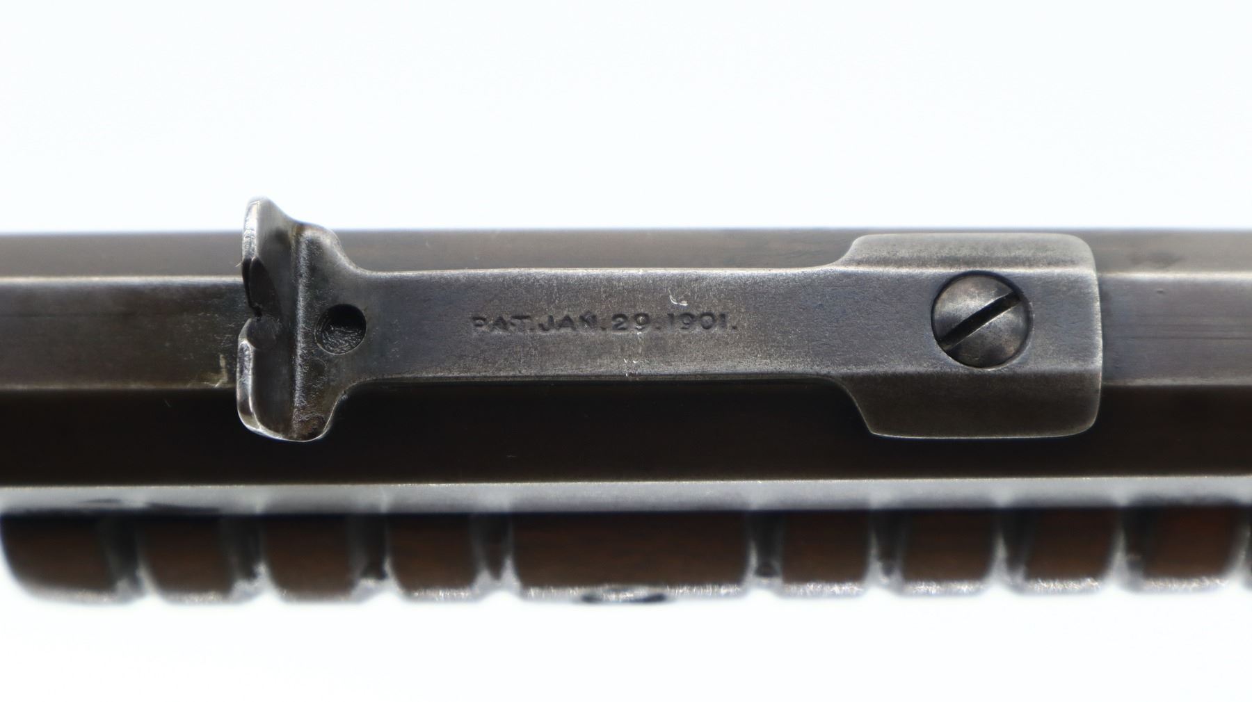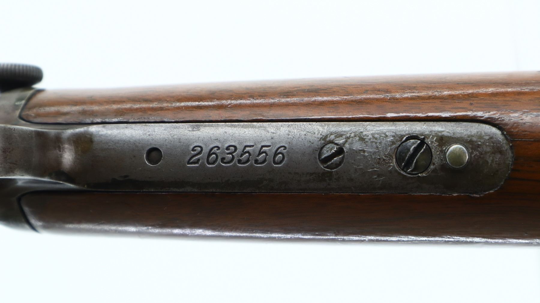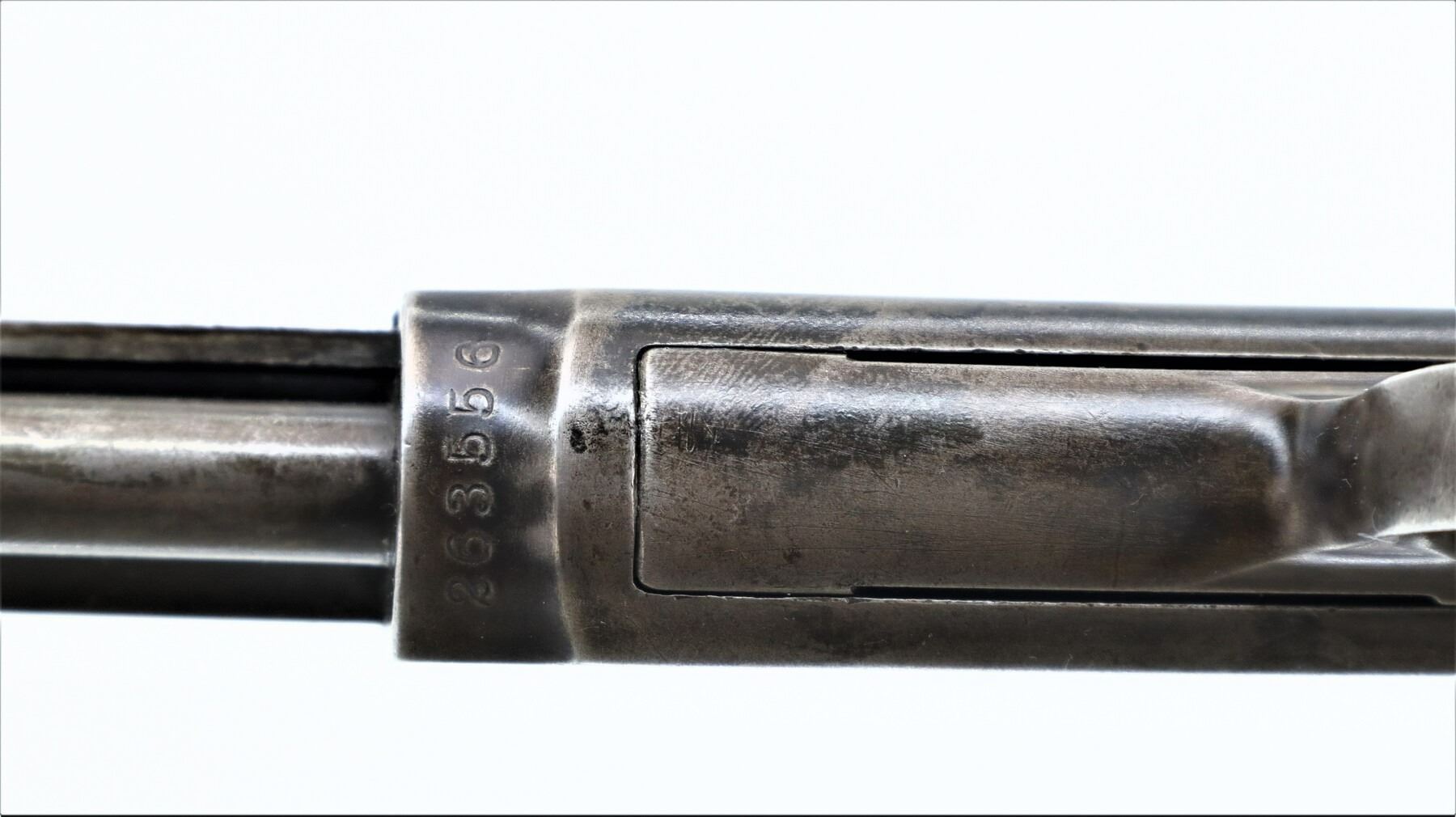 6/10, WINCHESTER, MODEL: 1890, CALIBER:22 LONG, BORE IS POOR, WORN, RINGED. MANUFACTURED 1905. BLADE FRONT SIGHT, U NOTCHED REAR SIGHT MISSING ELEVATION SCREW, OCTAGON BARREL, CHECKERED SPUR HAMMER. TWO PIECE WOOD STOCKS, GROOVED FOREND MISSING ONE SCREW, STRAIGHT GRIP, SMOOTH CURVED STEEL BUTT PLATE, 3/4 LENGTH MAG TUBE. METAL FINISH TURNING BROWN WITH SCRATCHES, HANDLING MARKS AND WEAR. STOCKS SHOW MARKS, SCRATCHES AND WEAR. , ACTION: PUMP ACTION RIFLE, BARREL LENGTH: 24", SERIAL # 263556, CONDITION: 6/10, CLASS: CANADIAN NON RESTRICTED