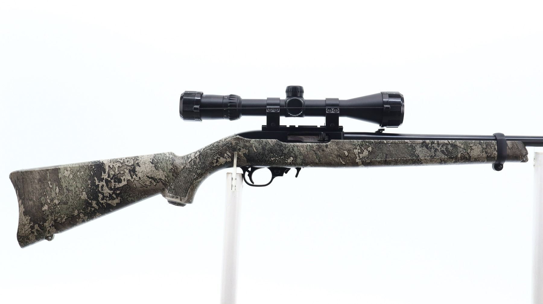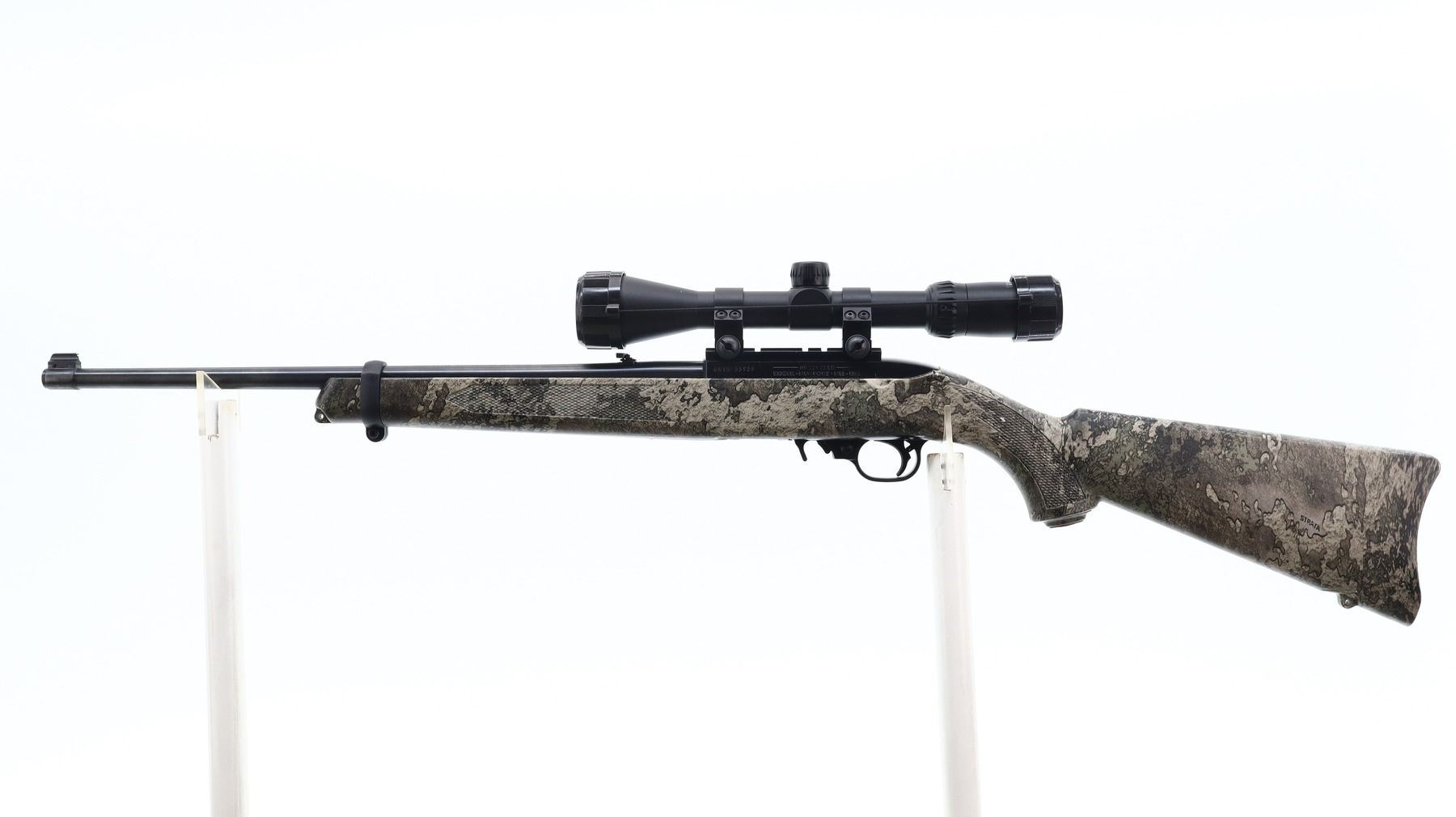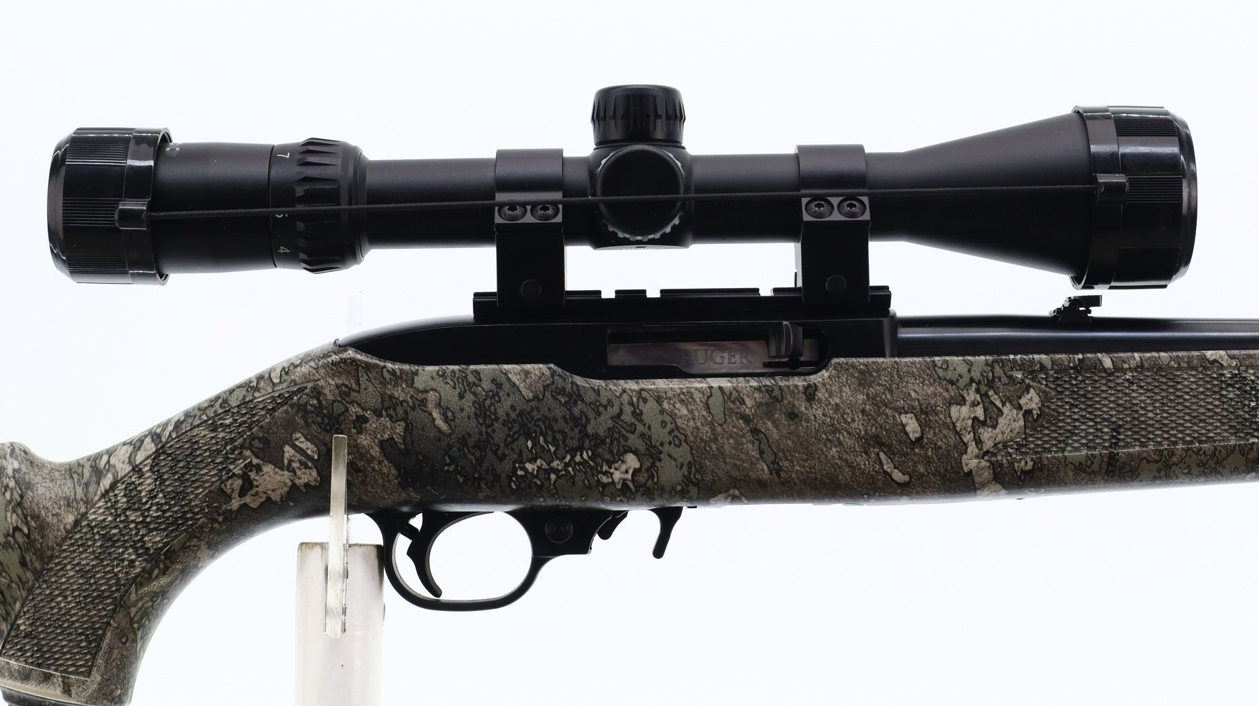 9/10, RUGER, MODEL: 10/22, CALIBER:22 LR, COMES WITH BOX, MANUAL, MAGAZINE, BORE IS EXCELLENT. BLADE FRONT SIGHT WITH RAMP, ADJUSTABLE FOLDING U NOTCHED REAR SIGHT, BLUED STEEL BARREL, BLACK ALLOY RECEIVER DRILLED AND TAPPED WITH TASCO RIMFIRE 3-9 X 40 SCOPE, CLEAR OPTICS WITH DUPLEX CROSSHAIR. ONE PIECE SYNTHETIC TRUE TIMBER STRATA CAMO STOCK, CHECKERED FOREARM AND PISTOL GRIP, CHECKERED POLYMER BUTT PLATE, EXTENDED MAG RELEASE, SWIVEL STUDS. METAL FINISH SHOWS SOME SCRATCHES AND HANDLING MARKS. STOCK SHOWS SOME SLIGHT MARKS AND SCRATCHES. , ACTION: SEMI AUTOMATIC RIFLE, BARREL LENGTH: 18.5", SERIAL # 001333959, CONDITION: 9/10, CLASS: CANADIAN NON RESTRICTED