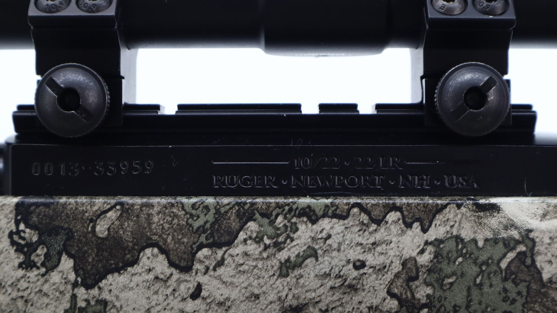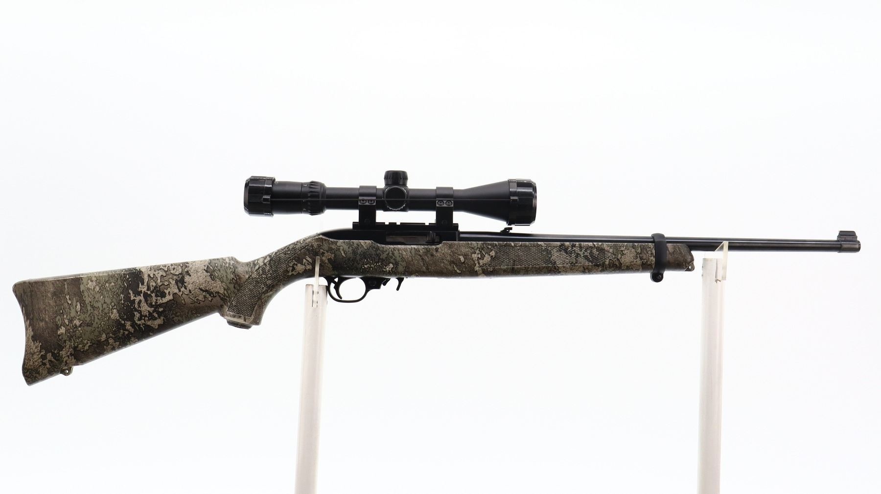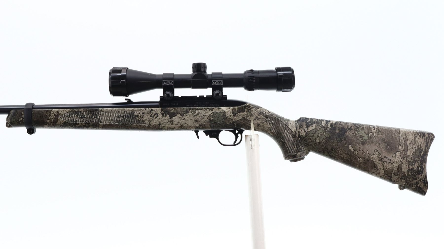 9/10, RUGER, MODEL: 10/22, CALIBER:22 LR, COMES WITH BOX, MANUAL, MAGAZINE, BORE IS EXCELLENT. BLADE FRONT SIGHT WITH RAMP, ADJUSTABLE FOLDING U NOTCHED REAR SIGHT, BLUED STEEL BARREL, BLACK ALLOY RECEIVER DRILLED AND TAPPED WITH TASCO RIMFIRE 3-9 X 40 SCOPE, CLEAR OPTICS WITH DUPLEX CROSSHAIR. ONE PIECE SYNTHETIC TRUE TIMBER STRATA CAMO STOCK, CHECKERED FOREARM AND PISTOL GRIP, CHECKERED POLYMER BUTT PLATE, EXTENDED MAG RELEASE, SWIVEL STUDS. METAL FINISH SHOWS SOME SCRATCHES AND HANDLING MARKS. STOCK SHOWS SOME SLIGHT MARKS AND SCRATCHES. , ACTION: SEMI AUTOMATIC RIFLE, BARREL LENGTH: 18.5", SERIAL # 001333959, CONDITION: 9/10, CLASS: CANADIAN NON RESTRICTED