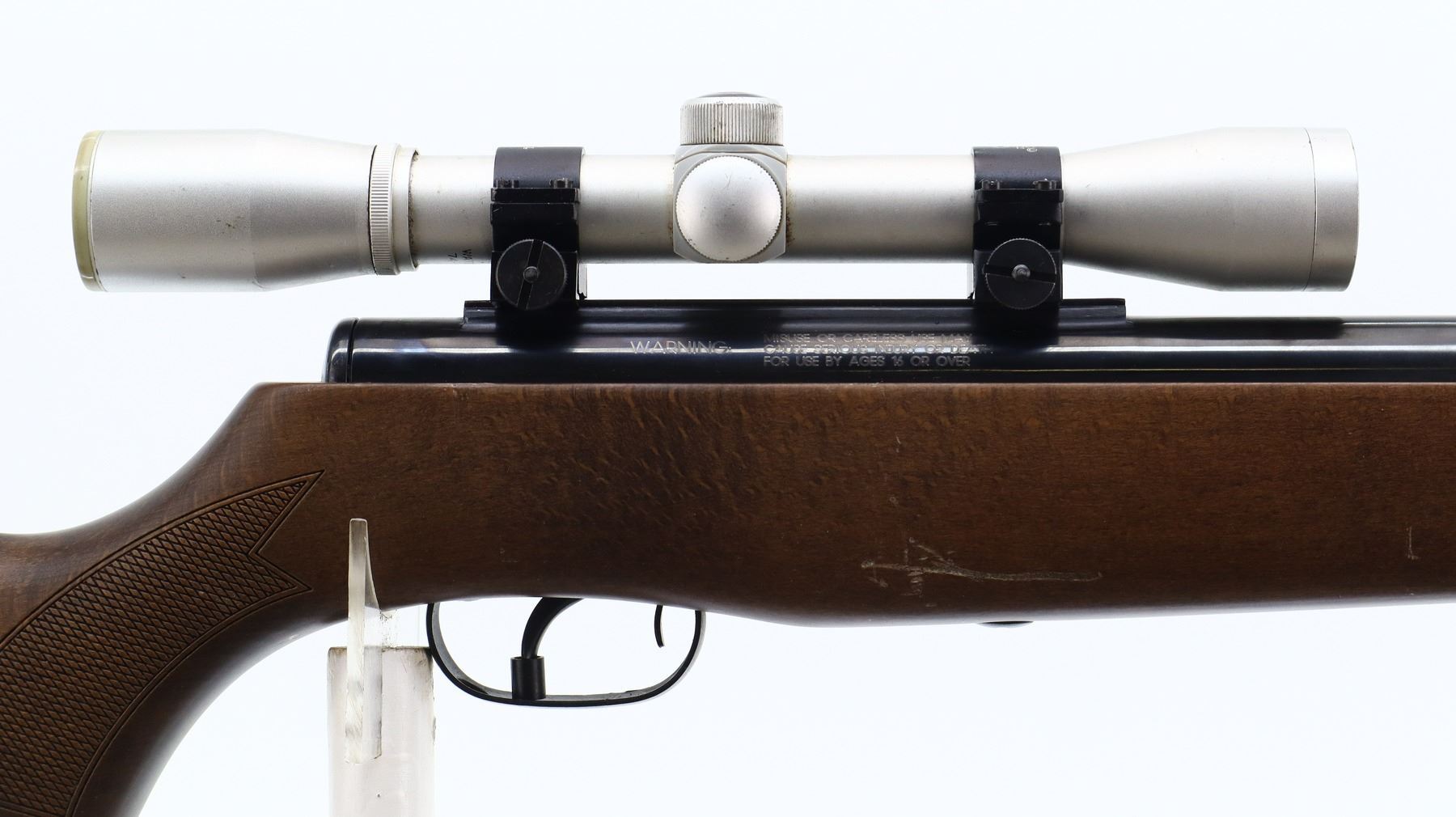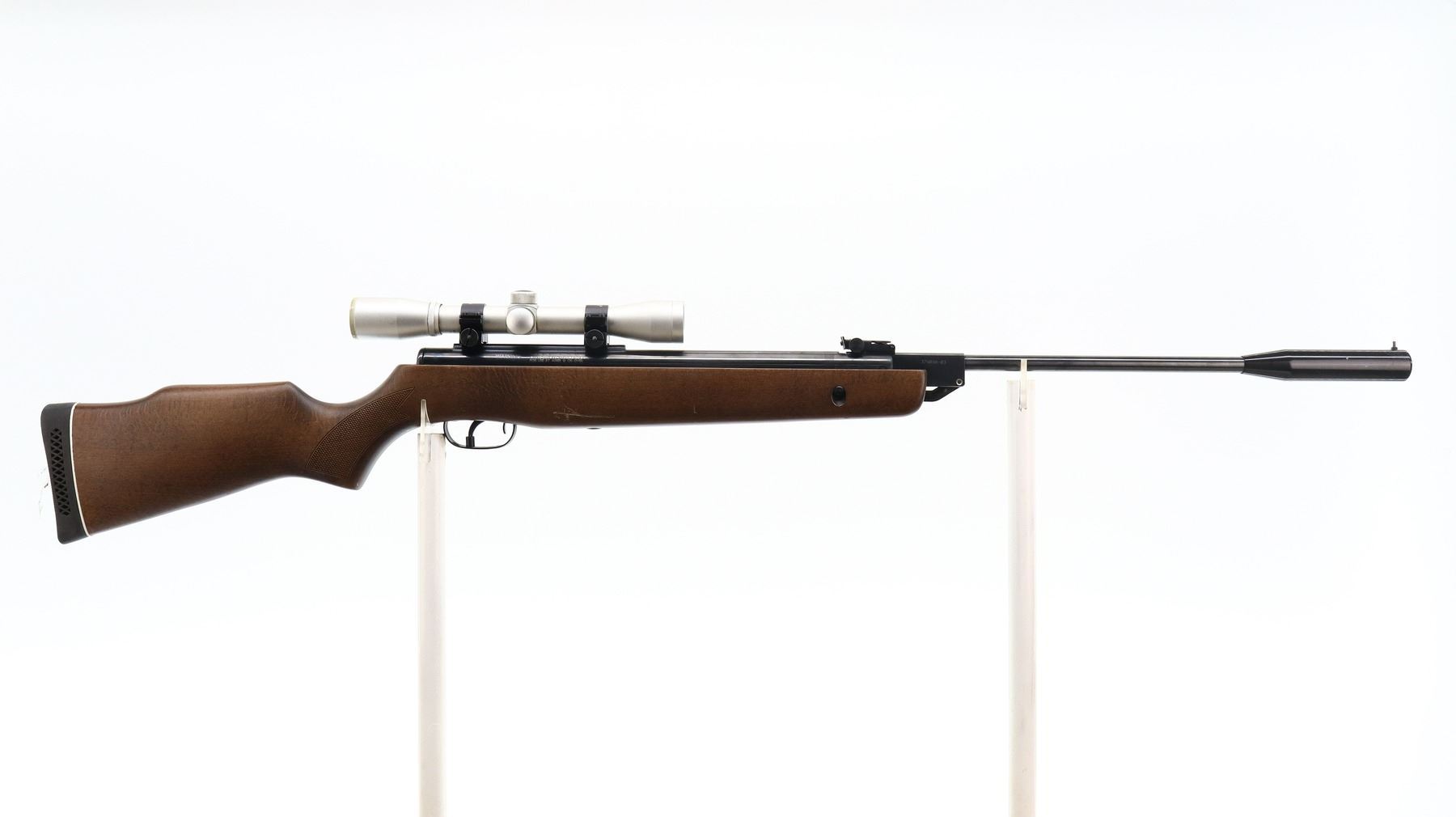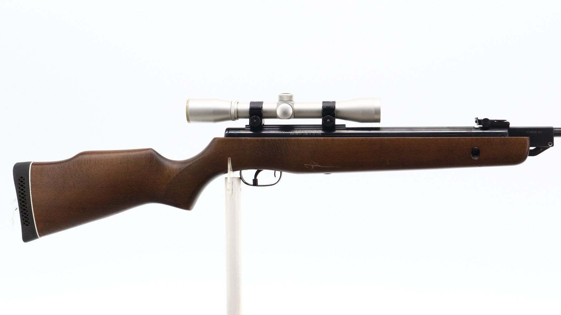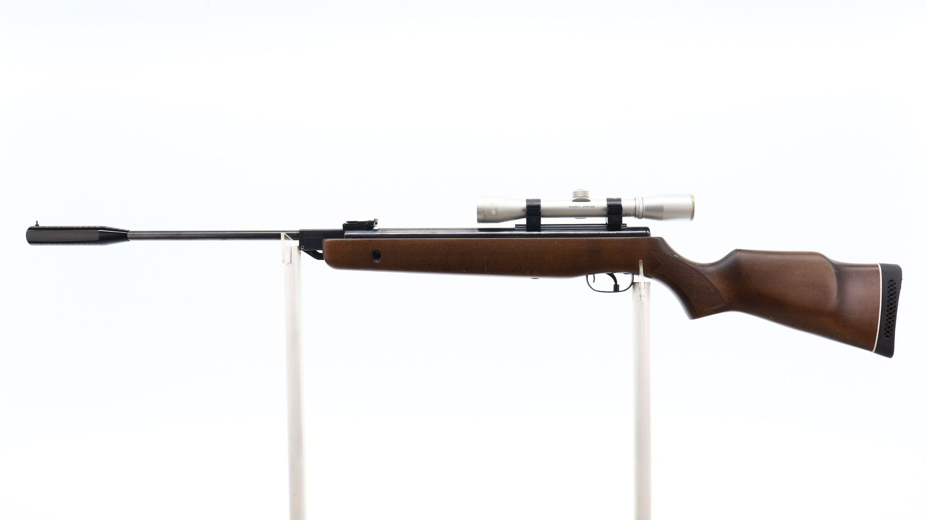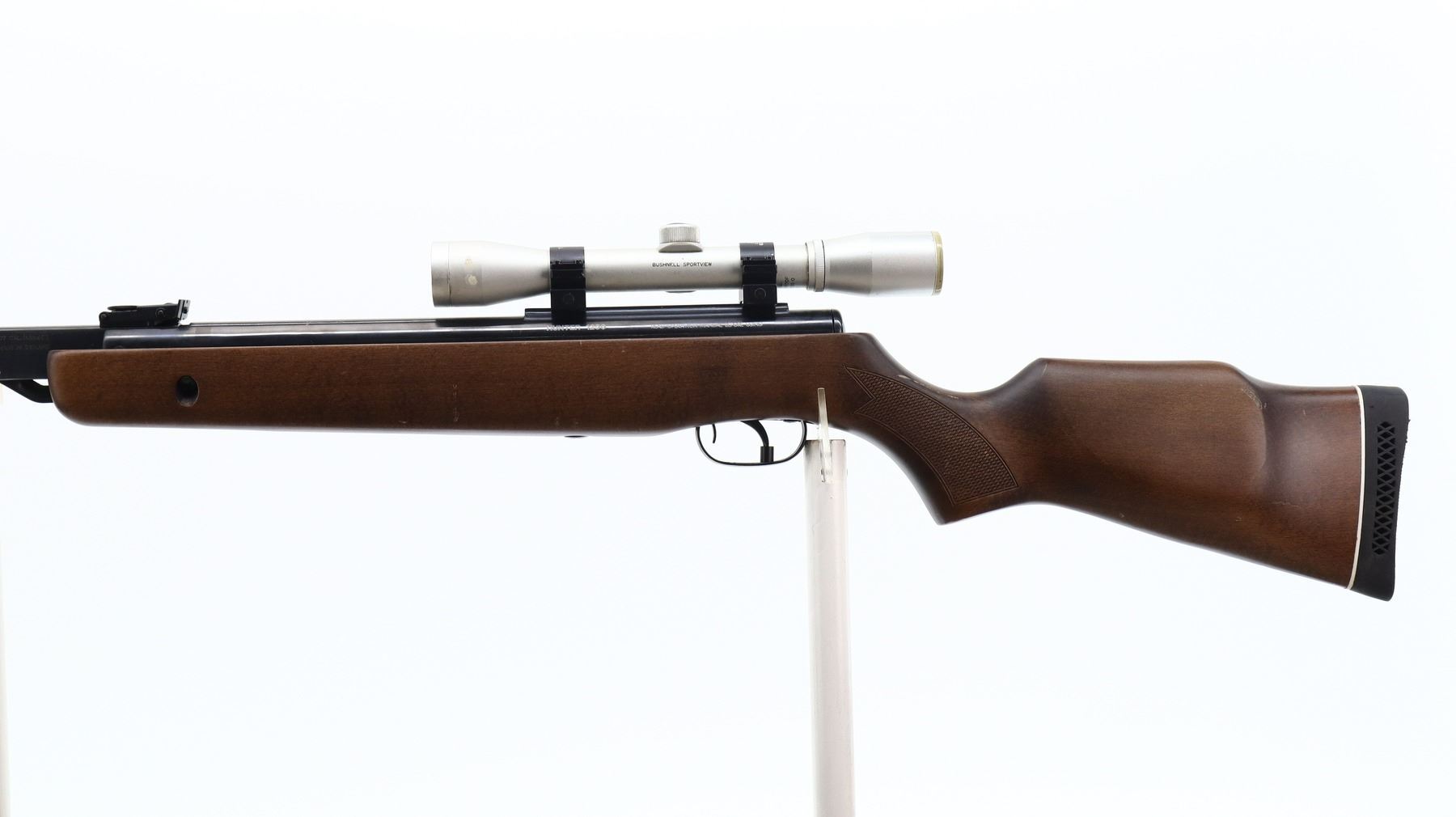 7/10, GAMO, MODEL: HUNTER 1250, CALIBER:.177 PELLET, BORE IS VERY GOOD. POST FRONT SIGHT, ADJUSTABLE U NOTCHED REAR SIGHT, BLUED FINISH, RECEIVER HAS INTEGRAL SCOPE MOUNT WITH BUSHNELL SPORTVIEW 4 X 32 SCOPE, CLEAR OPTICS WITH DUPLEX CROSSHAIR. ONE PIECE WOOD STOCK, CHECKERED PISTOL GRIP, CHEEK REST, BLACK VENTED RUBBER RECOIL PAD. METAL FINISH SHOWS SOME SCRATCHES, HANDLING MARKS AND WEAR. STOCK SHOWS SOME MARKS, SCRATCHES AND WEAR. , ACTION: AIR RIFLE, BARREL LENGTH: 20", SERIAL # 37409803, CONDITION: 7/10, CLASS: CANADIAN NON RESTRICTED