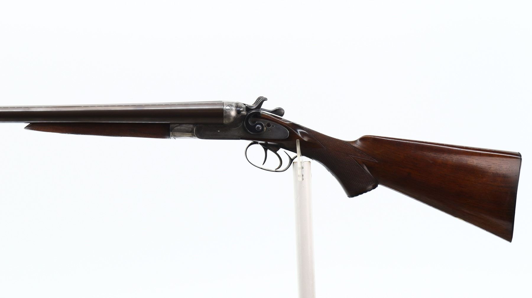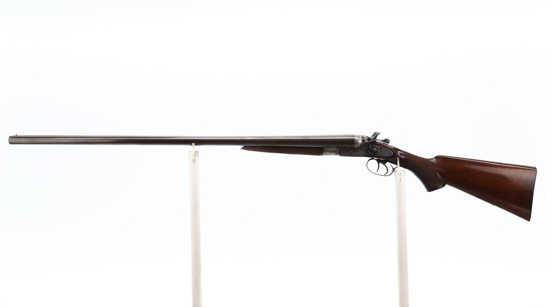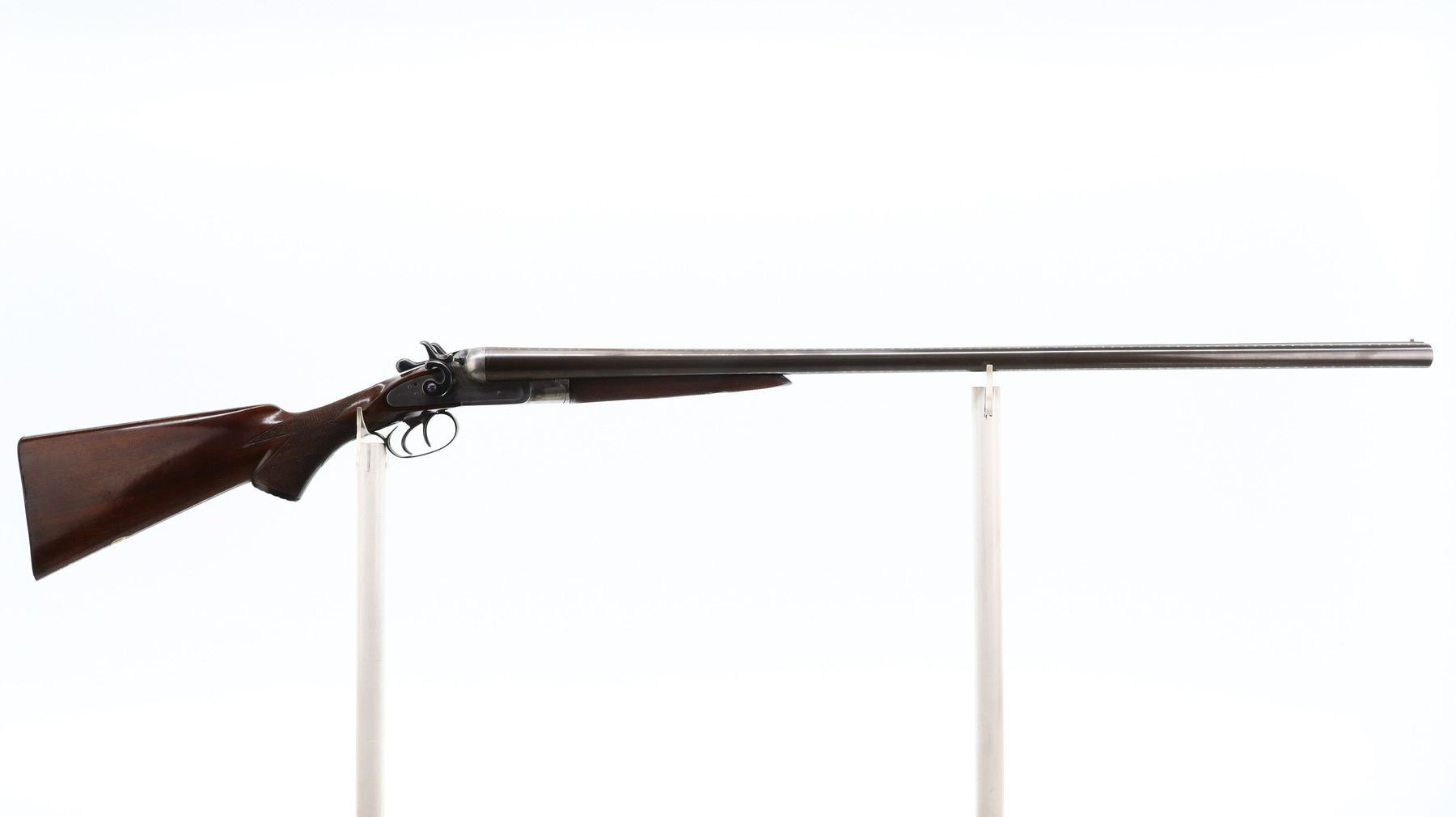 7/10, JANSSEN SONS & CO, MODEL: SIDE BY SIDE HAMMERGUN, CALIBER:10 G X 2 5/8", BORES ARE VERY GOOD. BRASS BEAD, BROWNED DAMASCUS BARRELS, SIDE PLATES WITH EXTERNAL HAMMERS, EXTRACTOR, DOUBLE TRIGGERS. TWO PIECE WOOD STOCKS, CHECKERED FOREARM AND PISTOL GRIP, GROOVED BLACK POLYMER BUTT PLATE, GRIP CAP, VANITY PLATE. METAL FINISH SHOWS SOME SCRATCHES, HANDLING MARKS AND WEAR. STOCKS SHOW SOME MARKS AND SCRATCHES. , ACTION: HINGED SIDE BY SIDE SHOTGUN, BARREL LENGTH: 32", SERIAL # 7863, CONDITION: 7/10, CLASS: CANADIAN NON RESTRICTED