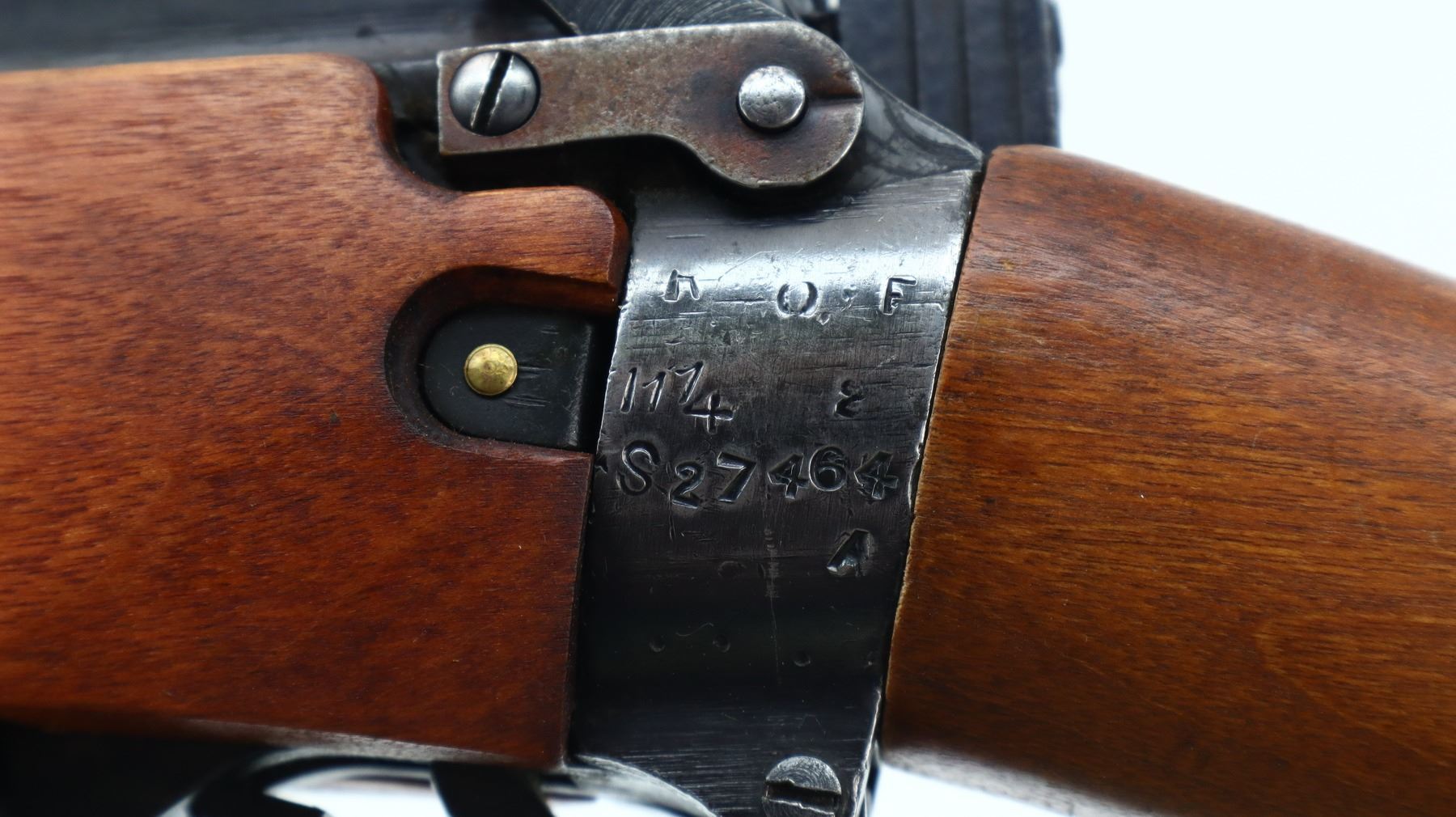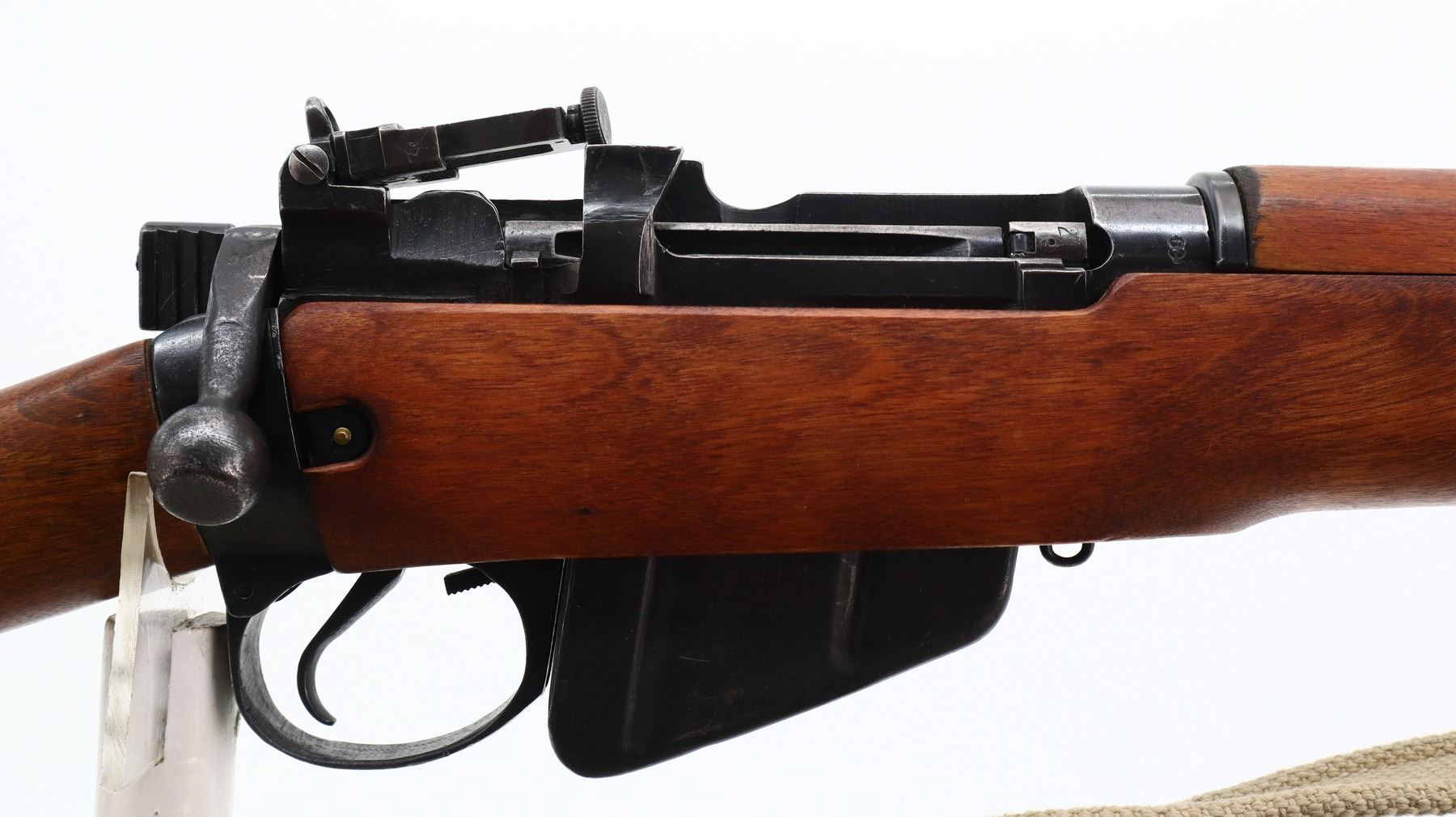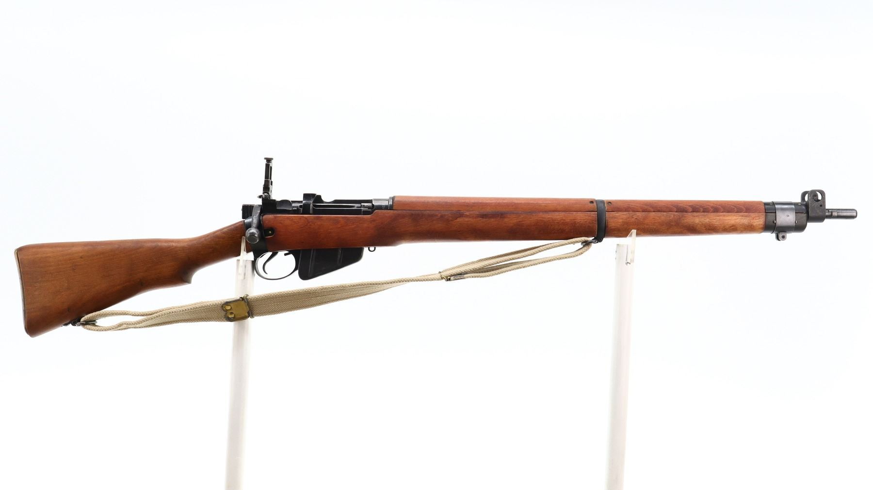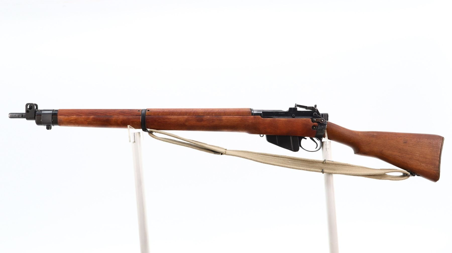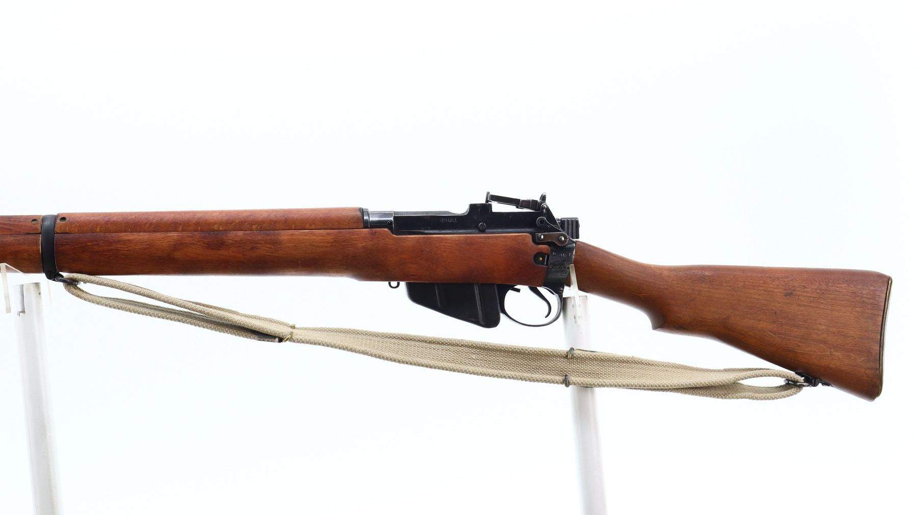7/10, LEE ENFIELD, MODEL: NO 4 MKI, CALIBER:303 BR, COMES WITH SOFT CASE, MAGAZINE, BORE IS FAIR, LIGHT PITTING. BRITISH MANUFACTURE, BOLT MATCHES. BLADE FRONT SIGHT WITH RAMP AND EARS, ADJUSTABLE MILLED REAR PEEP SIGHT (ELEVATION KNOB BENT DOES NOT FUNCTION OR FOLD INTO PLACE). FOUR PIECE FULL MILITARY WOOD STOCKS, PISTOL GRIP, SMOOTH BRASS BUTT PLATE WITH TRAP, SWIVELS WITH CANVAS MILITARY SLING, BAYONET LUGS. METAL FINISH SHOWS SCRATCHES, HANDLING MARKS AND WEAR. STOCKS SHOW MARKS, SCRATCHES AND WEAR. , ACTION: BOLT ACTION RIFLE, BARREL LENGTH: 25.25", SERIAL # S27464, CONDITION: 7/10, CLASS: CANADIAN NON RESTRICTED