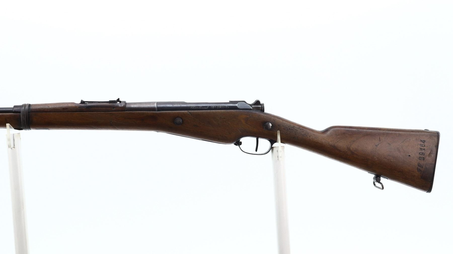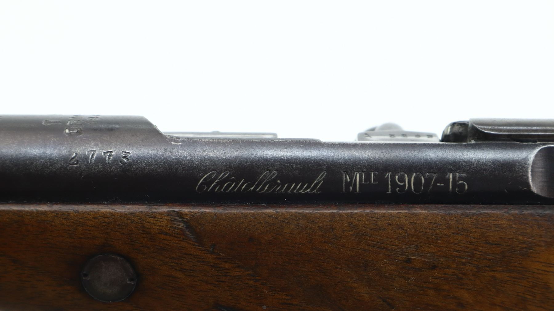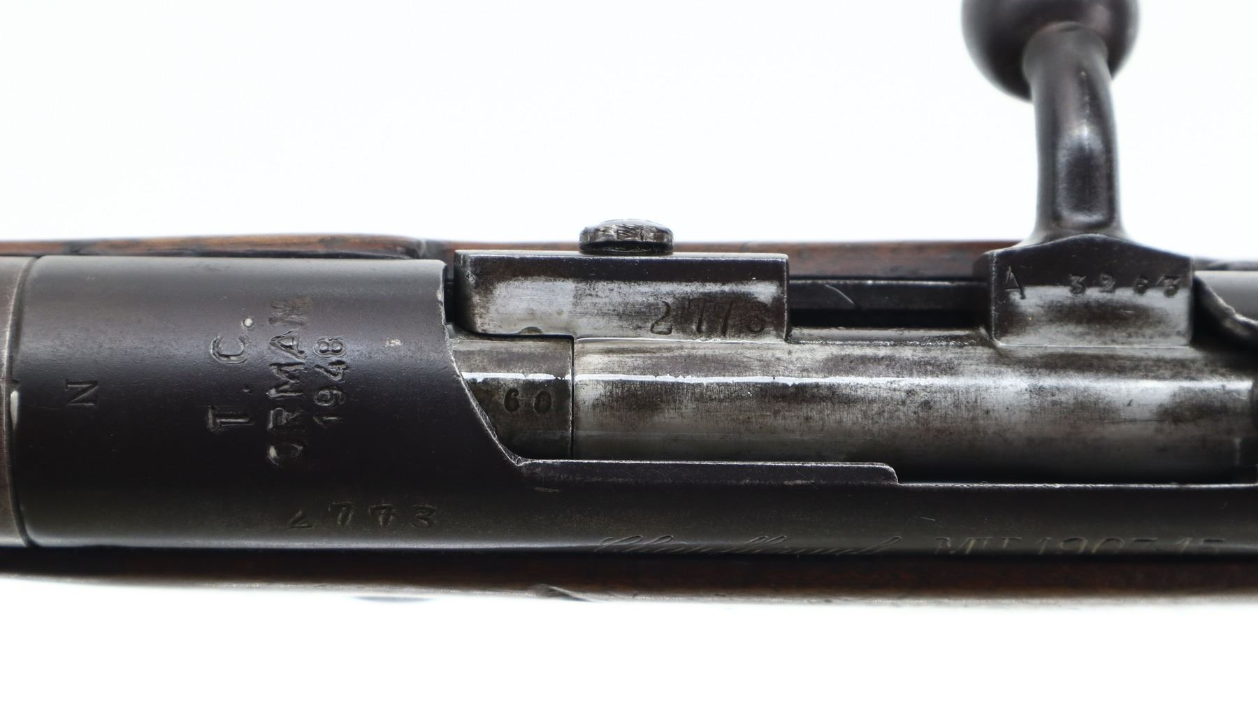 6+/10, TURKISH BERTHIER, MODEL: 1907-15 FORESTRY CARBINE , CALIBER:8MM LEBEL, BORE IS FAIR, PITTED. CONVERTED FROM FRENCH CHATELLERAULT RIFLE BY TC ORMAN 1944. NUMBERED TO MATCH. BARLEY CORN FRONT SIGHT WITH RAMP AND EARS, ADJUSTABLE U NOTCHED REAR SIGHT, TURNED DOWN BOLT HANDLE. TWO PIECE FULL MILITARY WOOD STOCKS WITH ARSENAL REPAIRS, STRAIGHT GRIP, SMOOTH STEEL BUTT PLATE, SLING SWIVELS. METAL FINISH TURNING BROWN WITH SCRATCHES, HANDLING MARKS AND WEAR. STOCKS SHOW MARKS, SCRATCHES AND WEAR. , ACTION: BOLT ACTION RIFLE, BARREL LENGTH: 22", SERIAL # 2773, CONDITION: 6+/10, CLASS: CANADIAN NON RESTRICTED
