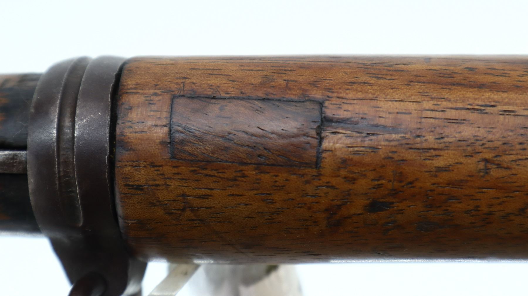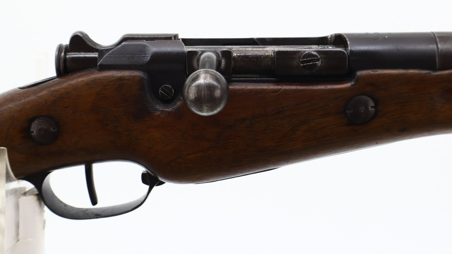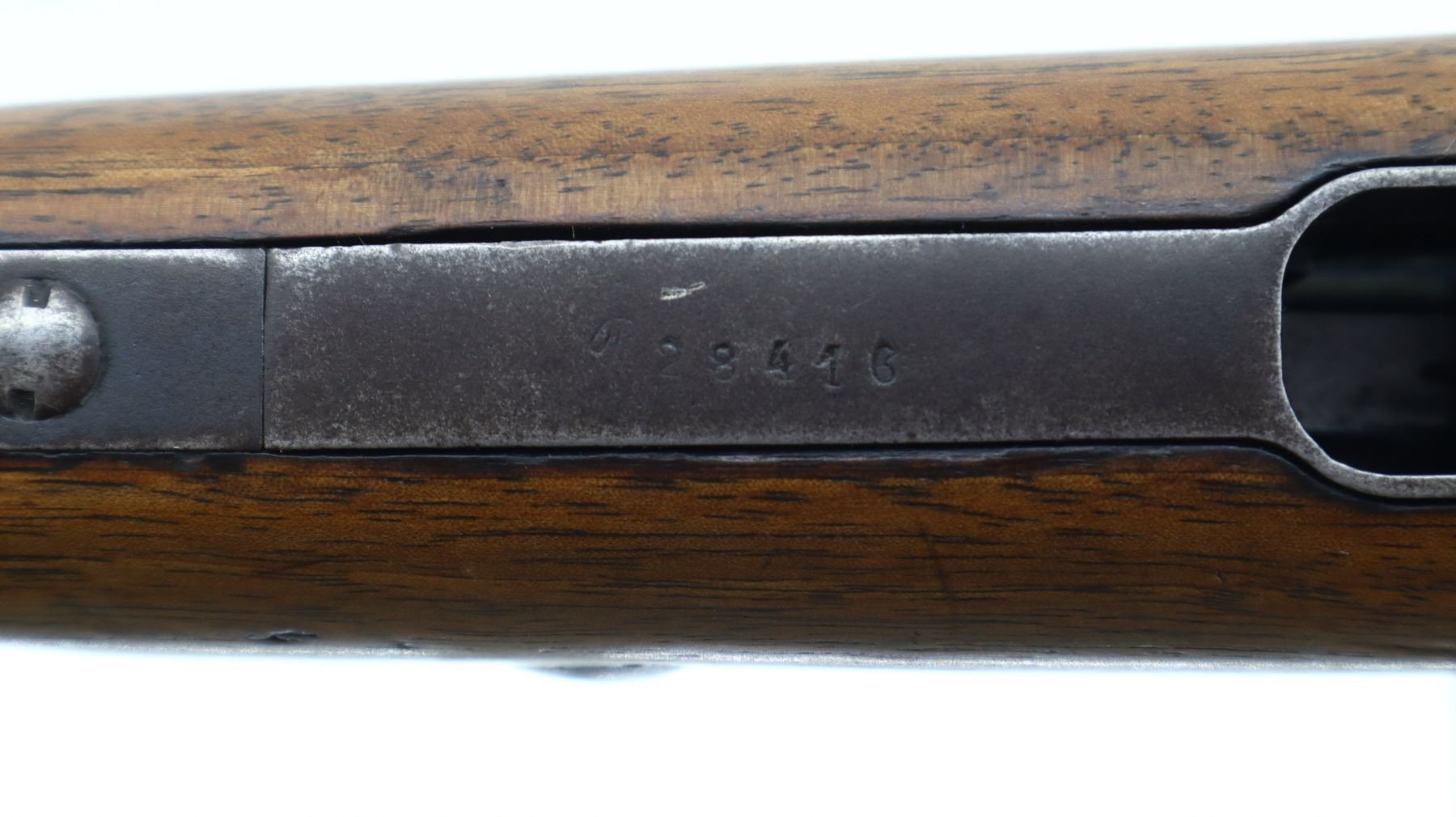 6+/10, TURKISH BERTHIER, MODEL: 1907-15 FORESTRY CARBINE , CALIBER:8MM LEBEL, BORE IS FAIR, PITTED. CONVERTED FROM FRENCH CHATELLERAULT RIFLE BY TC ORMAN 1944. NUMBERED TO MATCH. BARLEY CORN FRONT SIGHT WITH RAMP AND EARS, ADJUSTABLE U NOTCHED REAR SIGHT, TURNED DOWN BOLT HANDLE. TWO PIECE FULL MILITARY WOOD STOCKS WITH ARSENAL REPAIRS, STRAIGHT GRIP, SMOOTH STEEL BUTT PLATE, SLING SWIVELS. METAL FINISH TURNING BROWN WITH SCRATCHES, HANDLING MARKS AND WEAR. STOCKS SHOW MARKS, SCRATCHES AND WEAR. , ACTION: BOLT ACTION RIFLE, BARREL LENGTH: 22", SERIAL # 2773, CONDITION: 6+/10, CLASS: CANADIAN NON RESTRICTED
