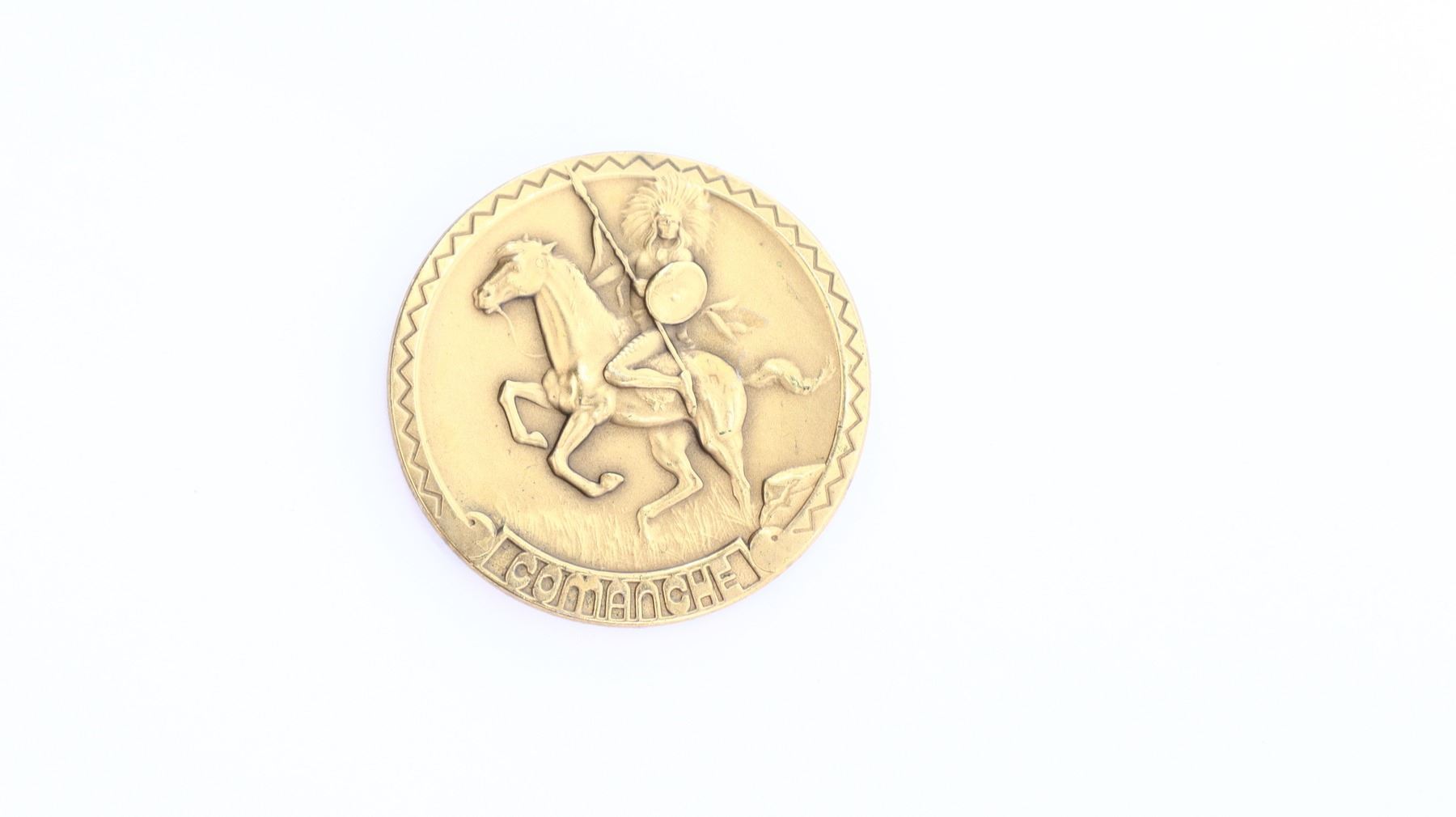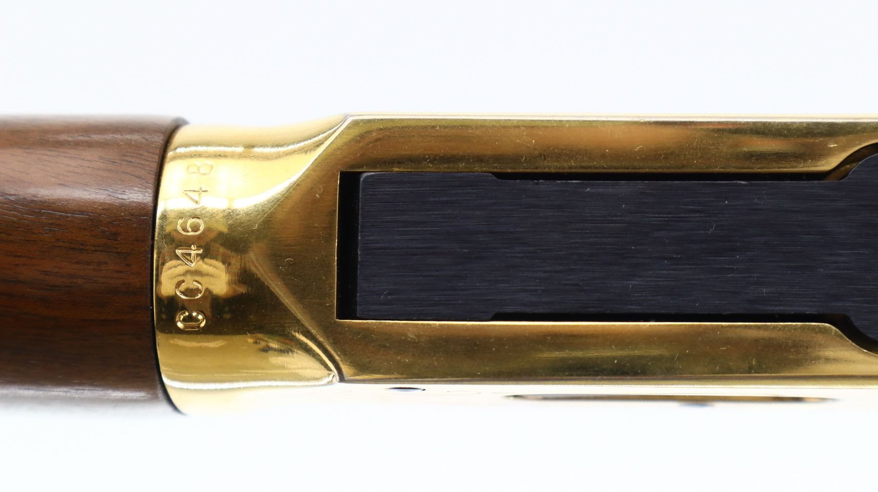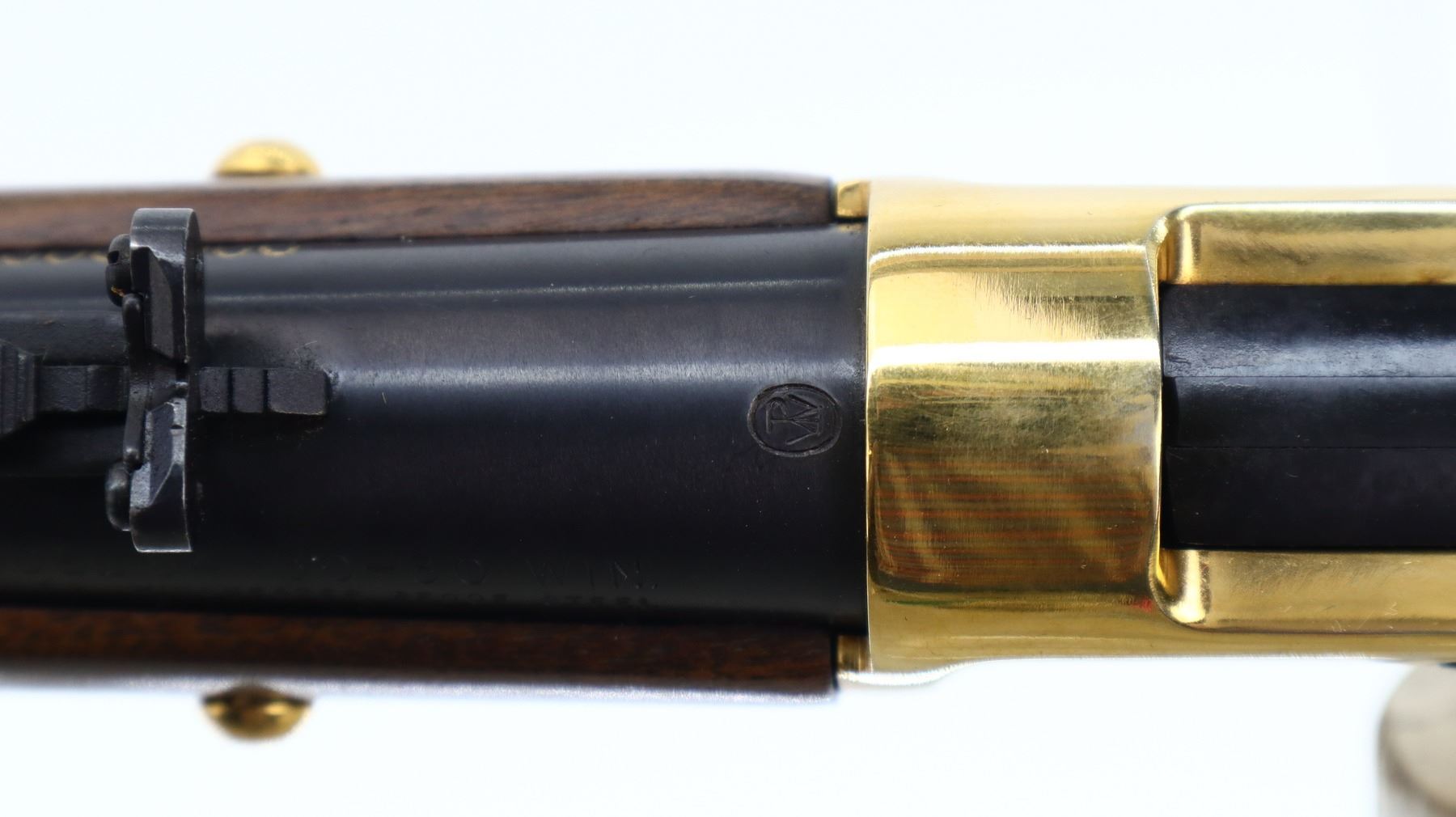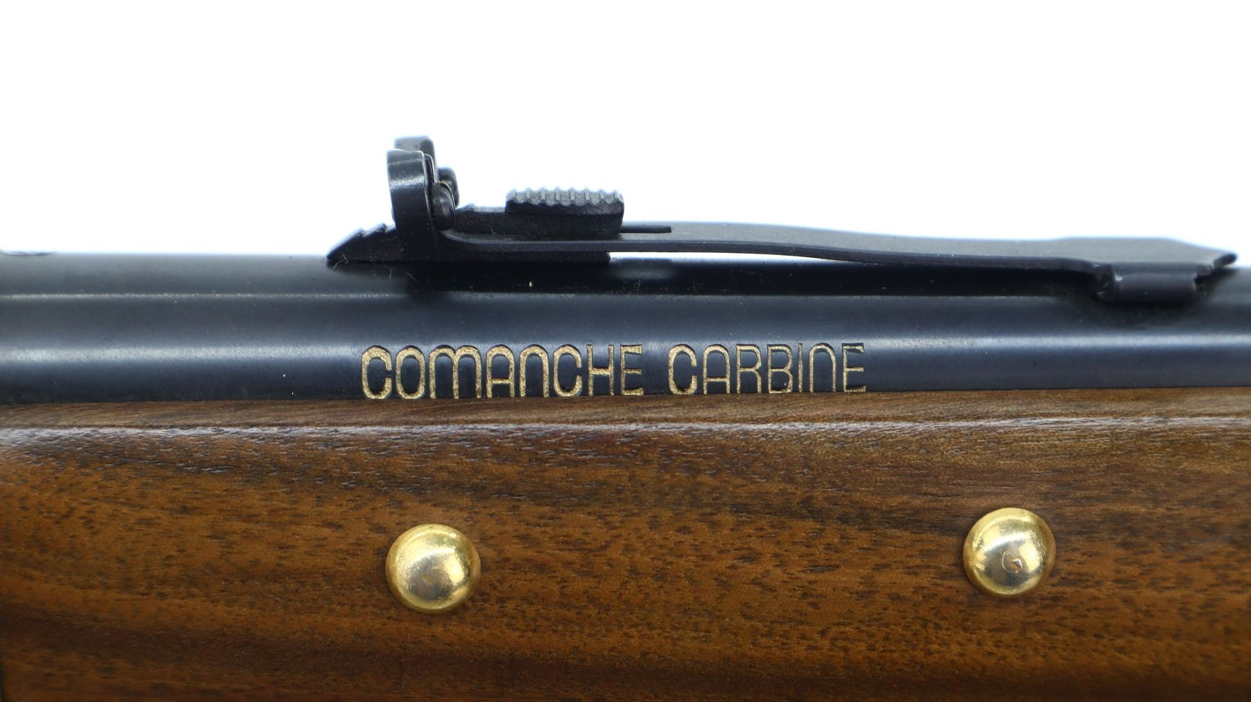8/10, WINCHESTER, MODEL: 94 COMANCHE CARBINE COMMEMORATIVE, CALIBER:30-30 WIN, BORE IS EXCELLENT. BLADE FRONT SIGHT WITH HOOD AND RAMP, ADJUSTABLE U NOTCHED REAR SIGHT, BLUED BARREL, BOLT AND MAG TUBE. GOLD RECEIVER WITH WESTERN SCENE, GROOVED SPUR HAMMER, SADDLE RING AND STUD. TWO PIECE SMOOTH WOOD STOCKS, FOREARM HAS SIX GOLD TACKS, STRAIGHT GRIP, SMOOTH CURVED STEEL BUTT PLATE, MEDALLION FALLEN OUT OF RIGHT SIDE OF STOCK (INCLUDED), FULL LENGTH MAG TUBE. METAL FINISH SHOWS SOME SCRATCHES AND HANDLING MARKS. STOCKS SHOW SOME SLIGHT MARKS AND SCRATCHES. , ACTION: LEVER ACTION RIFLE, BARREL LENGTH: 20", SERIAL # CC4648, CONDITION: 8/10, CLASS: CANADIAN NON RESTRICTED