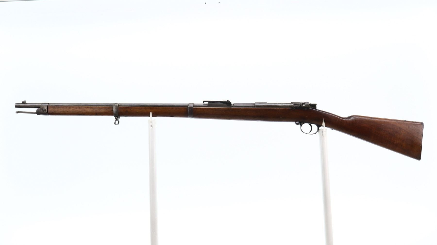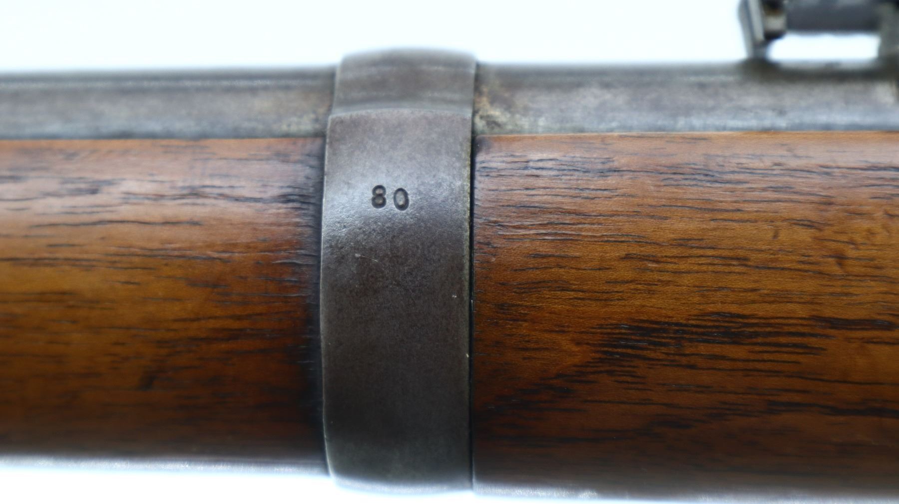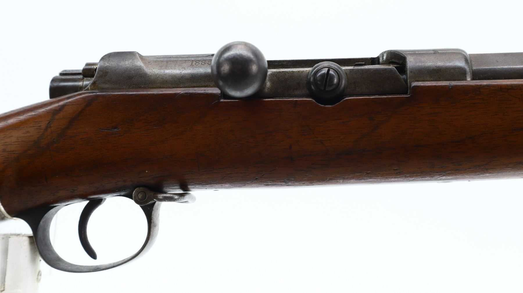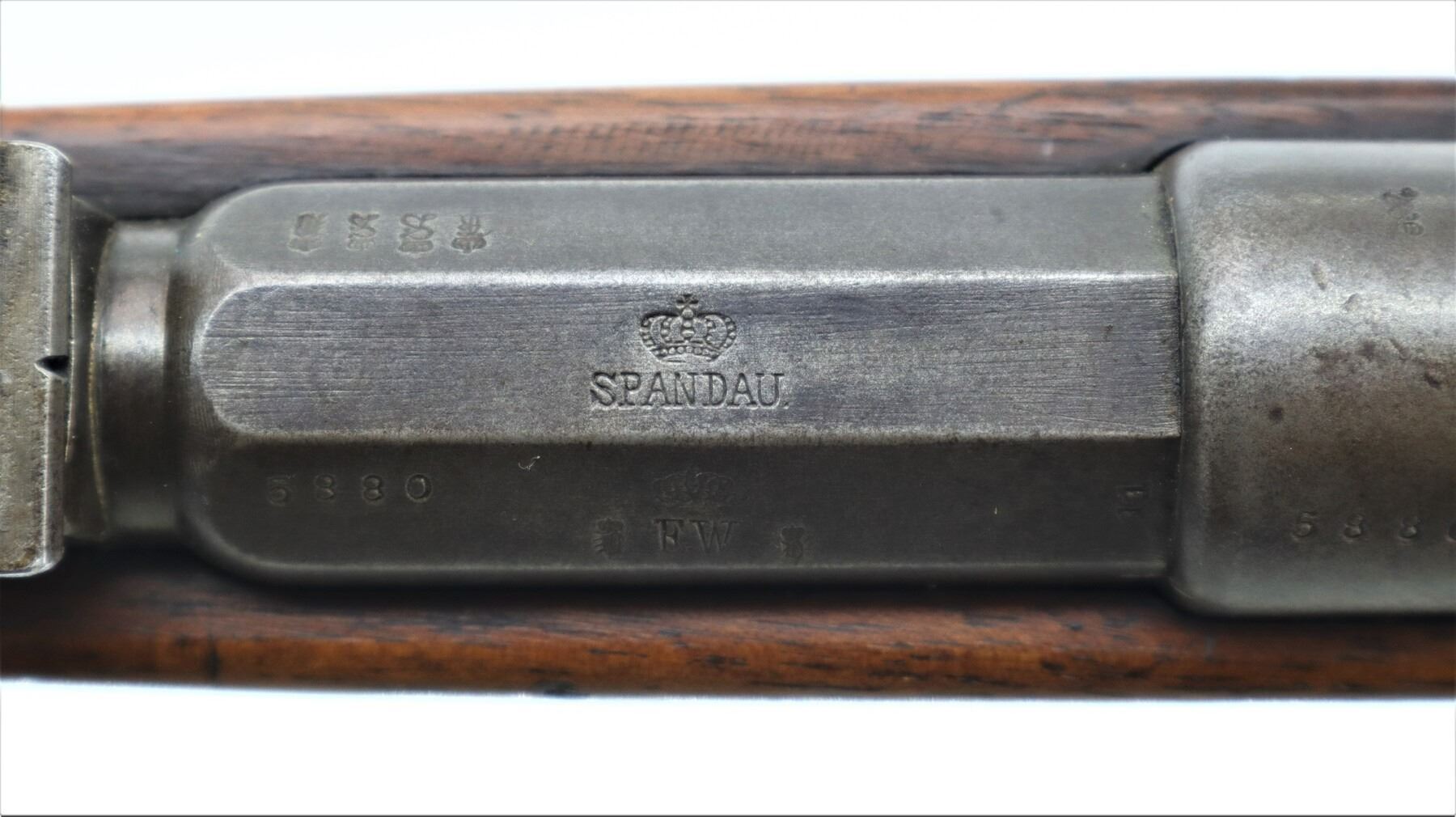 6/10, GERMAN MAUSER, MODEL: 71/84, CALIBER:43 MAUSER, BORE IS GOOD, SLIGHT PITTING, SOME SHINE. MANUFACTURED BY SPANDEL 1888, VISIBLE NUMBERS MATCH. BARLEY CORN FRONT SIGHT WITH RAMP, ADJUSTABLE U NOTCHED LADDER REAR SIGHT, STRAIGHT BOLT HANDLE. ONE PIECE FULL MILITARY WOOD STOCK, STRAIGHT GRIP, SMOOTH STEEL BUTT PLATE, TOP TANG MARKED 11.R.E,2.100. HAS SLING SWIVELS, STACKING HOOK AND BAYONET LUG. METAL FINISH TURNING SILVER GREY WITH LIGHT PITTING, RUST SPECKLES, HANDLING MARKS AND WEAR. STOCK SHOWS MARKS, SCRATCHES AND WEAR. , ACTION: BOLT ACTION RIFLE, BARREL LENGTH: 32", SERIAL # 5880, CONDITION: 6/10, CLASS: CANADIAN NON RESTRICTED