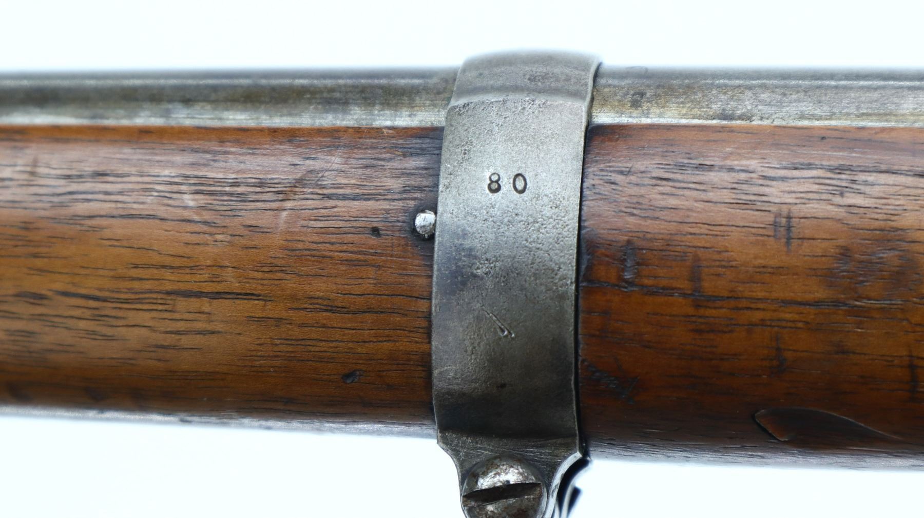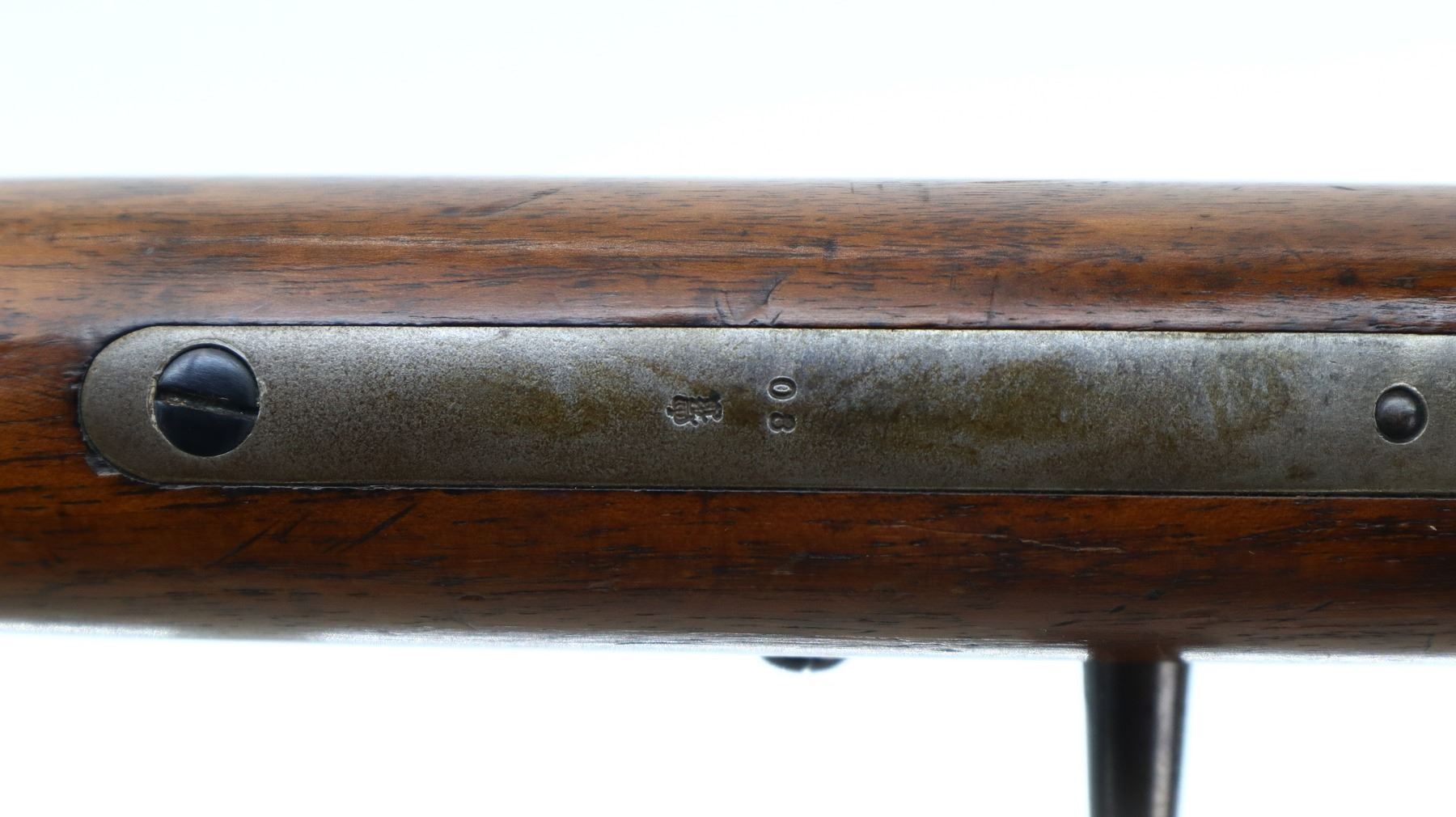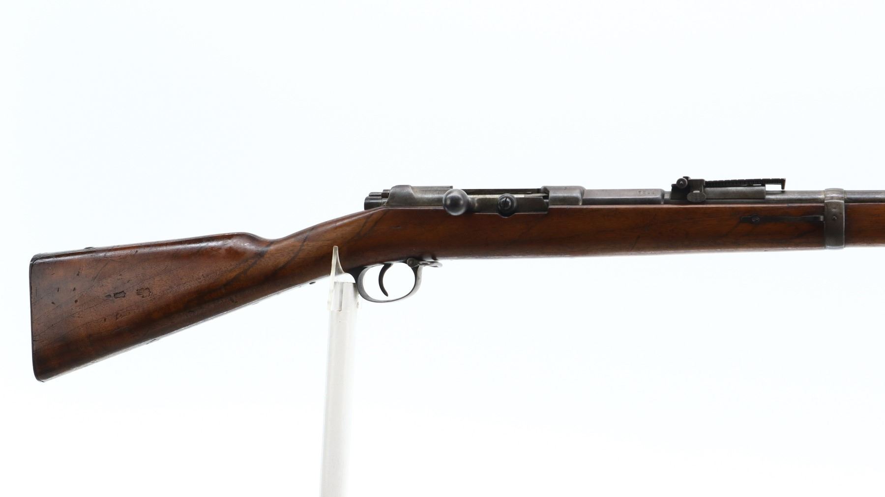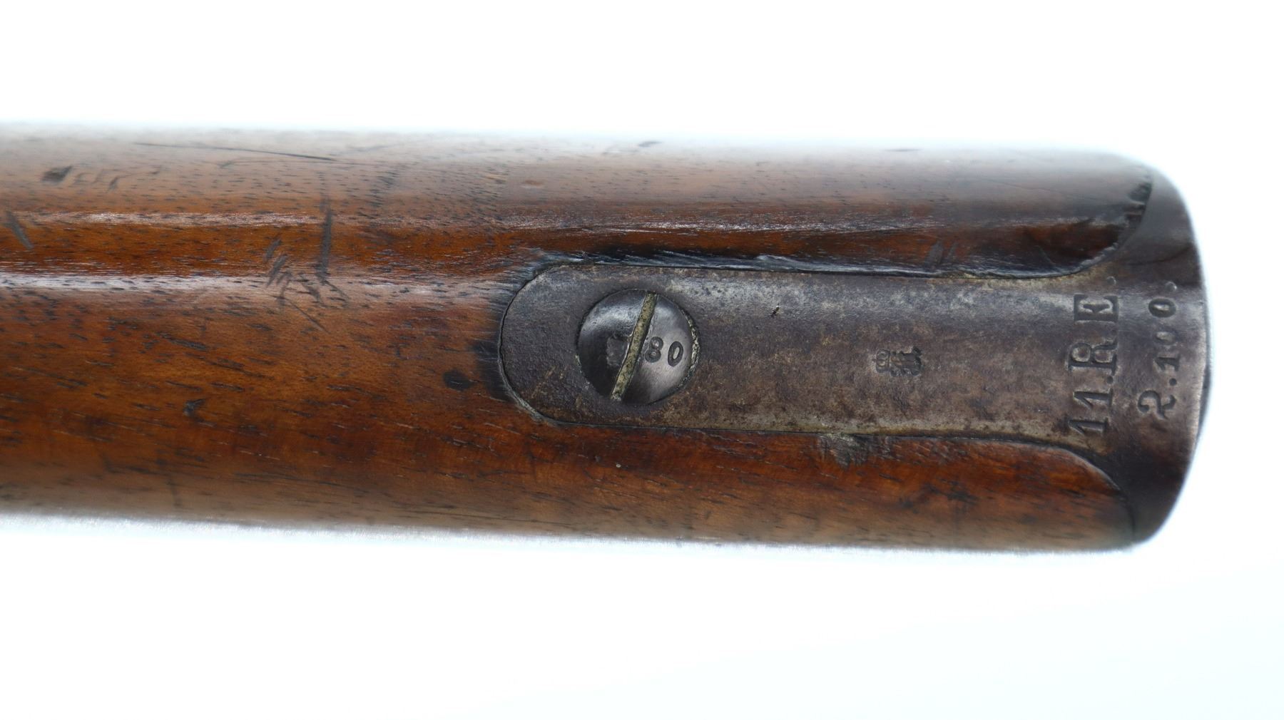 6/10, GERMAN MAUSER, MODEL: 71/84, CALIBER:43 MAUSER, BORE IS GOOD, SLIGHT PITTING, SOME SHINE. MANUFACTURED BY SPANDEL 1888, VISIBLE NUMBERS MATCH. BARLEY CORN FRONT SIGHT WITH RAMP, ADJUSTABLE U NOTCHED LADDER REAR SIGHT, STRAIGHT BOLT HANDLE. ONE PIECE FULL MILITARY WOOD STOCK, STRAIGHT GRIP, SMOOTH STEEL BUTT PLATE, TOP TANG MARKED 11.R.E,2.100. HAS SLING SWIVELS, STACKING HOOK AND BAYONET LUG. METAL FINISH TURNING SILVER GREY WITH LIGHT PITTING, RUST SPECKLES, HANDLING MARKS AND WEAR. STOCK SHOWS MARKS, SCRATCHES AND WEAR. , ACTION: BOLT ACTION RIFLE, BARREL LENGTH: 32", SERIAL # 5880, CONDITION: 6/10, CLASS: CANADIAN NON RESTRICTED