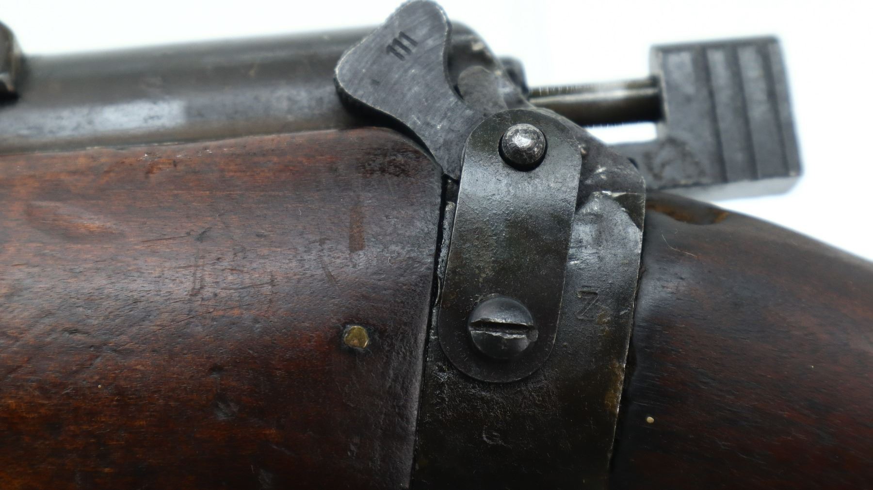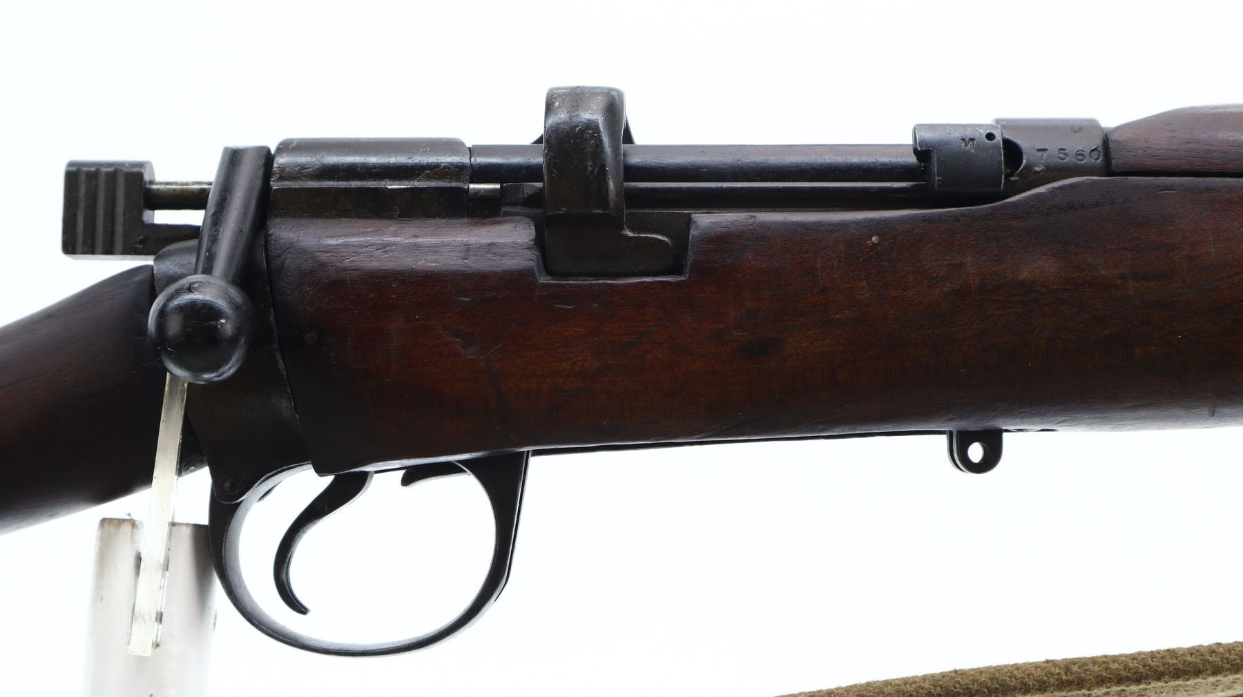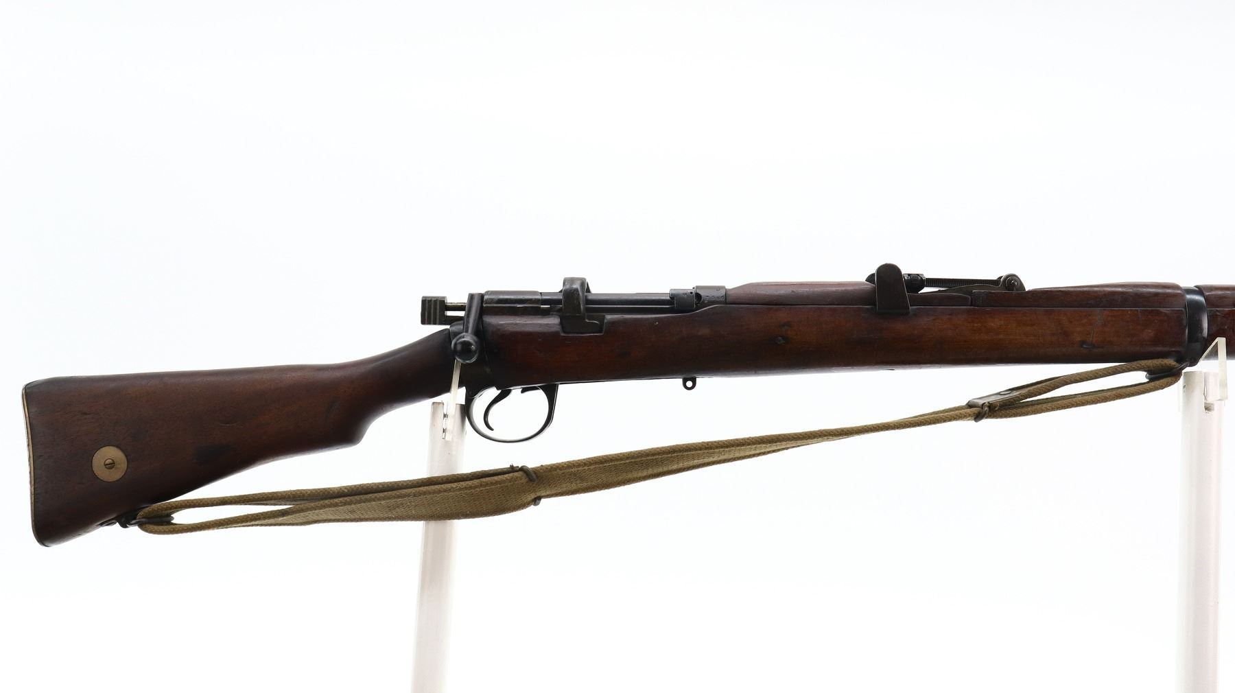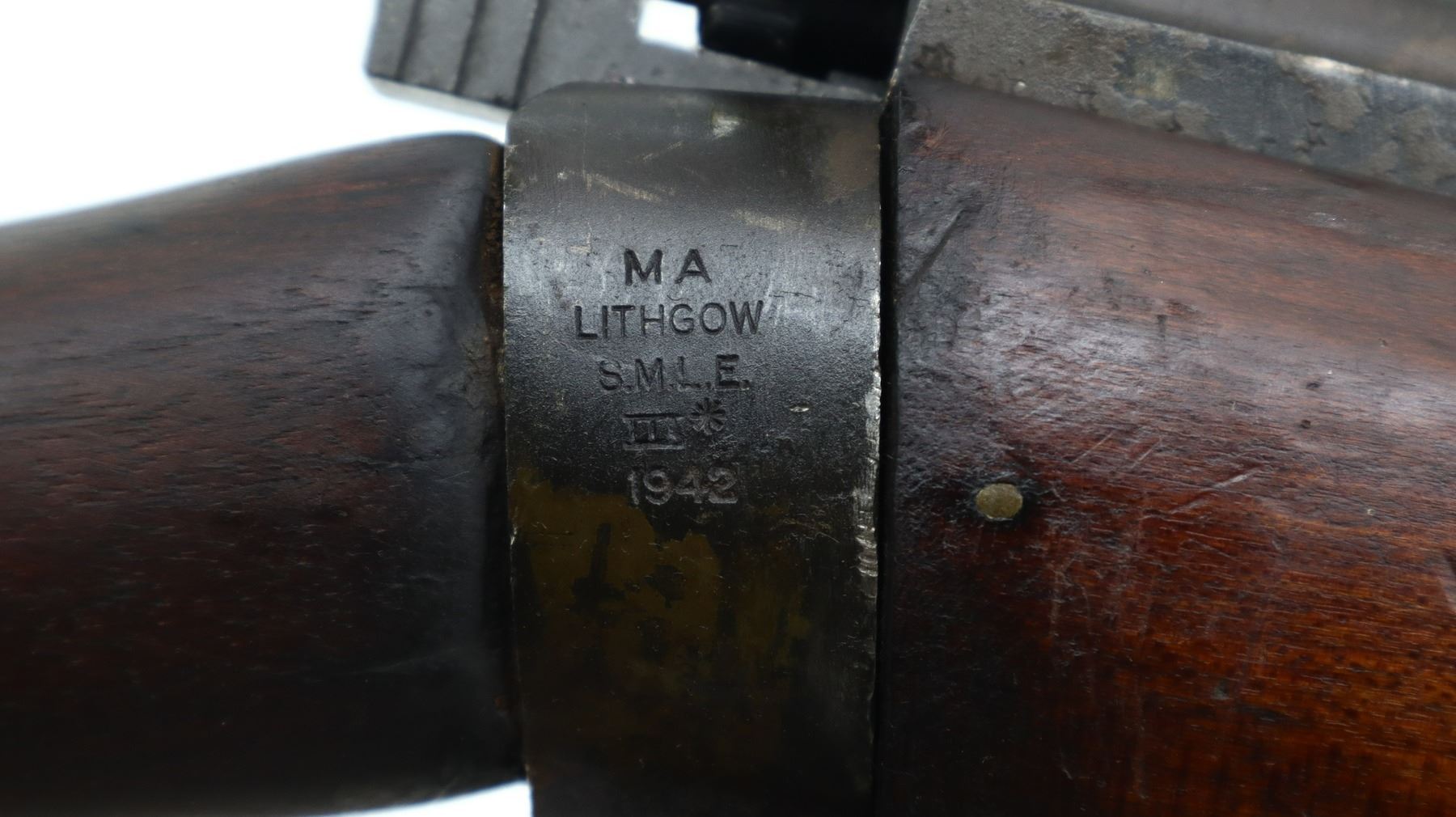 7/10, LEE ENFIELD, MODEL: NO 1 MKIII*, CALIBER:303 BR, DOES NOT COME WITH MAGAZINE, BORE IS FAIR, WORN, LIGHT PITTING. MANUFACTURED BY LITHGOW 1942, NUMBERS MISMATCHED. BLADE FRONT SIGHT WITH EARS AND RAMP, ADJUSTABLE U NOTCHED REAR SIGHT WITH EARS. FOUR PIECE FULL MILITARY WOOD STOCKS, FOREARM HAS THE ISHAPORE SCREW, PISTOL GRIP, SMOOTH BRASS BUTT PLATE WITH TRAP, BRASS STOCK DISK, SWIVELS WITH P37 CANVAS SLING, STACKING SWIVEL, BAYONET LUG. METAL FINISH SHOWS SOME SCRATCHES, HANDLING MARKS AND WEAR. STOCKS SHOW SOME MARKS, SCRATCHES AND WEAR. , ACTION: BOLT ACTION RIFLE, BARREL LENGTH: 25.25", SERIAL # D7560, CONDITION: 7/10, CLASS: CANADIAN NON RESTRICTED