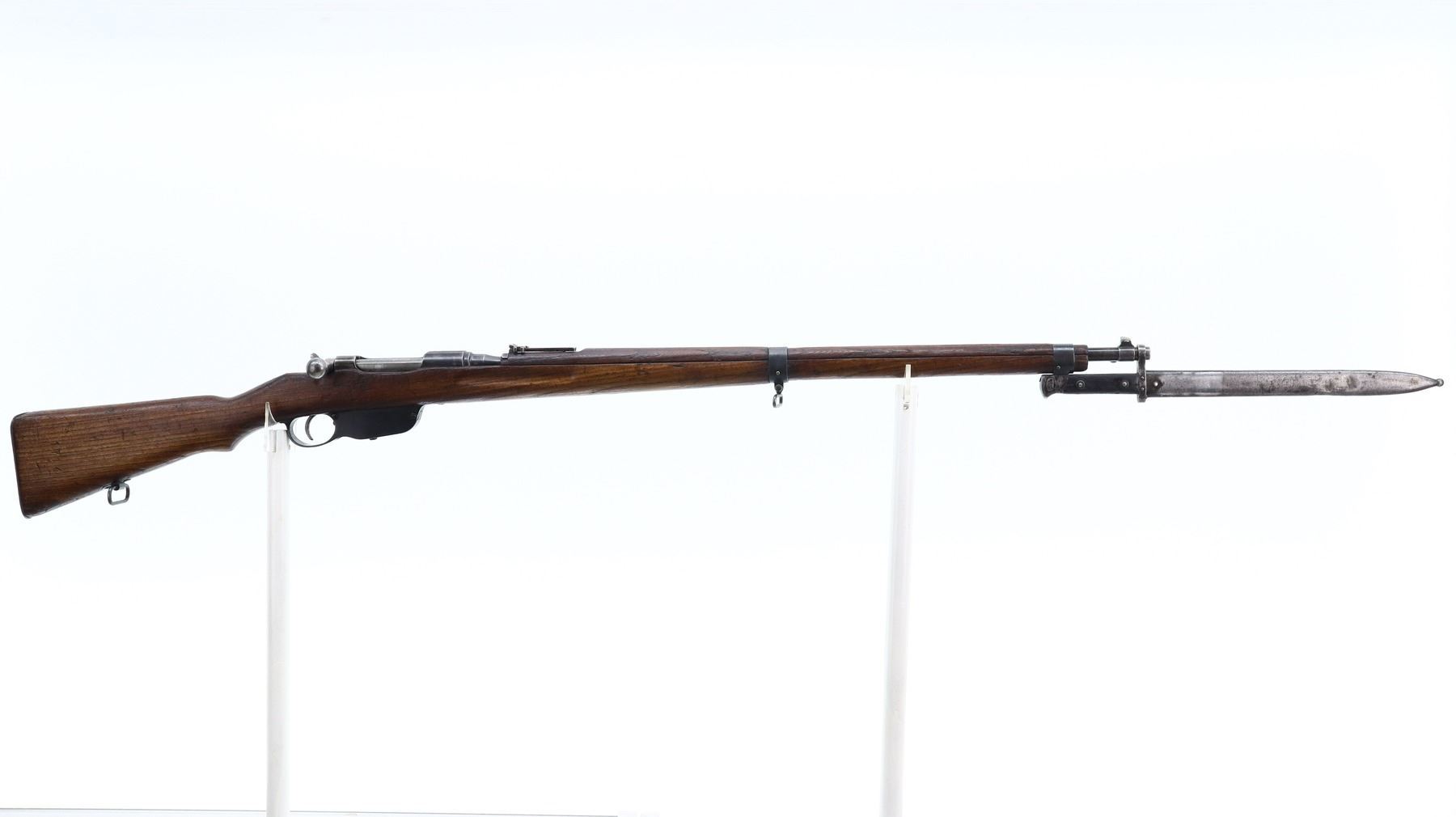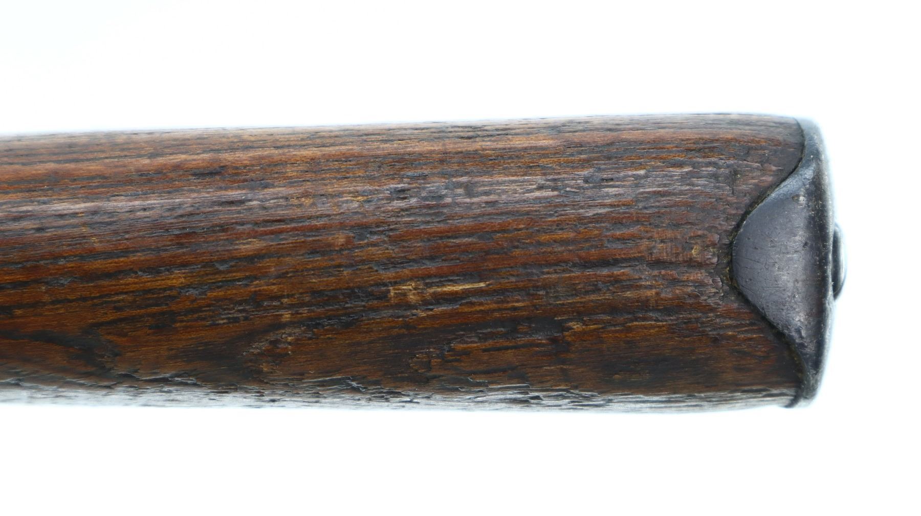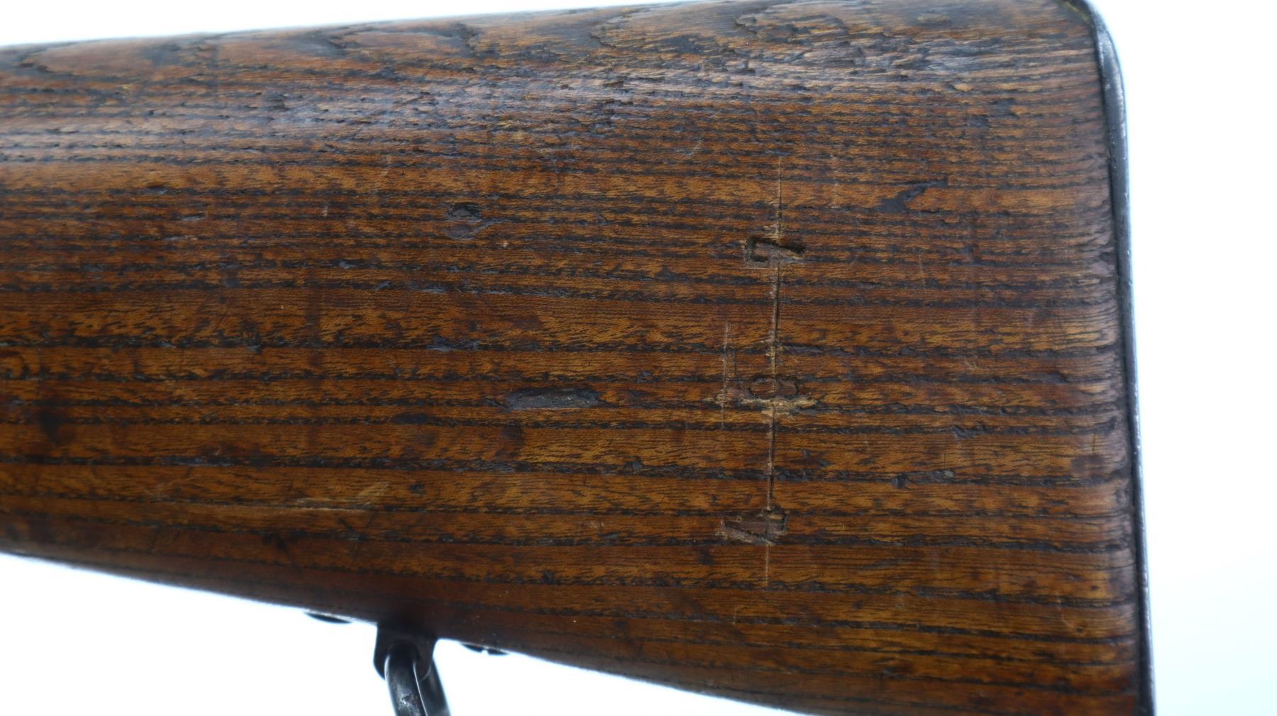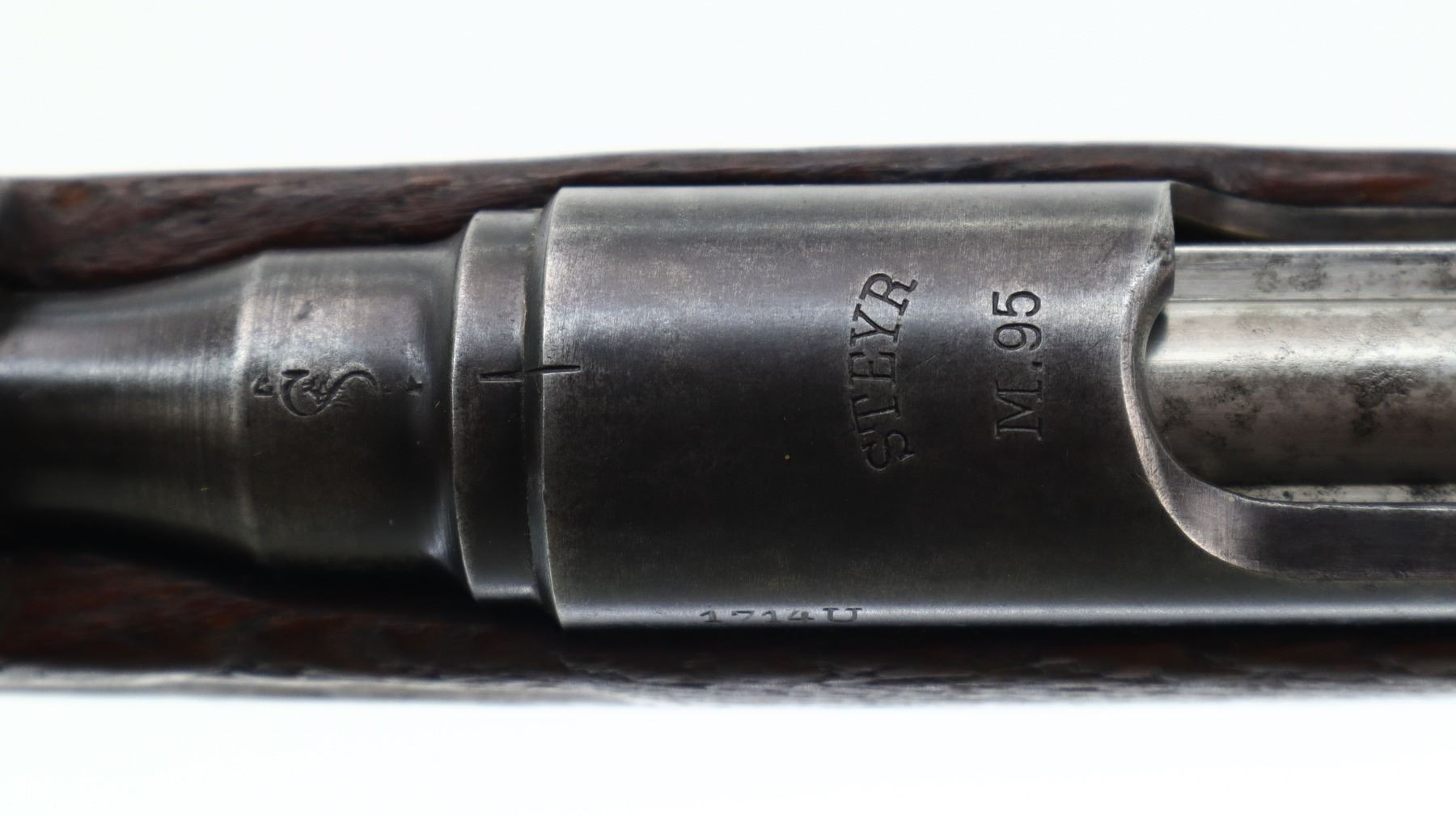 6+/10, STEYR, MODEL: M95, CALIBER:8 X 56R, COMES WITH BAYONET, BORE IS FAIR, WORN, PITTED. MANUFACTURED BY STEYR, ARSENAL REBUILT NUMBERED TO MATCH. BARLEY CORN FRONT SIGHT WITH RAMP, ADJUSTABLE U NOTCHED LADDER REAR SIGHT, STRAIGHT BOLT HANDLE. TWO PIECE FULL MILITARY WOOD STOCKS, FINGER GROOVED FOREND, PISTOL GRIP, SMOOTH STEEL BUTT PLATE, SLING SWIVELS WITH BROWN LEATHER MILITARY SLING, STACKING HOOK, BAYONET LUG. METAL FINISH TURNING SILVER GREY WITH LIGHT PITTING, SCRATCHES, HANDLING MARKS AND WEAR. STOCKS SHOW DINGS, SCRATCHES AND WEAR. , ACTION: STRAIGHT PULL RIFLE, BARREL LENGTH: 30", SERIAL # 1714U, CONDITION: 6+/10, CLASS: CANADIAN NON RESTRICTED