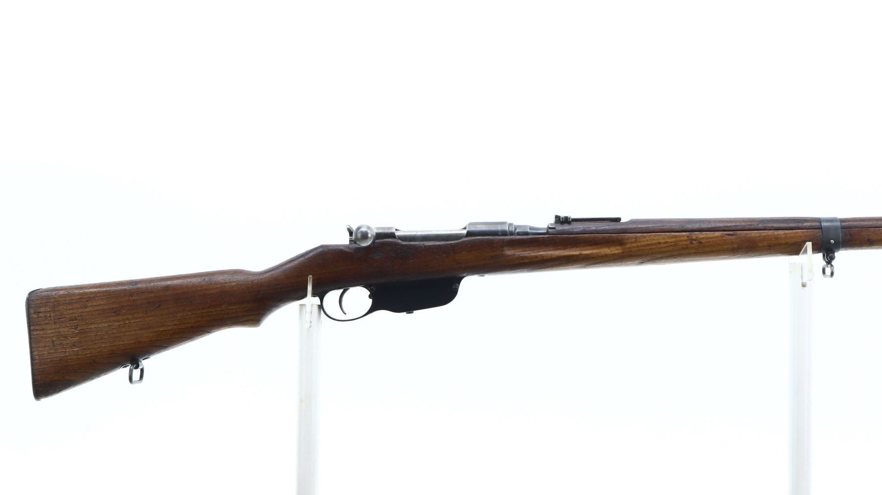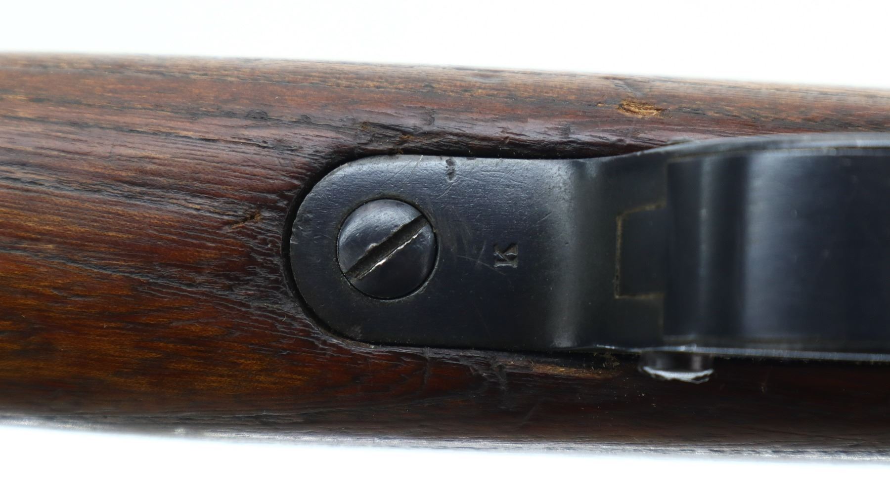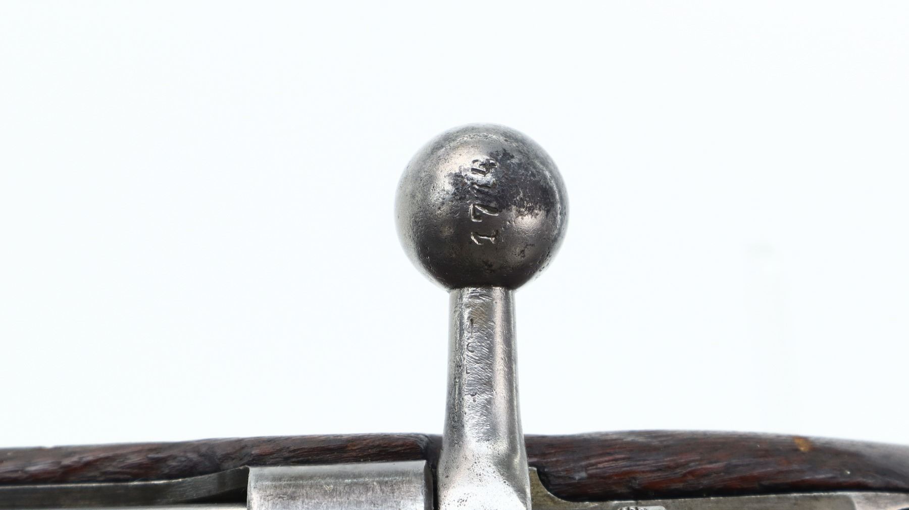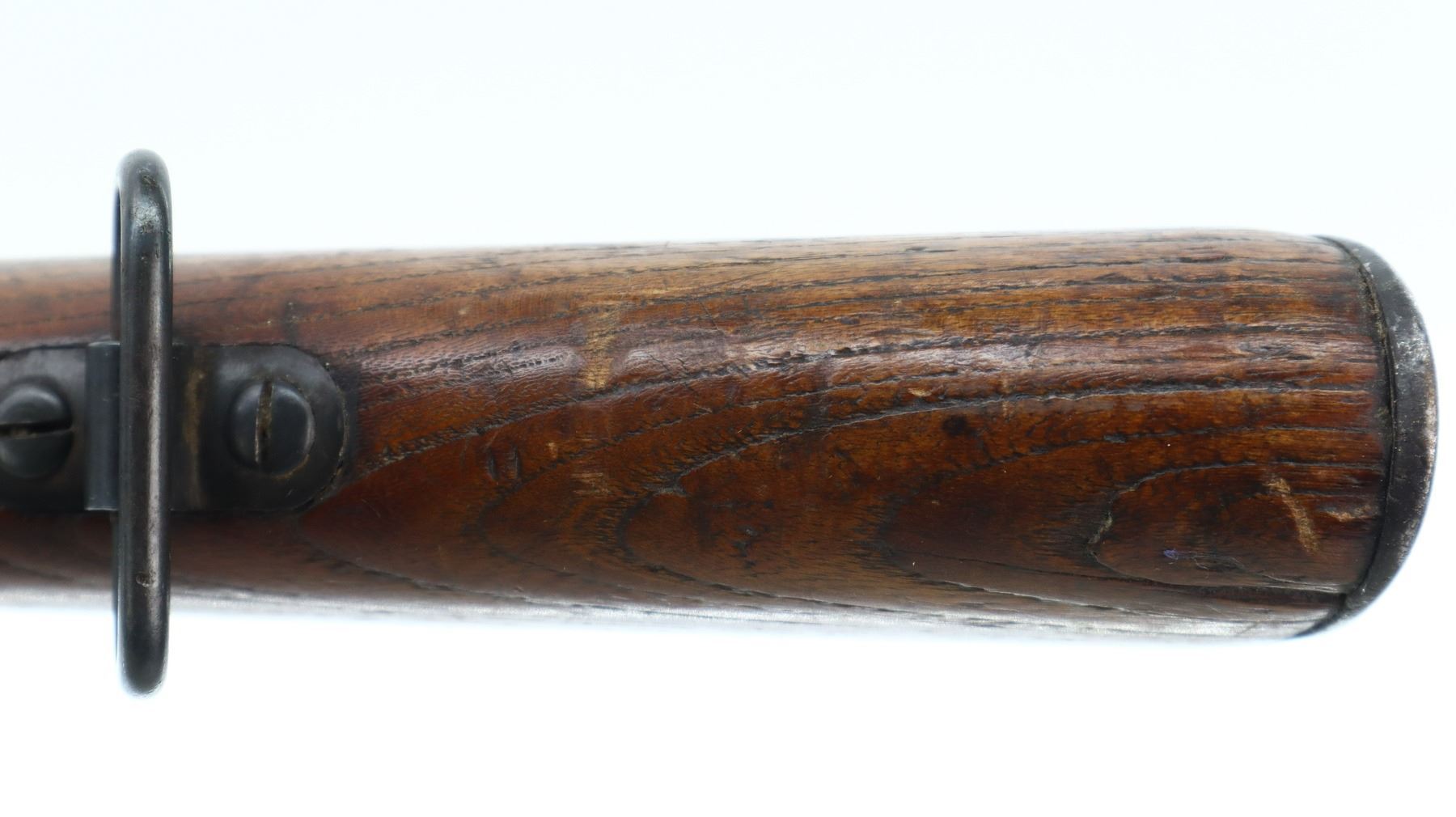 6+/10, STEYR, MODEL: M95, CALIBER:8 X 56R, COMES WITH BAYONET, BORE IS FAIR, WORN, PITTED. MANUFACTURED BY STEYR, ARSENAL REBUILT NUMBERED TO MATCH. BARLEY CORN FRONT SIGHT WITH RAMP, ADJUSTABLE U NOTCHED LADDER REAR SIGHT, STRAIGHT BOLT HANDLE. TWO PIECE FULL MILITARY WOOD STOCKS, FINGER GROOVED FOREND, PISTOL GRIP, SMOOTH STEEL BUTT PLATE, SLING SWIVELS WITH BROWN LEATHER MILITARY SLING, STACKING HOOK, BAYONET LUG. METAL FINISH TURNING SILVER GREY WITH LIGHT PITTING, SCRATCHES, HANDLING MARKS AND WEAR. STOCKS SHOW DINGS, SCRATCHES AND WEAR. , ACTION: STRAIGHT PULL RIFLE, BARREL LENGTH: 30", SERIAL # 1714U, CONDITION: 6+/10, CLASS: CANADIAN NON RESTRICTED