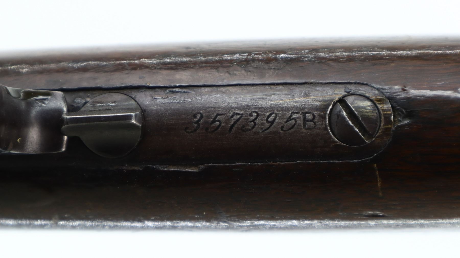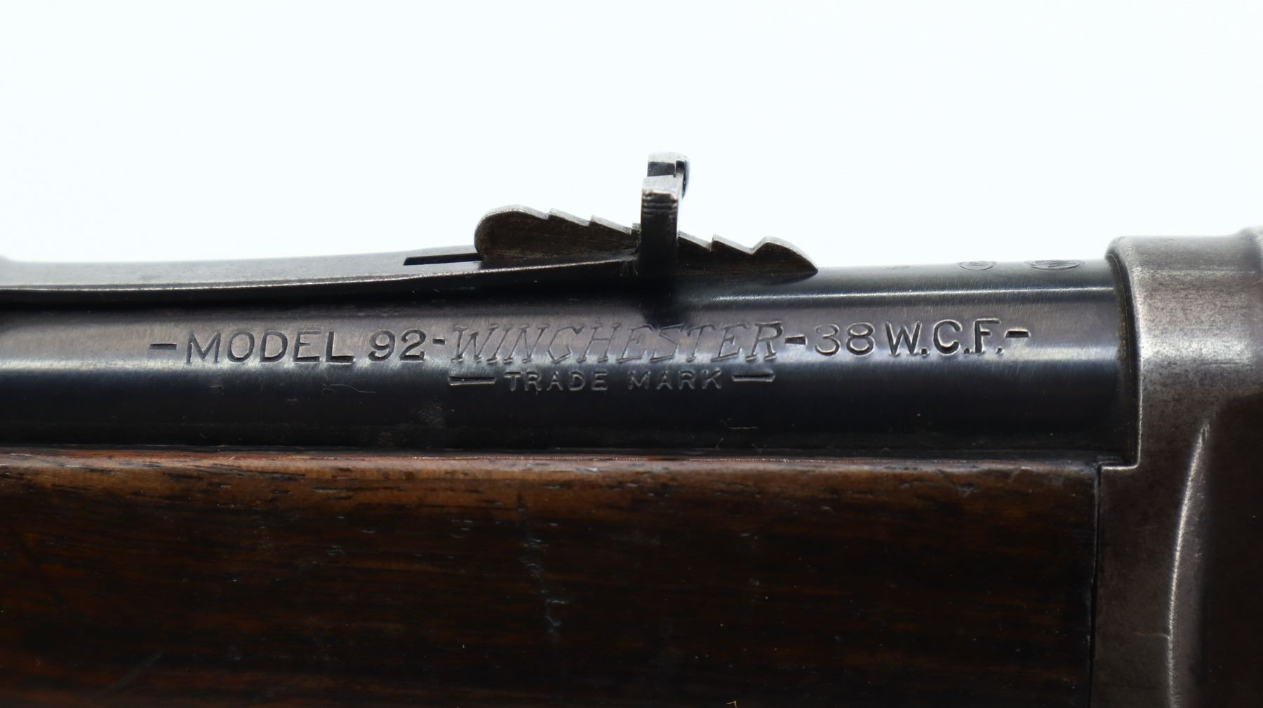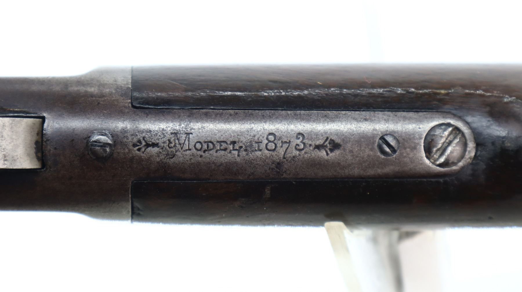 6+/10, WINCHESTER, MODEL: 1873 CUSTOM, CALIBER:38 WCF, BORE IS VERY GOOD. MANUFACTURED 1890. BLADE FRONT SIGHT WITH RAMP, ADJUSTABLE U NOTCHED REAR SIGHT, BARREL IS A FACTORY WINCHESTER MODEL 92 IN 38 WCF, DUST COVER, CHECKERED SPUR HAMMER. TWO PIECE WOOD STOCKS, STRAIGHT GRIP, SMOOTH CURVED STEEL BUTT PLATE WITH BRASS TRAP, MAG TUBE SHORTENED, BARREL BAND SLOT HAS BEEN FILLED IN. METAL FINISH SHOWS SOME PITTING, SCRATCHES, HANDLING MARKS AND WEAR. STOCKS SHOW SOME MARKS, SCRATCHES AND WEAR. , ACTION: LEVER ACTION RIFLE, BARREL LENGTH: 19.75", SERIAL # 357395B, CONDITION: 6+/10, CLASS: CANADIAN NON RESTRICTED