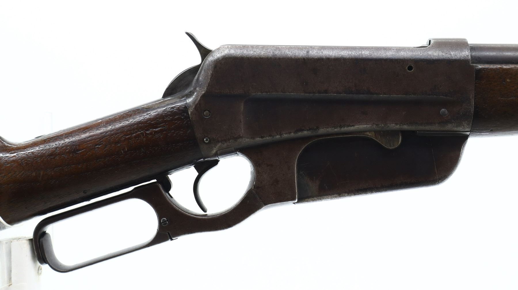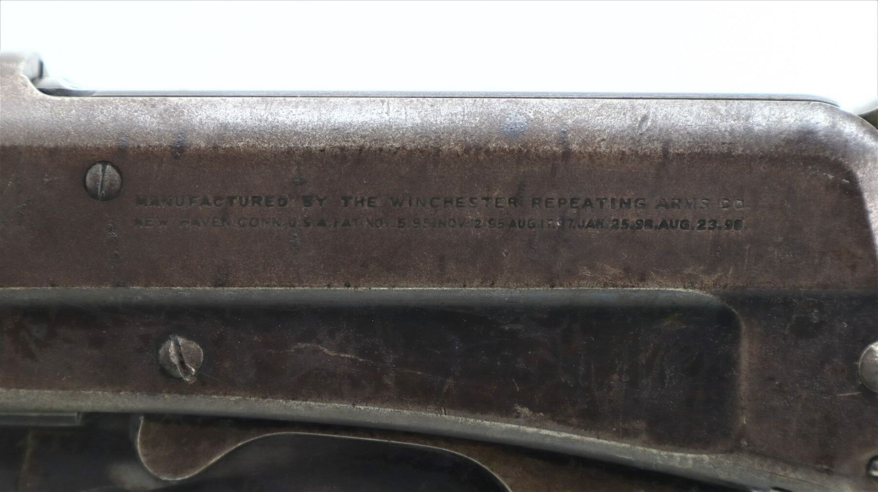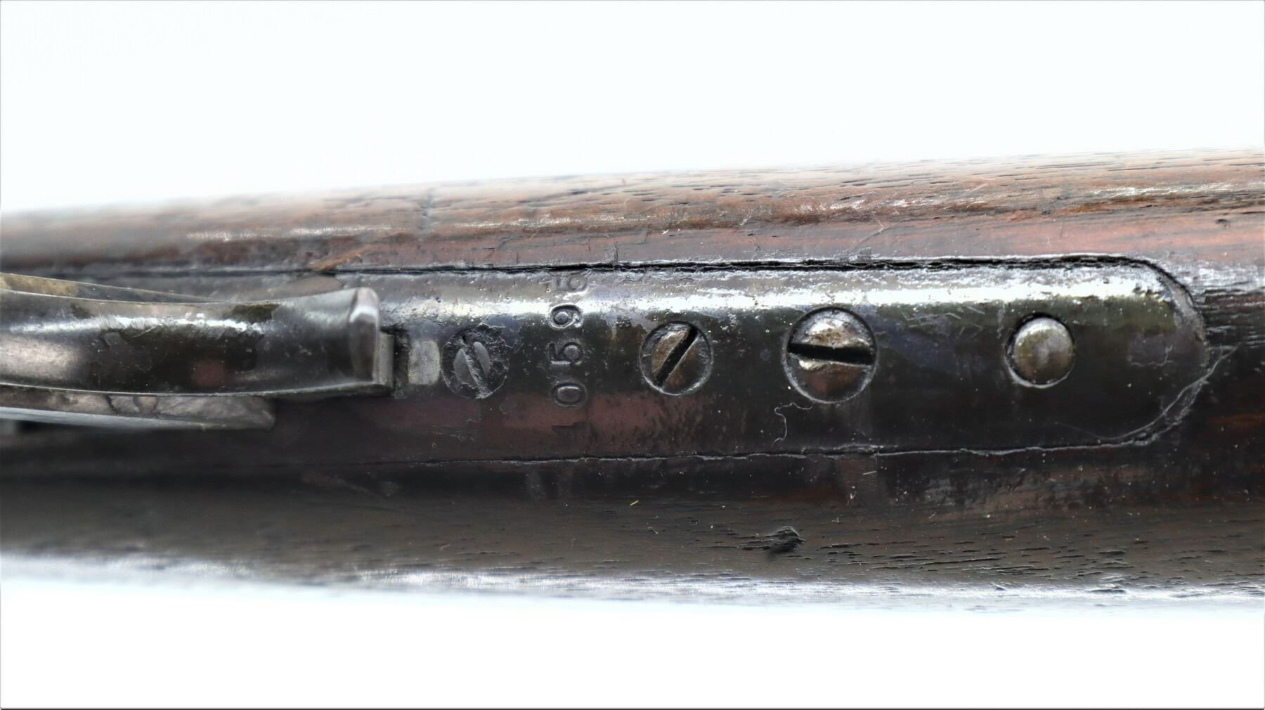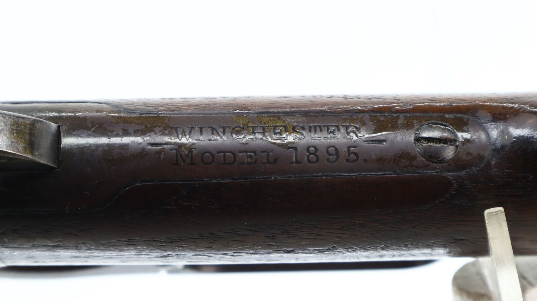 6/10, WINCHESTER, MODEL: 1895, CALIBER:40-72 WCF, BORE IS FAIR, WORN, LIGHT PITTING. MANUFACTURED 1903. BLADE FRONT SIGHT, ADJUSTABLE U NOTCHED SEMI BUCKHORN REAR SIGHT, TAPERED ROUND BARREL, CHECKERED SPUR HAMMER. TWO PIECE WOOD STOCKS, SCHNABEL FOREND TIP WITH BLACK INSERT, STRAIGHT GRIP, SMOOTH CURVED STEEL BUTT PLATE. METAL FINISH TURNING BROWN WITH LIGHT PITTING, RUST SPECKLES, HANDLING MARKS AND WEAR. STOCKS SHOW MARKS, SCRATCHES AND WEAR. , ACTION: LEVER ACTION RIFLE, BARREL LENGTH: 26", SERIAL # 40595, CONDITION: 6/10, CLASS: CANADIAN NON RESTRICTED