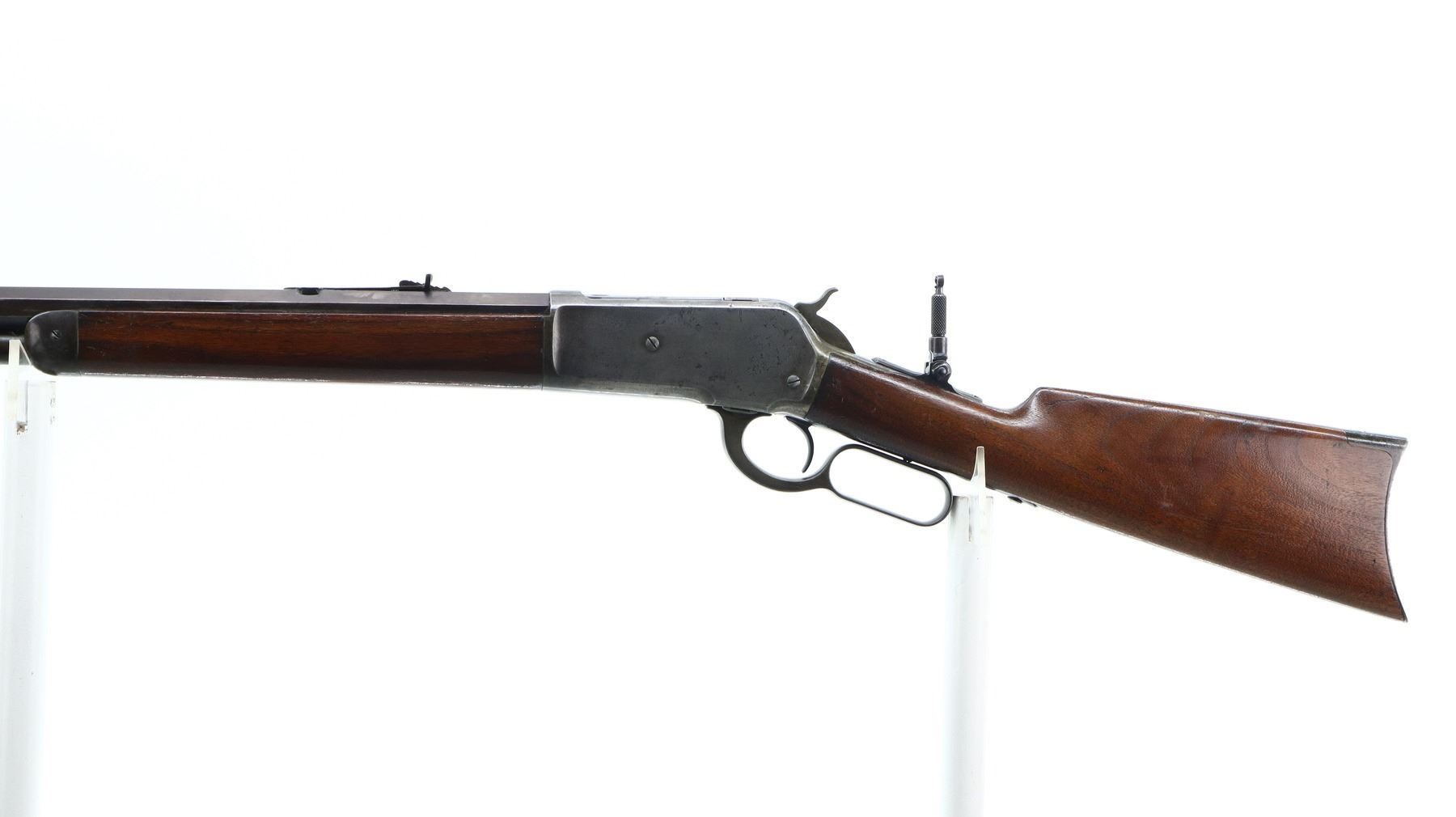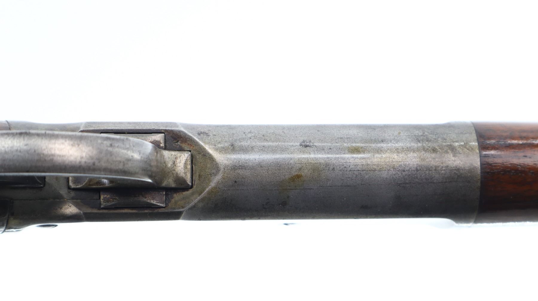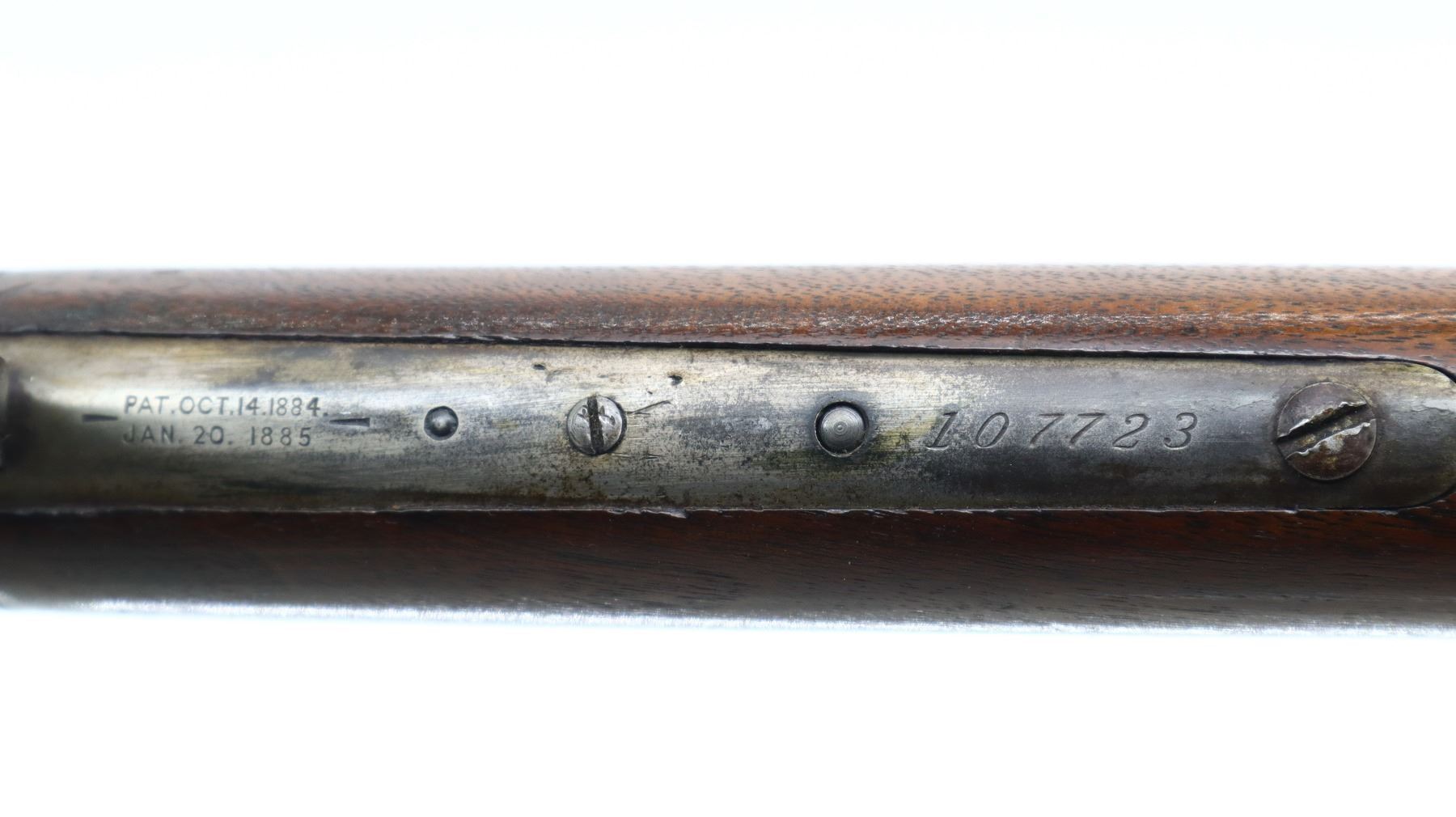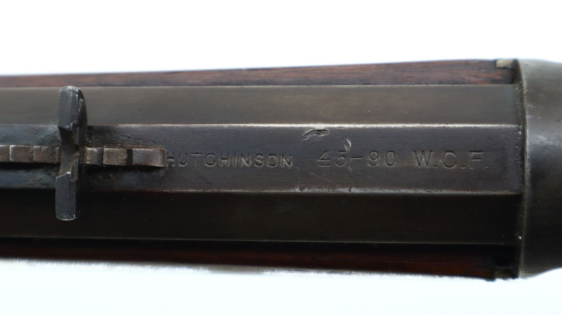 6/10, WINCHESTER, MODEL: 1886 RIFLE, CALIBER:45-90 , BORE IS GOOD, LIGHT PITTING, SOME SHINE. MANUFACTURED 1896. BLADE FRONT SIGHT, MODIFIED ADJUSTABLE U NOTCHED REAR SIGHT, OCTAGON BARREL STAMPED H.HUTCHINSON BEHIND REAR SIGHT IN FRONT OF CALIBER MARKING, CHECKERED SPUR HAMMER, TANG DRILLED AND TAPPED WITH ADJUSTABLE FOLDING PEEP SIGHT. TWO PIECE SMOOTH WOOD STOCKS, STRAIGHT GRIP, SMOOTH CURVED STEEL BUTT PLATE, FULL LENGTH MAG TUBE. METAL FINISH SHOWS LIGHT PITTING, SCRATCHES, HANDLING MARKS AND WEAR. STOCKS SHOW SOME MARKS, SCRATCHES AND WEAR. , ACTION: LEVER ACTION RIFLE, BARREL LENGTH: 25.75", SERIAL # 107723, CONDITION: 6/10, CLASS: CANADIAN NON RESTRICTED