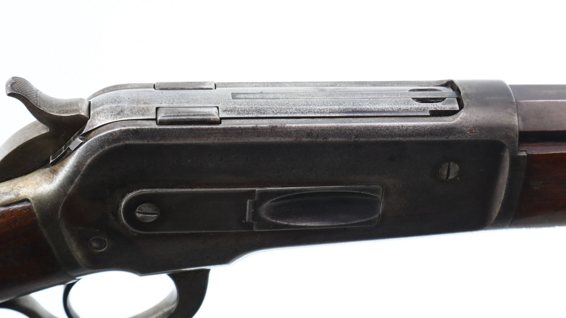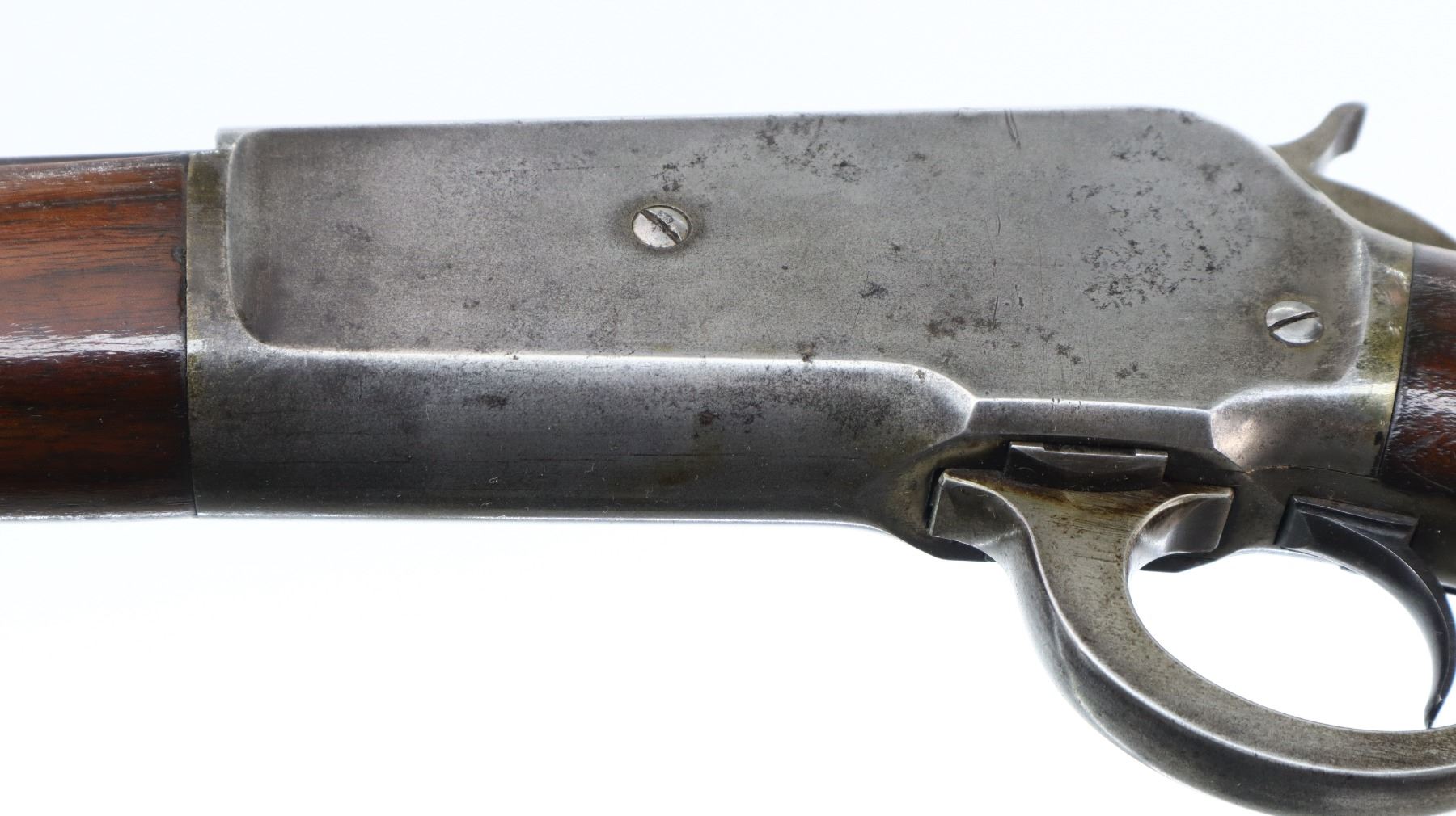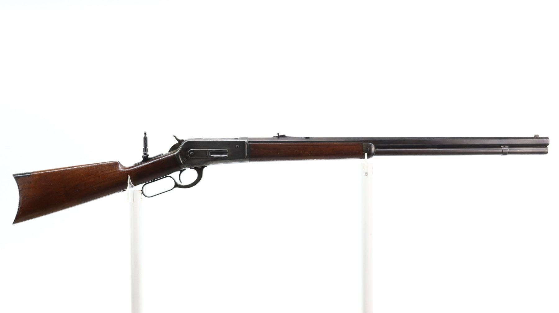 6/10, WINCHESTER, MODEL: 1886 RIFLE, CALIBER:45-90 , BORE IS GOOD, LIGHT PITTING, SOME SHINE. MANUFACTURED 1896. BLADE FRONT SIGHT, MODIFIED ADJUSTABLE U NOTCHED REAR SIGHT, OCTAGON BARREL STAMPED H.HUTCHINSON BEHIND REAR SIGHT IN FRONT OF CALIBER MARKING, CHECKERED SPUR HAMMER, TANG DRILLED AND TAPPED WITH ADJUSTABLE FOLDING PEEP SIGHT. TWO PIECE SMOOTH WOOD STOCKS, STRAIGHT GRIP, SMOOTH CURVED STEEL BUTT PLATE, FULL LENGTH MAG TUBE. METAL FINISH SHOWS LIGHT PITTING, SCRATCHES, HANDLING MARKS AND WEAR. STOCKS SHOW SOME MARKS, SCRATCHES AND WEAR. , ACTION: LEVER ACTION RIFLE, BARREL LENGTH: 25.75", SERIAL # 107723, CONDITION: 6/10, CLASS: CANADIAN NON RESTRICTED