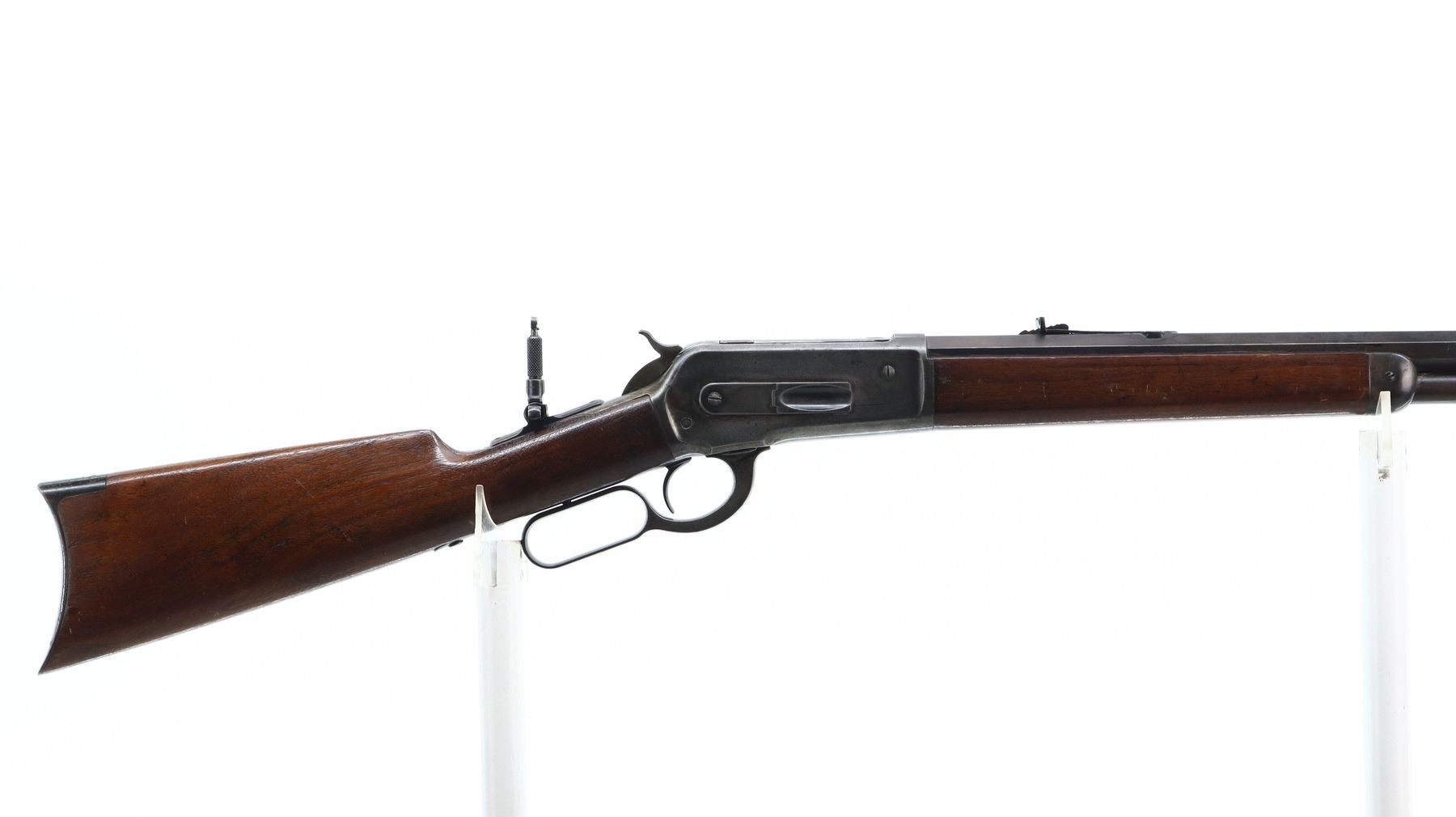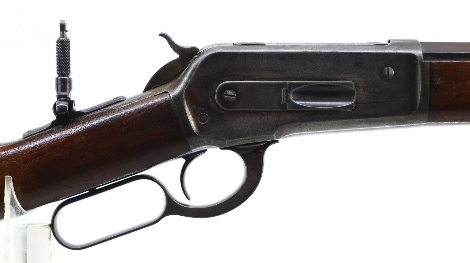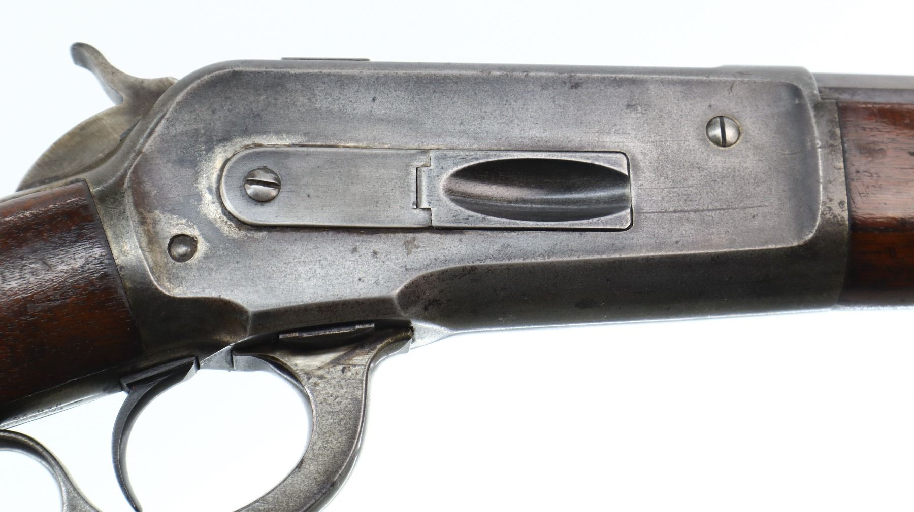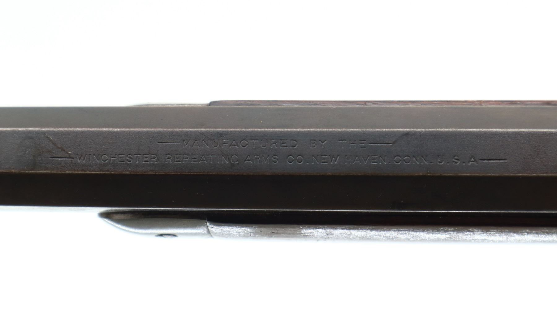 6/10, WINCHESTER, MODEL: 1886 RIFLE, CALIBER:45-90 , BORE IS GOOD, LIGHT PITTING, SOME SHINE. MANUFACTURED 1896. BLADE FRONT SIGHT, MODIFIED ADJUSTABLE U NOTCHED REAR SIGHT, OCTAGON BARREL STAMPED H.HUTCHINSON BEHIND REAR SIGHT IN FRONT OF CALIBER MARKING, CHECKERED SPUR HAMMER, TANG DRILLED AND TAPPED WITH ADJUSTABLE FOLDING PEEP SIGHT. TWO PIECE SMOOTH WOOD STOCKS, STRAIGHT GRIP, SMOOTH CURVED STEEL BUTT PLATE, FULL LENGTH MAG TUBE. METAL FINISH SHOWS LIGHT PITTING, SCRATCHES, HANDLING MARKS AND WEAR. STOCKS SHOW SOME MARKS, SCRATCHES AND WEAR. , ACTION: LEVER ACTION RIFLE, BARREL LENGTH: 25.75", SERIAL # 107723, CONDITION: 6/10, CLASS: CANADIAN NON RESTRICTED