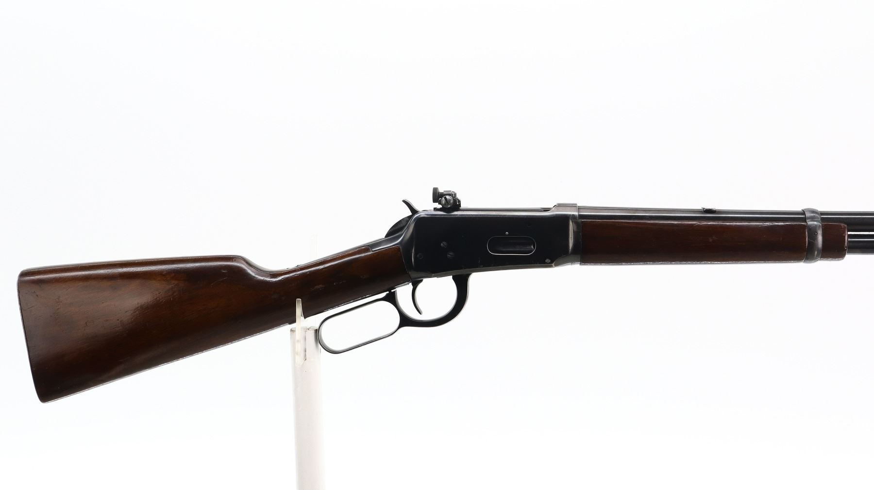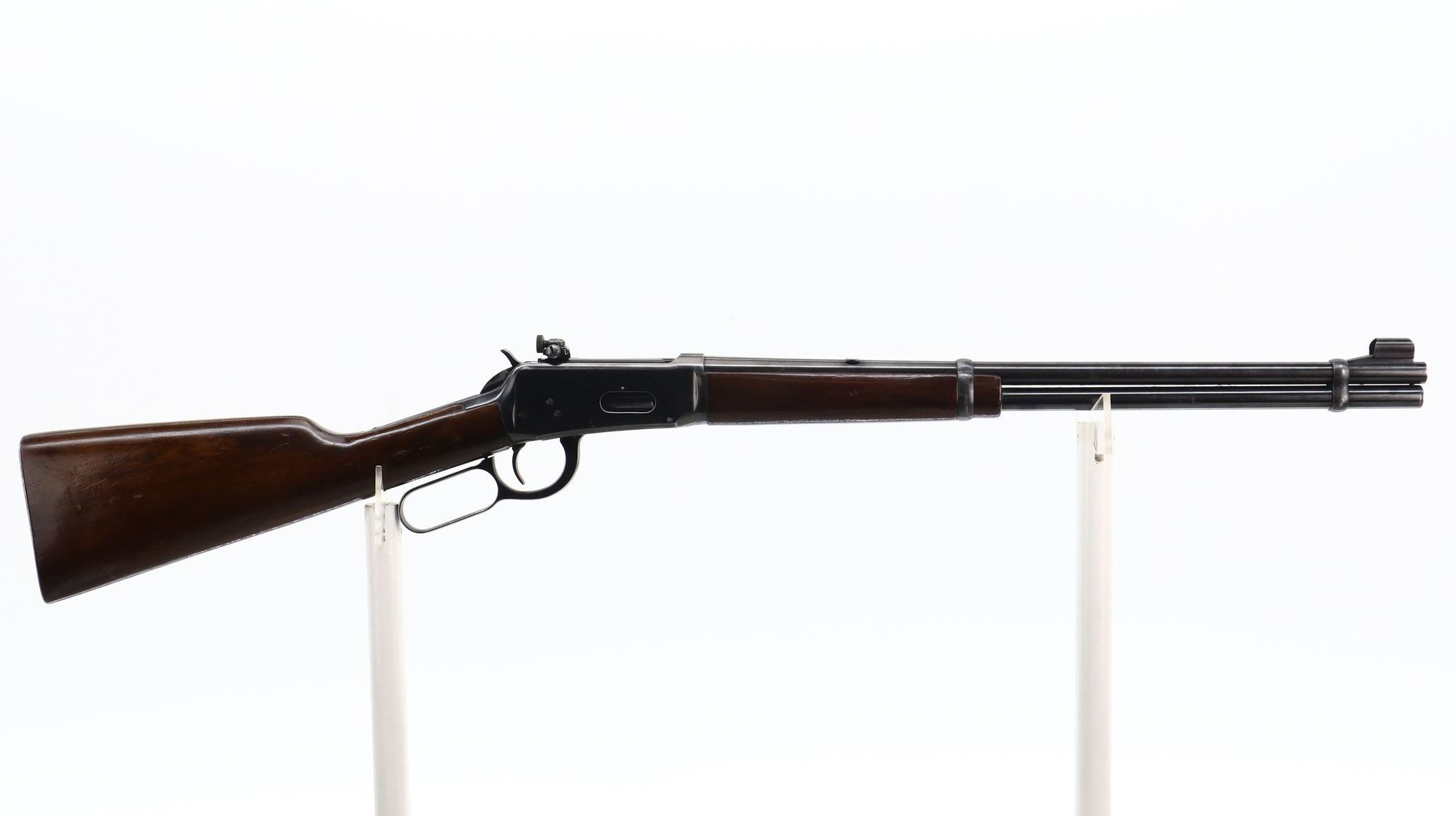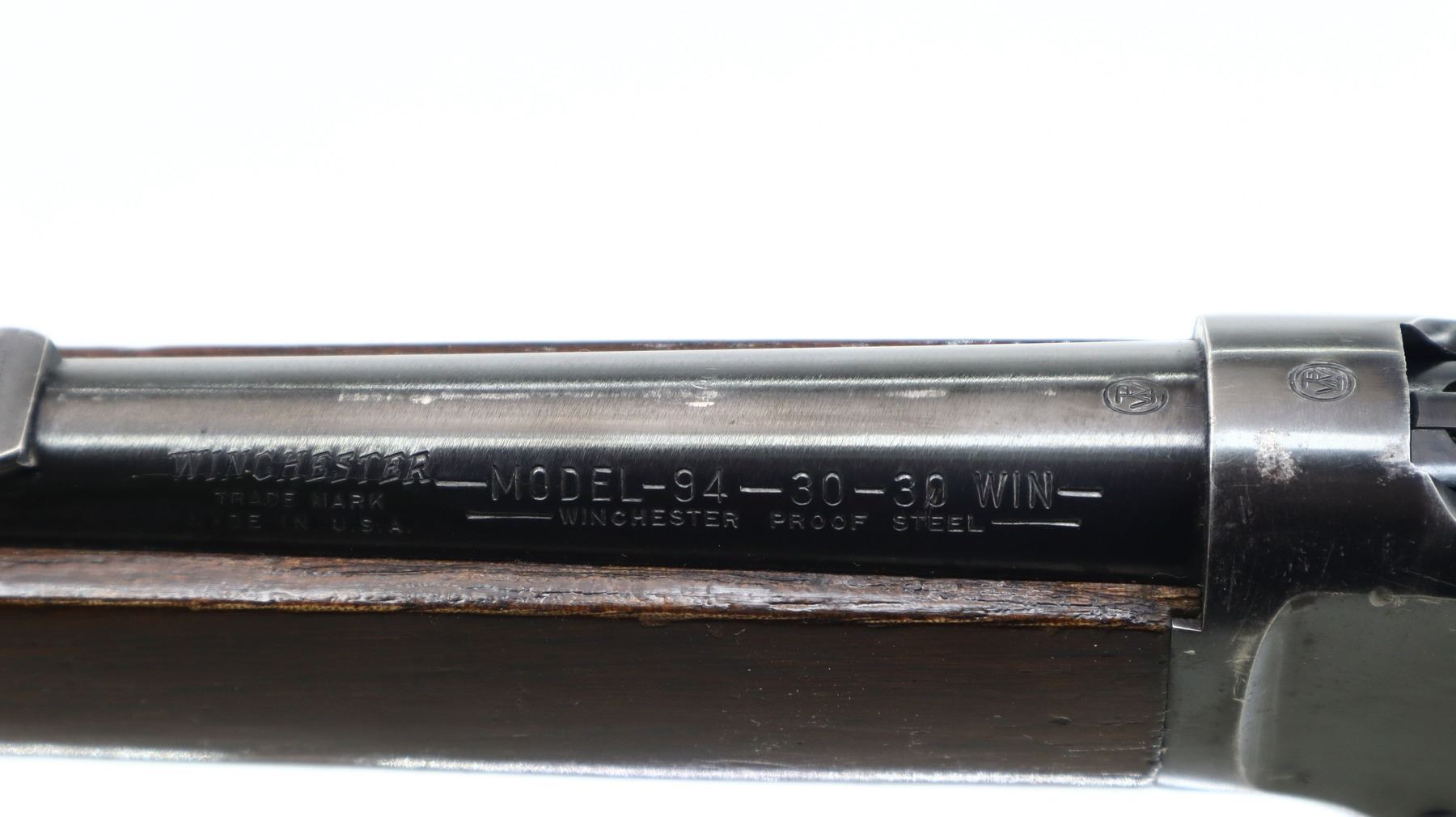 7/10, WINCHESTER, MODEL: MODEL 94 CARBINE PRE 64, CALIBER:30-30 WIN, BORE IS VERY GOOD. MANUFACTURED 1955. BLADE FRONT SIGHT WITH HOOD AND RAMP, REAR SIGHT REMOVED SLOT BLANK INSTALLED, RECEIVER DRILLED AND TAPPED WITH LYMAN 56 ADJUSTABLE PEEP SIGHT INSTALLED, GROOVED SPUR HAMMER. TWO PIECE SMOOTH WOOD STOCKS, STRAIGHT GRIP, CHECKERED STEEL BUTT PLATE, FULL LENGTH MAG TUBE. METAL FINISH SHOWS SCRATCHES, HANDLING MARKS AND WEAR. STOCKS SHOW SOME MARKS, SCRATCHES AND WEAR. , ACTION: LEVER ACTION RIFLE, BARREL LENGTH: 20", SERIAL # 2124014, CONDITION: 7/10, CLASS: CANADIAN NON RESTRICTED