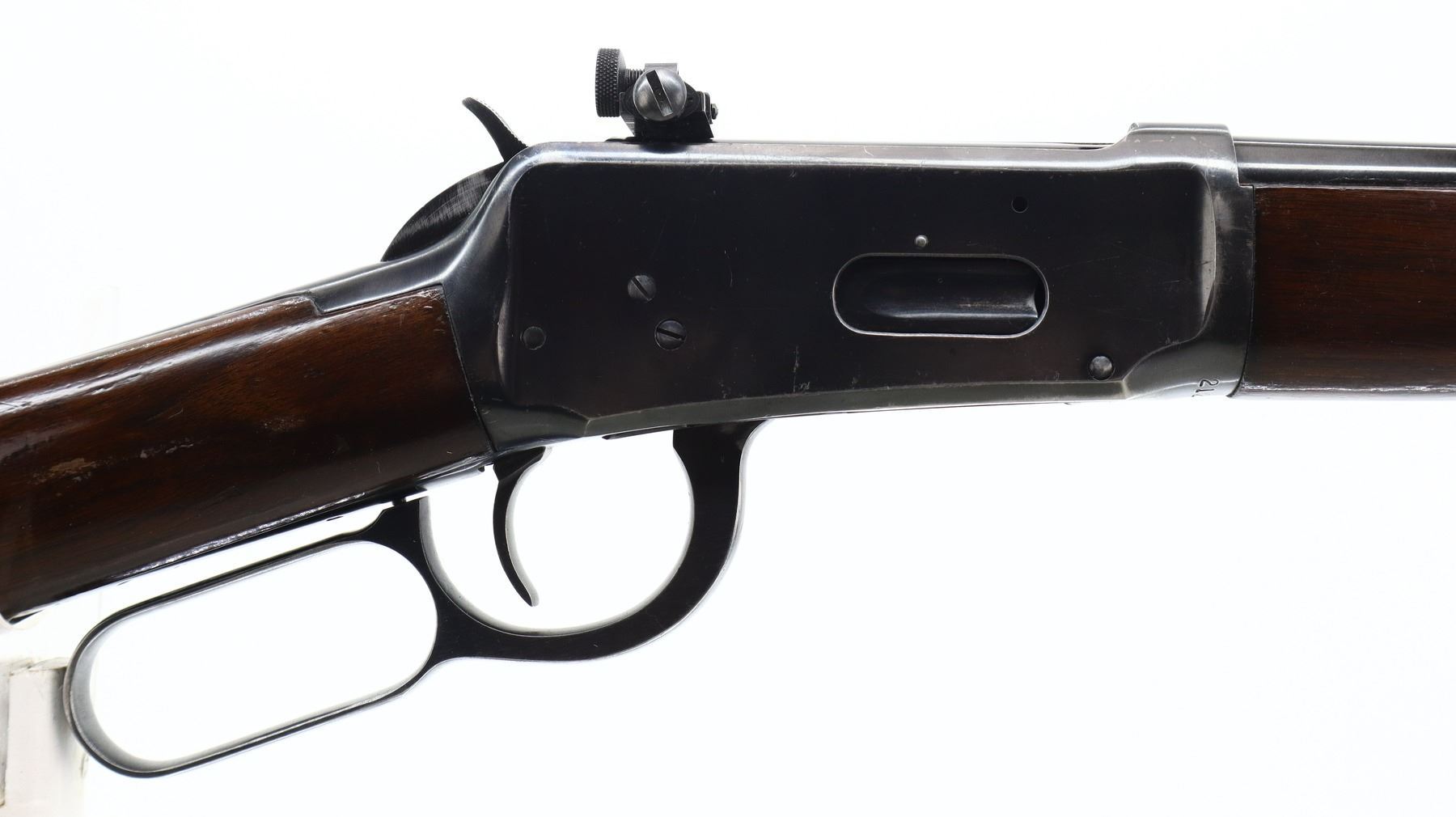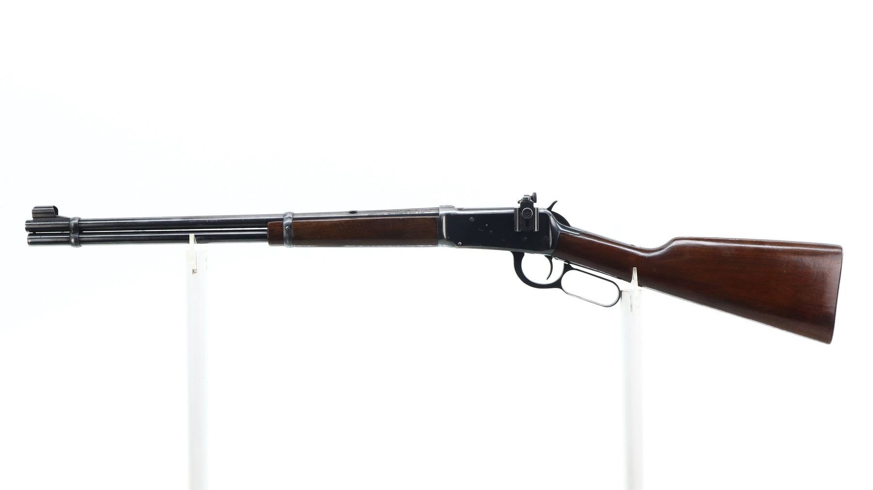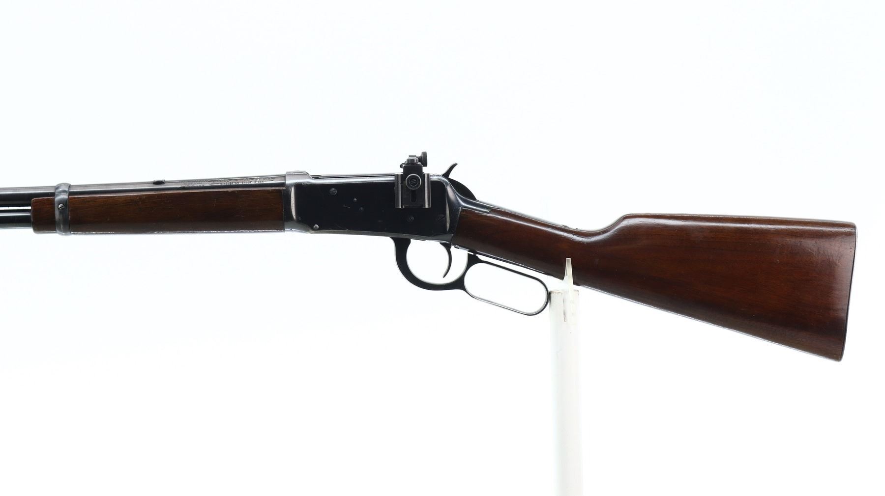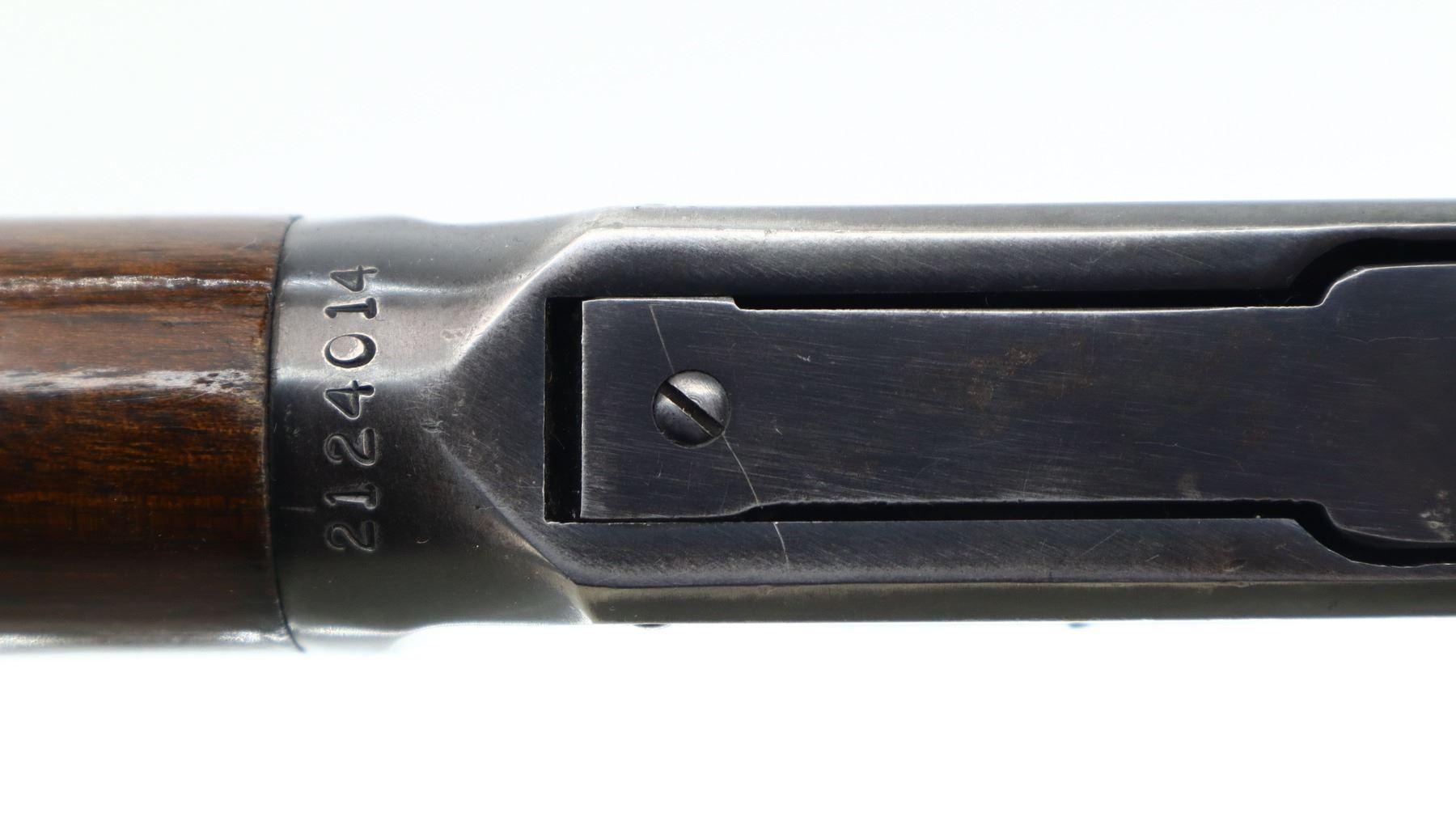 7/10, WINCHESTER, MODEL: MODEL 94 CARBINE PRE 64, CALIBER:30-30 WIN, BORE IS VERY GOOD. MANUFACTURED 1955. BLADE FRONT SIGHT WITH HOOD AND RAMP, REAR SIGHT REMOVED SLOT BLANK INSTALLED, RECEIVER DRILLED AND TAPPED WITH LYMAN 56 ADJUSTABLE PEEP SIGHT INSTALLED, GROOVED SPUR HAMMER. TWO PIECE SMOOTH WOOD STOCKS, STRAIGHT GRIP, CHECKERED STEEL BUTT PLATE, FULL LENGTH MAG TUBE. METAL FINISH SHOWS SCRATCHES, HANDLING MARKS AND WEAR. STOCKS SHOW SOME MARKS, SCRATCHES AND WEAR. , ACTION: LEVER ACTION RIFLE, BARREL LENGTH: 20", SERIAL # 2124014, CONDITION: 7/10, CLASS: CANADIAN NON RESTRICTED