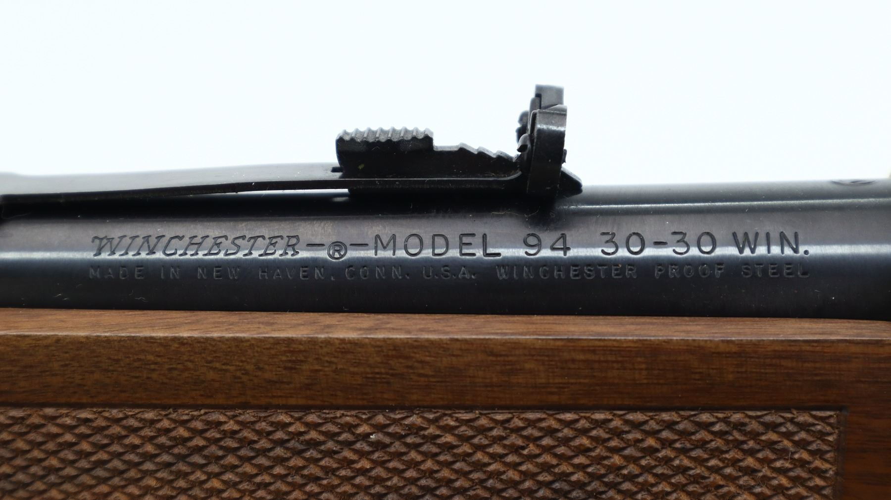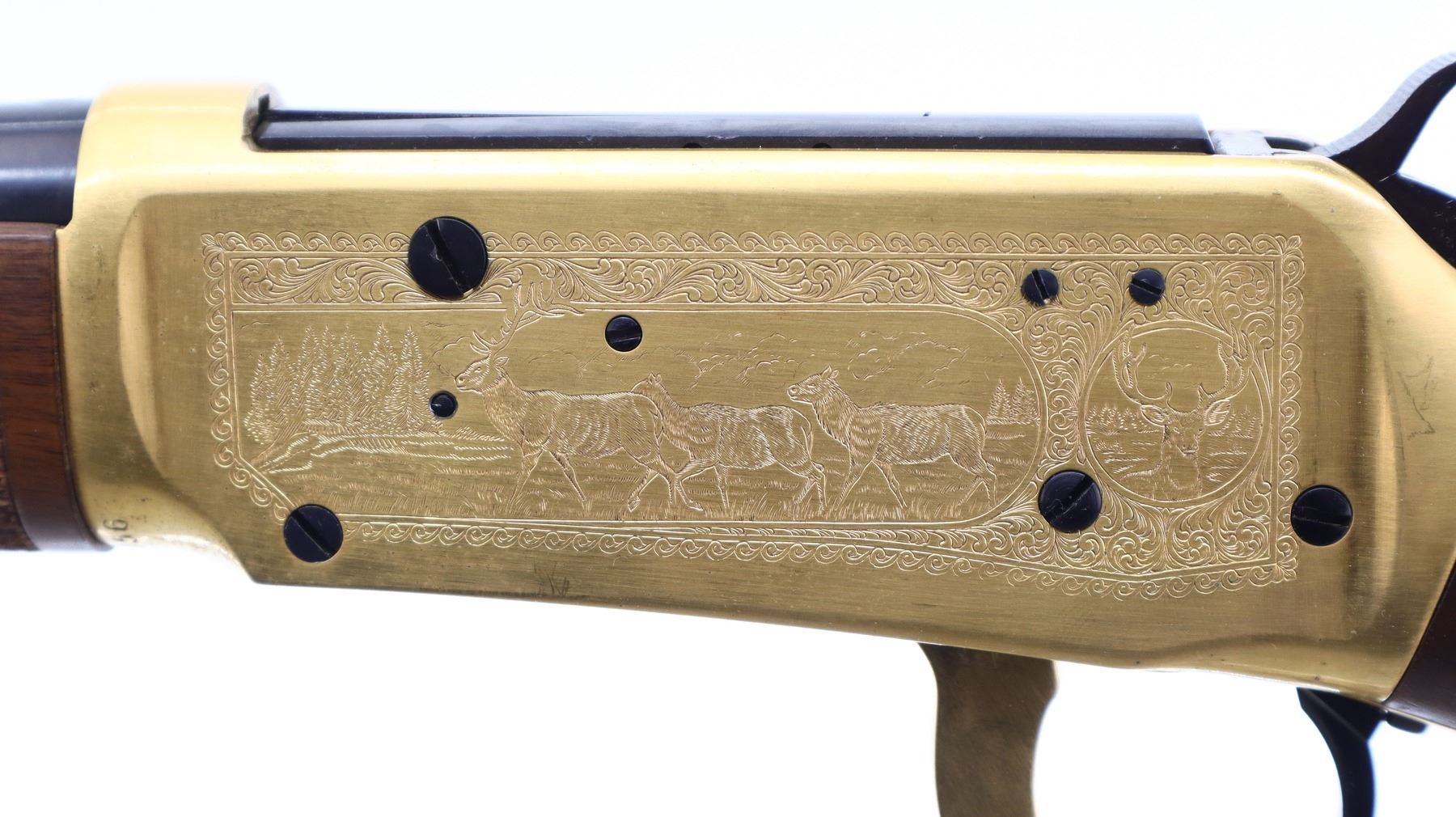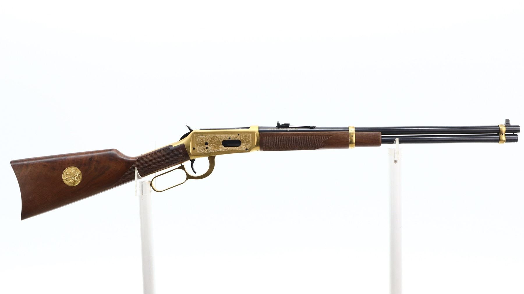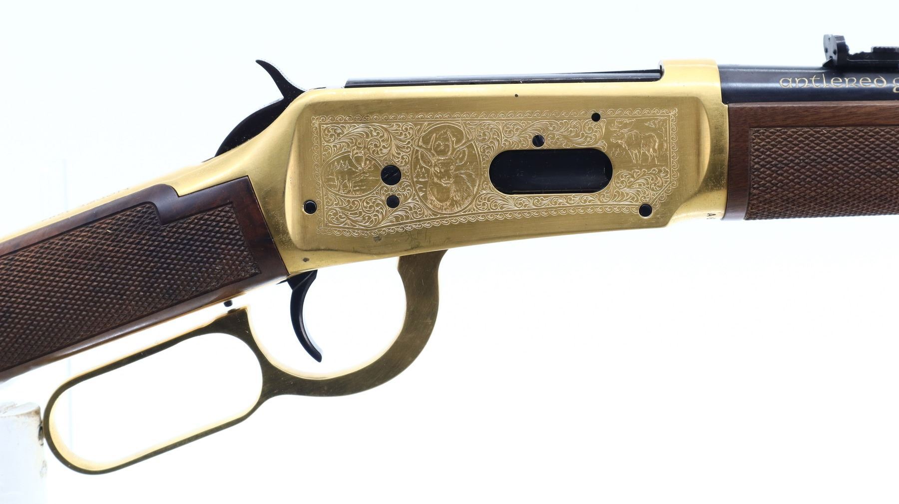 8+/10, WINCHESTER, MODEL: 94 ANTLERED GAME COMMEMORATIVE, CALIBER:30-30 WIN, COMES WITH COMMEMORATIVE SLEEVE, MANUAL, BORE IS EXCELLENT. BLADE FRONT SIGHT, ADJUSTABLE U NOTCHED REAR SIGHT, BLUED BARREL BOLT AND MAG TUBE, GOLD GAME SCENE ENGRAVED RECEIVER, GROOVED SPUR HAMMER. TWO PIECE WOOD STOCKS, CHECKERED FOREARM AND STRAIGHT GRIP, SMOOTH CURVED STEEL BUTT PLATE, MEDALLION IN RIGHT SIDE OF STOCK, FULL LENGTH MAG TUBE. METAL FINISH SHOWS SLIGHT SCRATCHES AND HANDLING MARKS. STOCKS SHOW SLIGHT MARKS AND SCRATCHES. , ACTION: LEVER ACTION RIFLE, BARREL LENGTH: 20", SERIAL # AG17956, CONDITION: 8+/10, CLASS: CANADIAN NON RESTRICTED