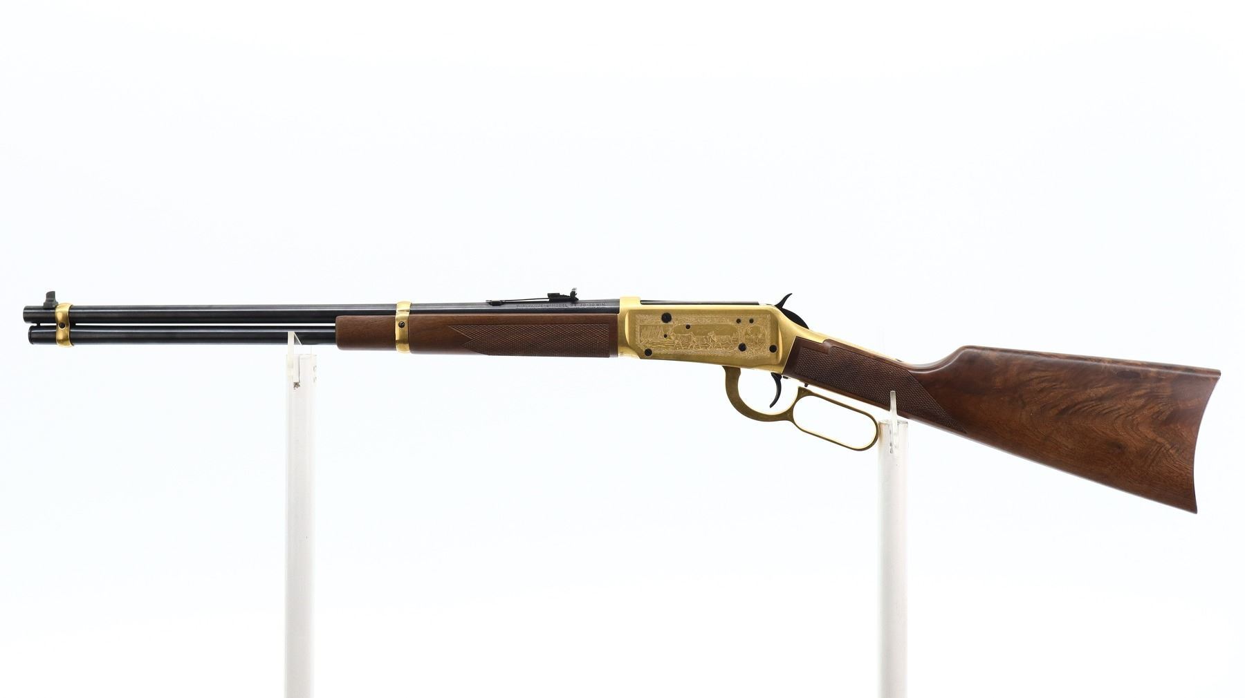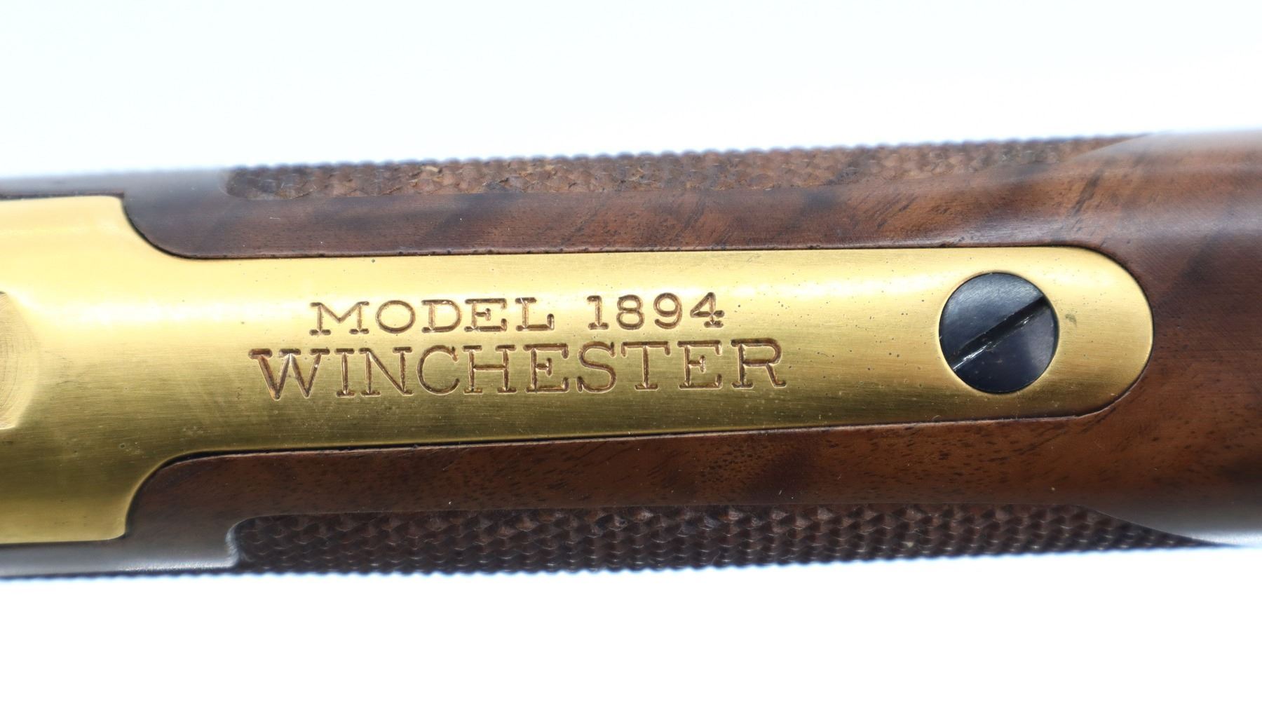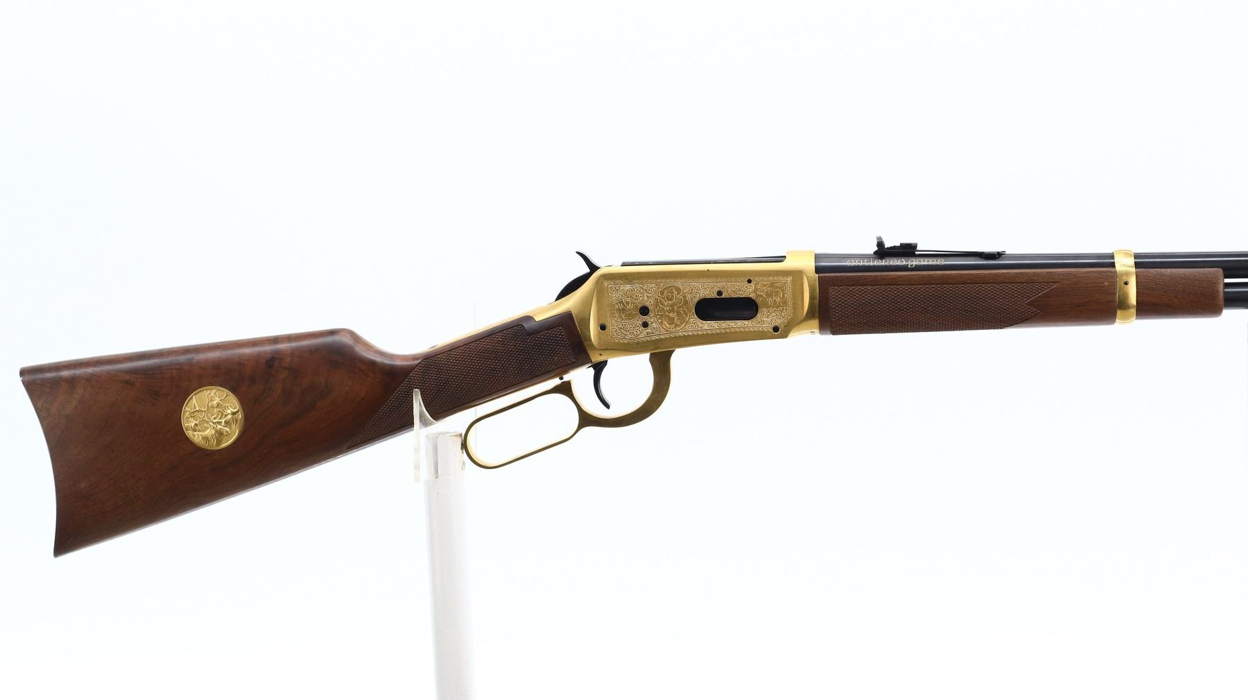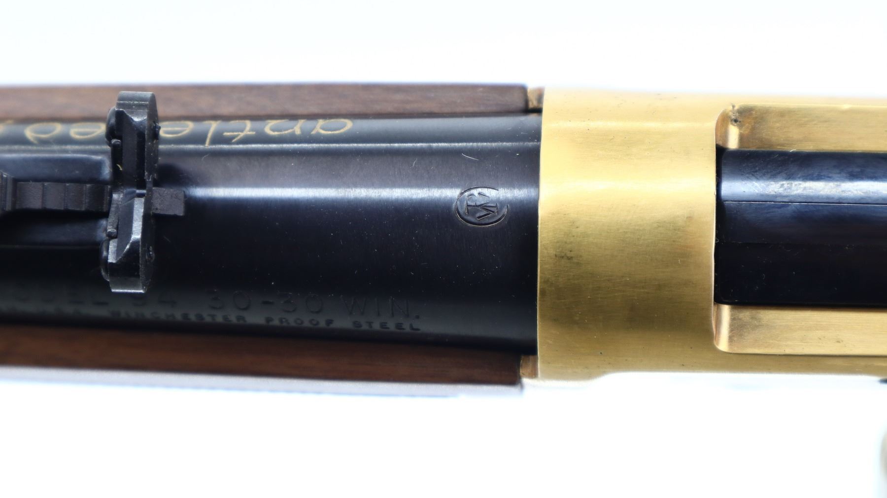 8+/10, WINCHESTER, MODEL: 94 ANTLERED GAME COMMEMORATIVE, CALIBER:30-30 WIN, COMES WITH COMMEMORATIVE SLEEVE, MANUAL, BORE IS EXCELLENT. BLADE FRONT SIGHT, ADJUSTABLE U NOTCHED REAR SIGHT, BLUED BARREL BOLT AND MAG TUBE, GOLD GAME SCENE ENGRAVED RECEIVER, GROOVED SPUR HAMMER. TWO PIECE WOOD STOCKS, CHECKERED FOREARM AND STRAIGHT GRIP, SMOOTH CURVED STEEL BUTT PLATE, MEDALLION IN RIGHT SIDE OF STOCK, FULL LENGTH MAG TUBE. METAL FINISH SHOWS SLIGHT SCRATCHES AND HANDLING MARKS. STOCKS SHOW SLIGHT MARKS AND SCRATCHES. , ACTION: LEVER ACTION RIFLE, BARREL LENGTH: 20", SERIAL # AG17956, CONDITION: 8+/10, CLASS: CANADIAN NON RESTRICTED
