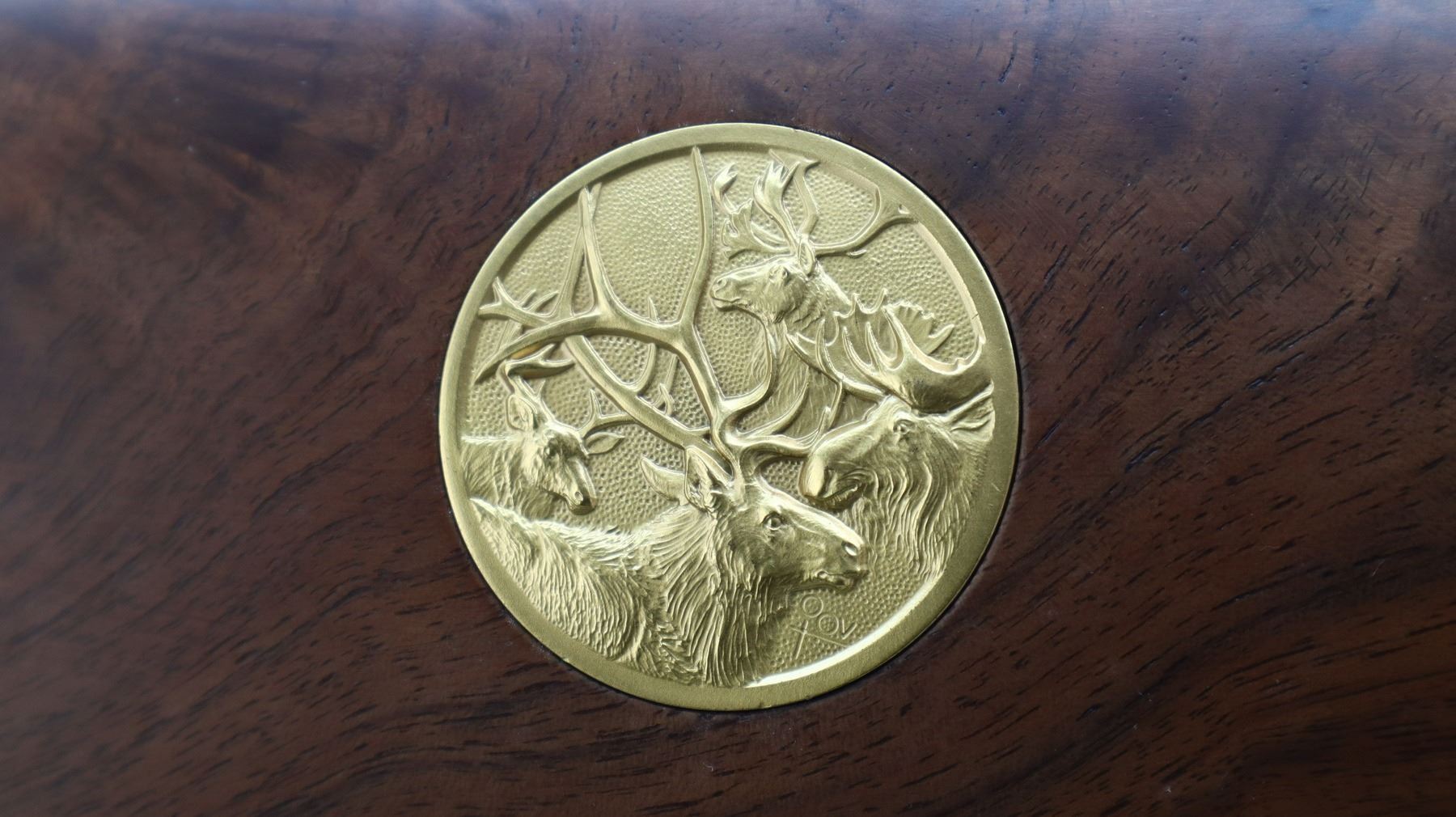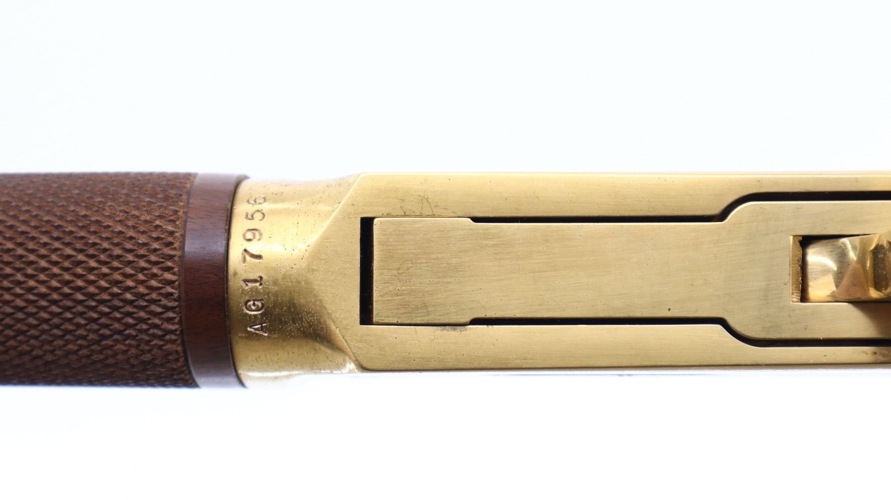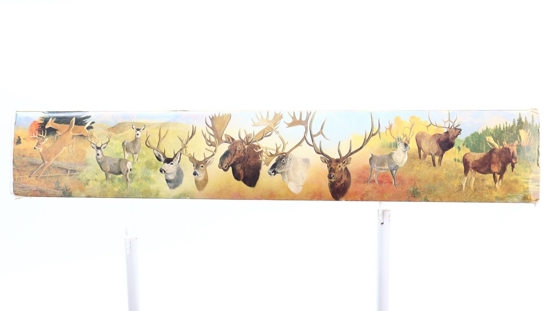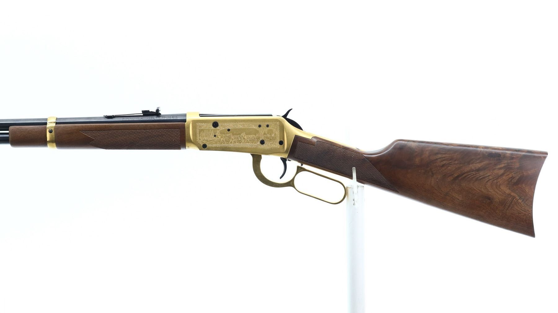 8+/10, WINCHESTER, MODEL: 94 ANTLERED GAME COMMEMORATIVE, CALIBER:30-30 WIN, COMES WITH COMMEMORATIVE SLEEVE, MANUAL, BORE IS EXCELLENT. BLADE FRONT SIGHT, ADJUSTABLE U NOTCHED REAR SIGHT, BLUED BARREL BOLT AND MAG TUBE, GOLD GAME SCENE ENGRAVED RECEIVER, GROOVED SPUR HAMMER. TWO PIECE WOOD STOCKS, CHECKERED FOREARM AND STRAIGHT GRIP, SMOOTH CURVED STEEL BUTT PLATE, MEDALLION IN RIGHT SIDE OF STOCK, FULL LENGTH MAG TUBE. METAL FINISH SHOWS SLIGHT SCRATCHES AND HANDLING MARKS. STOCKS SHOW SLIGHT MARKS AND SCRATCHES. , ACTION: LEVER ACTION RIFLE, BARREL LENGTH: 20", SERIAL # AG17956, CONDITION: 8+/10, CLASS: CANADIAN NON RESTRICTED