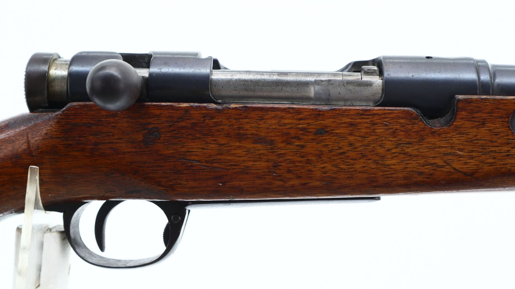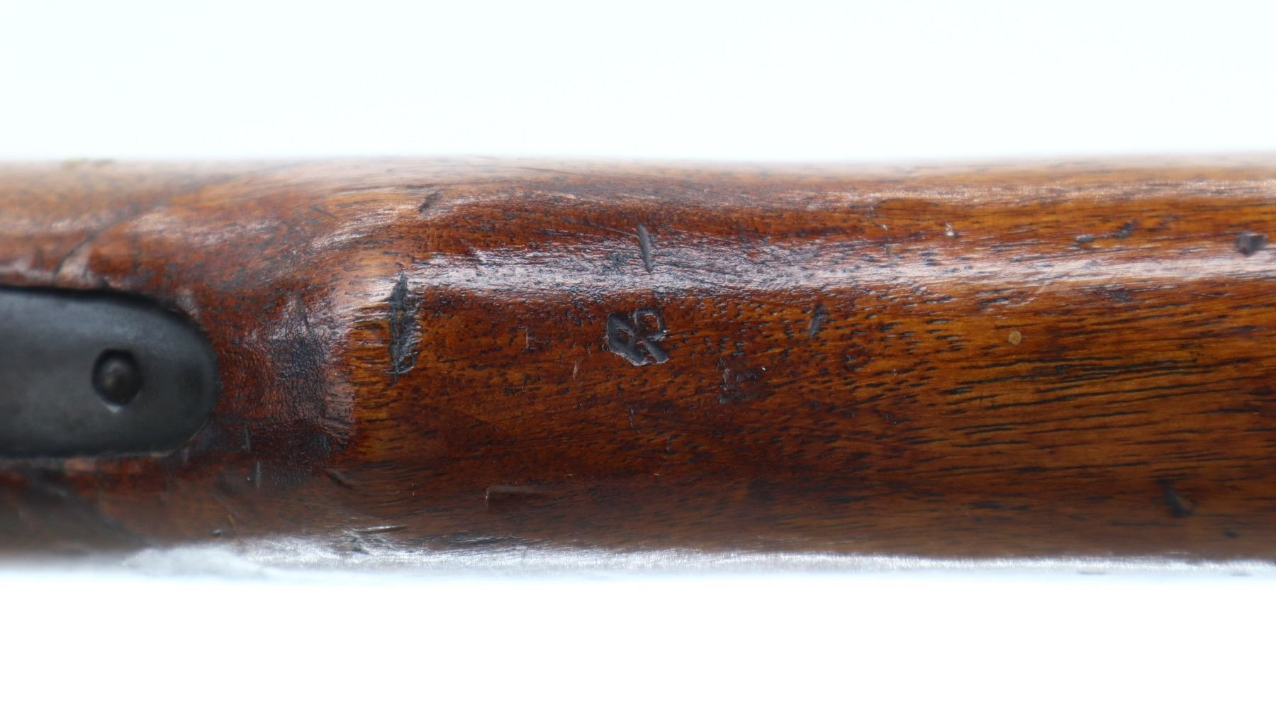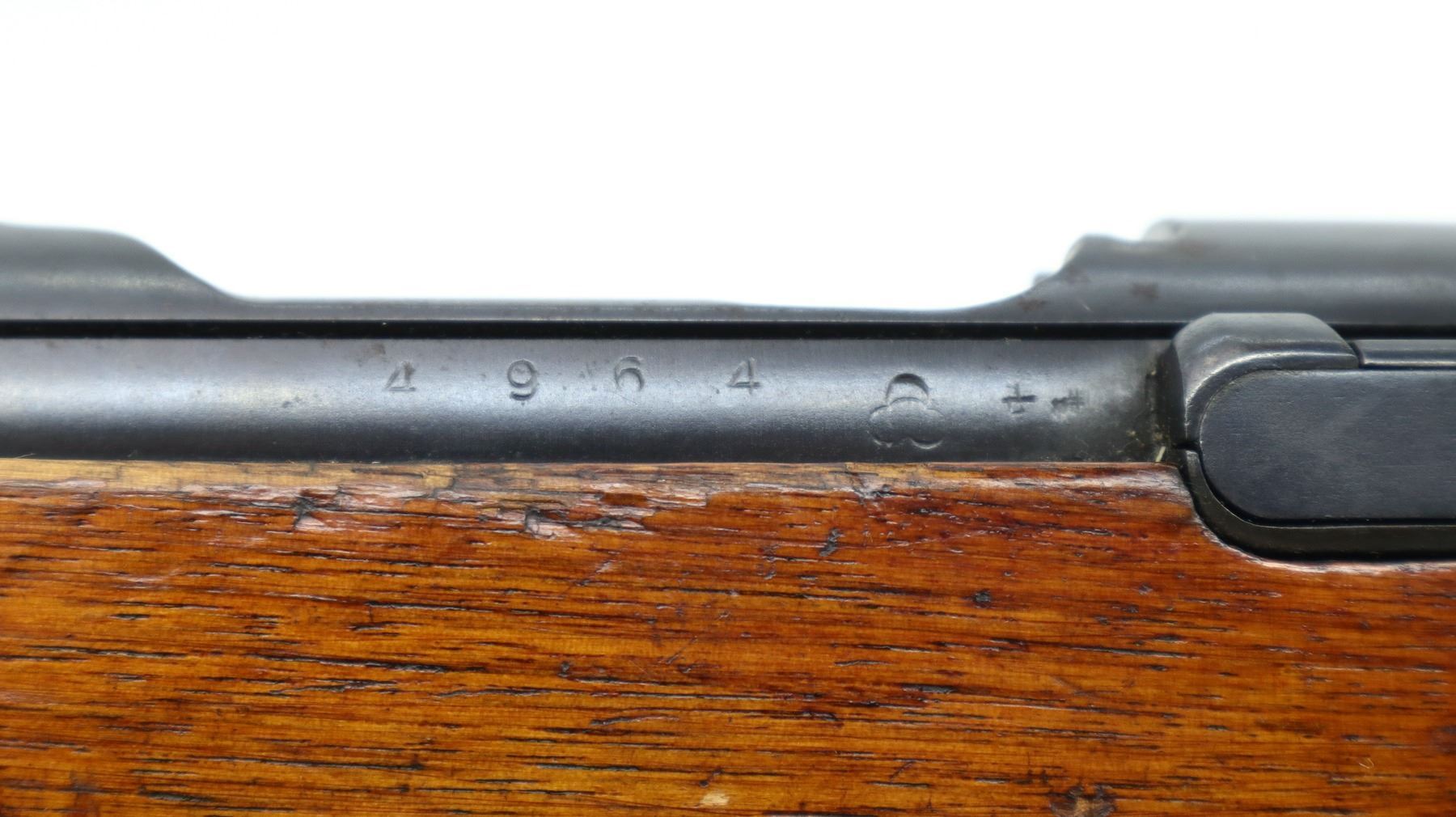 7/10, JAPANESE ARISAKA, MODEL: TYPE 38 CARBINE, CALIBER:6.5 X 50 , BORE IS FAIR, WORN, LIGHT PITTING. BOLT MATCHES. BARLEY CORN FRONT SIGHT WITH EARS AND RAMP, ADJUSTABLE U NOTCHED LADDER REAR SIGHT, CHRYSANTHEMUM REMOVED, MISSING DUST COVER, STRAIGHT BOLT HANDLE. TWO PIECE FULL MILITARY WOOD STOCKS, FINGER GROOVED FOREND, PISTOL GRIP, SMOOTH STEEL BUTT PLATE, SLING SWIVELS, CLEANING ROD, BAYONET LUG. METAL FINISH SHOWS SOME SCRATCHES, HANDLING MARKS AND WEAR. STOCKS SHOW SOME MARKS, SCRATCHES AND WEAR. , ACTION: BOLT ACTION RIFLE, BARREL LENGTH: 19", SERIAL # 4964, CONDITION: 7/10, CLASS: CANADIAN NON RESTRICTED