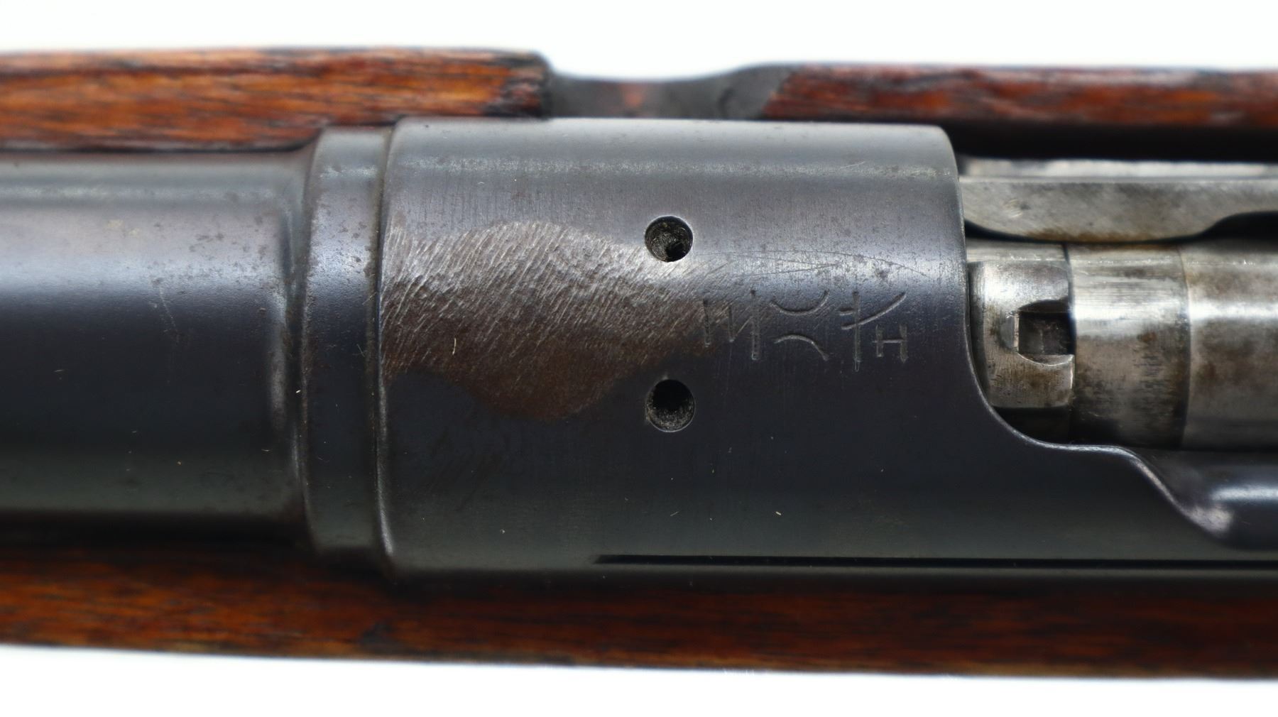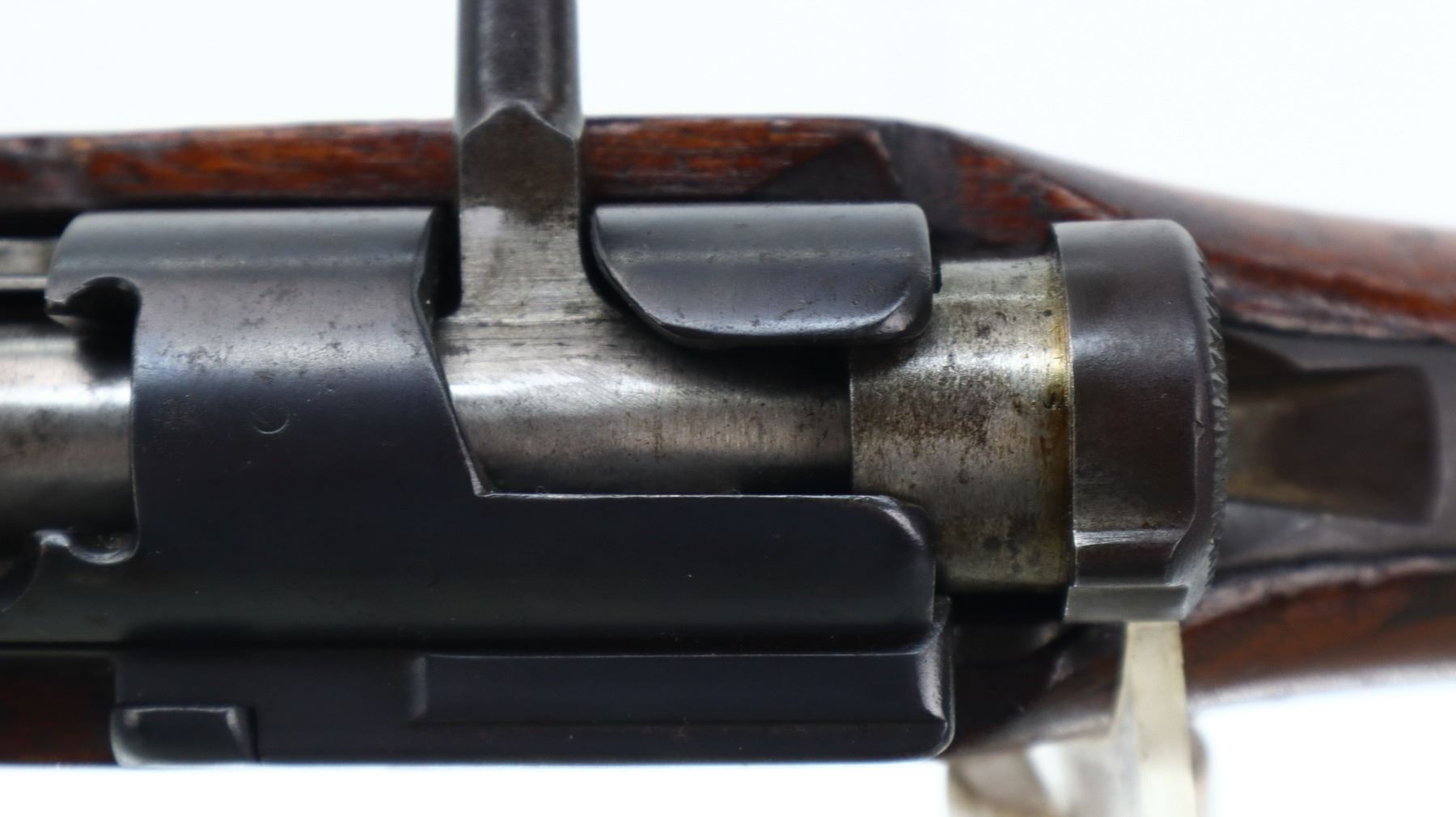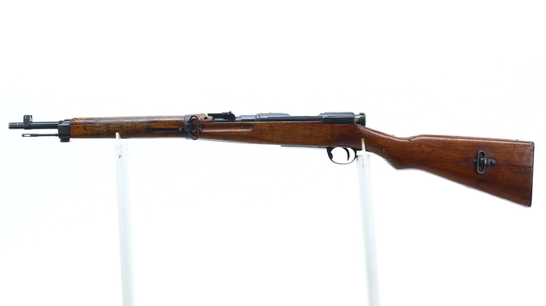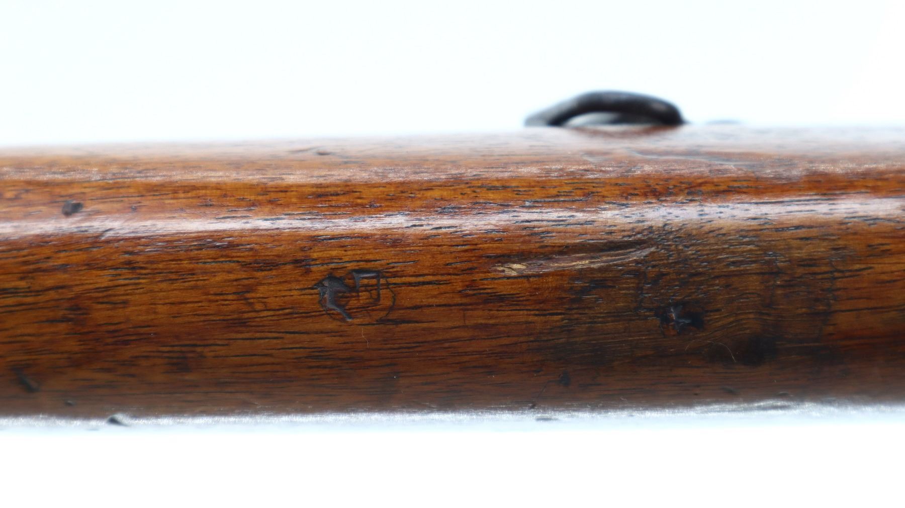 7/10, JAPANESE ARISAKA, MODEL: TYPE 38 CARBINE, CALIBER:6.5 X 50 , BORE IS FAIR, WORN, LIGHT PITTING. BOLT MATCHES. BARLEY CORN FRONT SIGHT WITH EARS AND RAMP, ADJUSTABLE U NOTCHED LADDER REAR SIGHT, CHRYSANTHEMUM REMOVED, MISSING DUST COVER, STRAIGHT BOLT HANDLE. TWO PIECE FULL MILITARY WOOD STOCKS, FINGER GROOVED FOREND, PISTOL GRIP, SMOOTH STEEL BUTT PLATE, SLING SWIVELS, CLEANING ROD, BAYONET LUG. METAL FINISH SHOWS SOME SCRATCHES, HANDLING MARKS AND WEAR. STOCKS SHOW SOME MARKS, SCRATCHES AND WEAR. , ACTION: BOLT ACTION RIFLE, BARREL LENGTH: 19", SERIAL # 4964, CONDITION: 7/10, CLASS: CANADIAN NON RESTRICTED