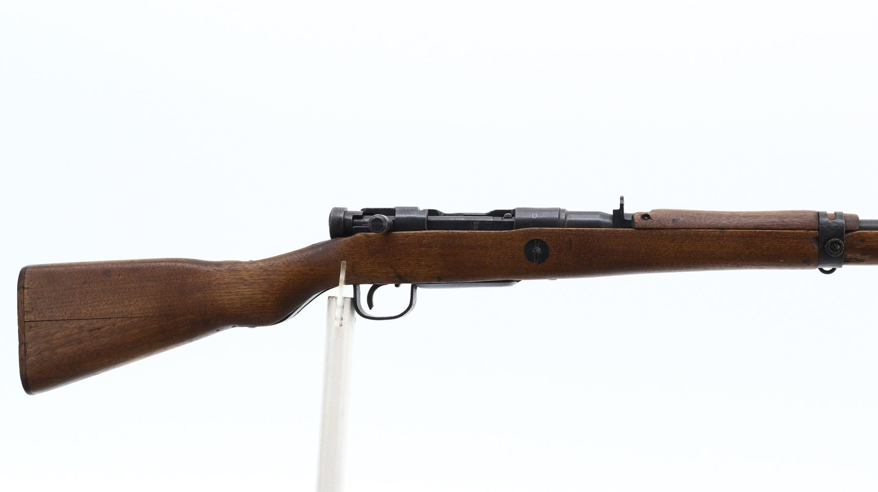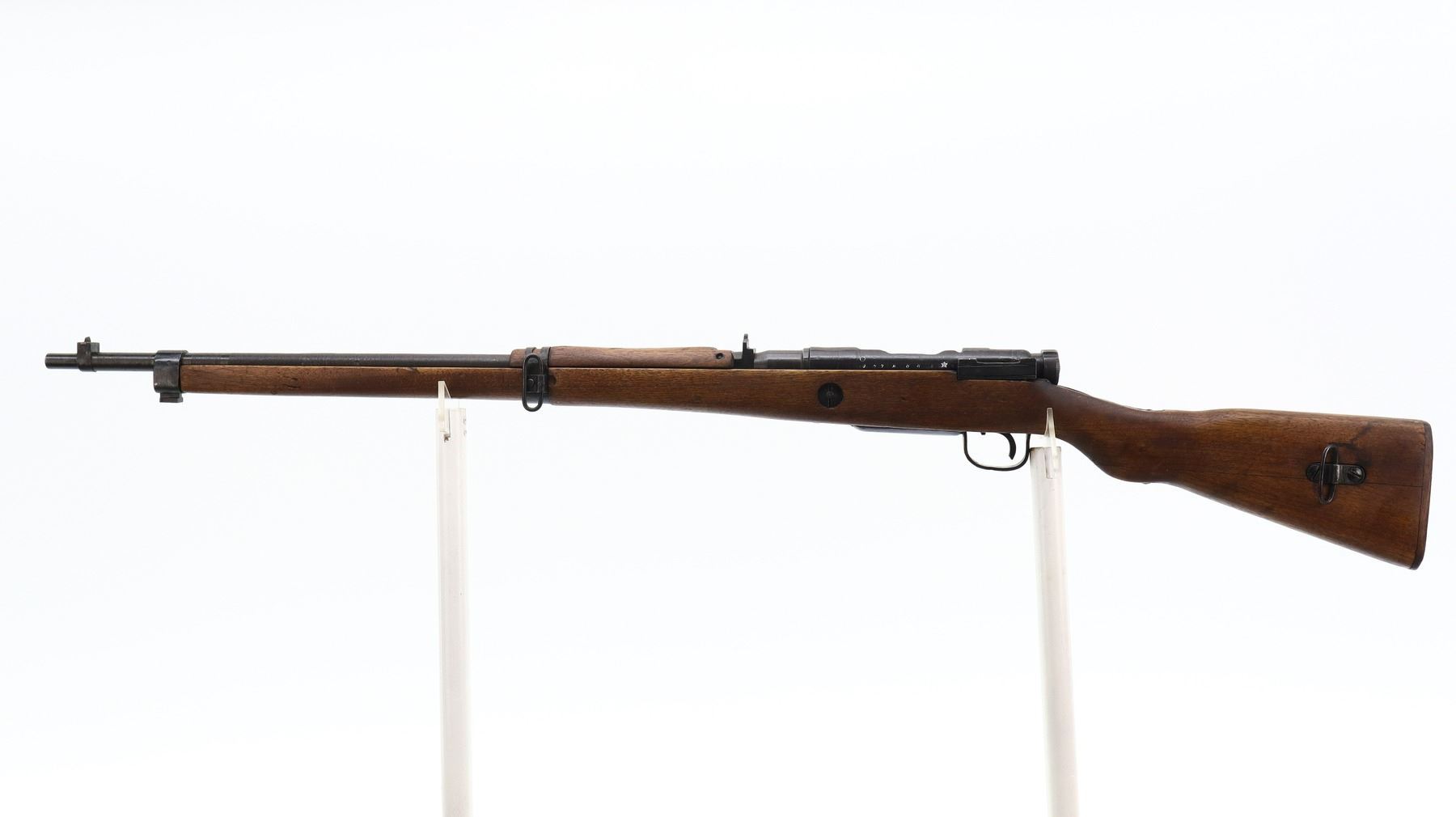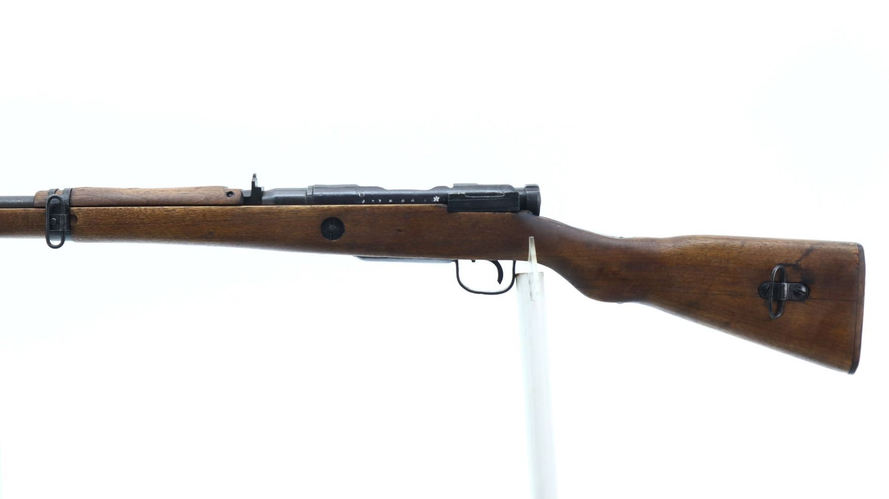 7/10, JAPANESE ARISAKA, MODEL: TYPE 99 LAST DITCH, CALIBER:7.7 X 58, BORE IS FAIR, WORN, LIGHT PITTING. BOLT MATCHES. BARLEY CORN FRONT SIGHT WITH RAMP, FIXED REAR PEEP SIGHT, CHRYSANTHEMUM GROUND OFF, NO PROVISION FOR DUST COVER, FLAT SIDED BOLT KNOB. TWO PIECE FULL MILITARY WOOD STOCKS, PISTOL GRIP, SMOOTH WOOD BUTT PLATE, SLING SWIVELS, BAYONET LUG. RIFLE EXHIBITS ROUGH MACHINING AND FITTING OF LATE WAR MANUFACTURE. METAL FINISH SHOWS SOME SCRATCHES, HANDLING MARKS AND WEAR. STOCKS SHOW SOME MARKS, SCRATCHES AND WEAR. , ACTION: BOLT ACTION RIFLE, BARREL LENGTH: 26", SERIAL # 77883, CONDITION: 7/10, CLASS: CANADIAN NON RESTRICTED