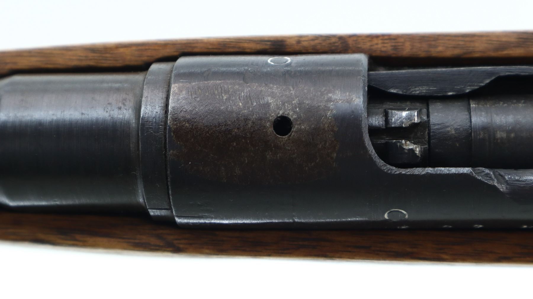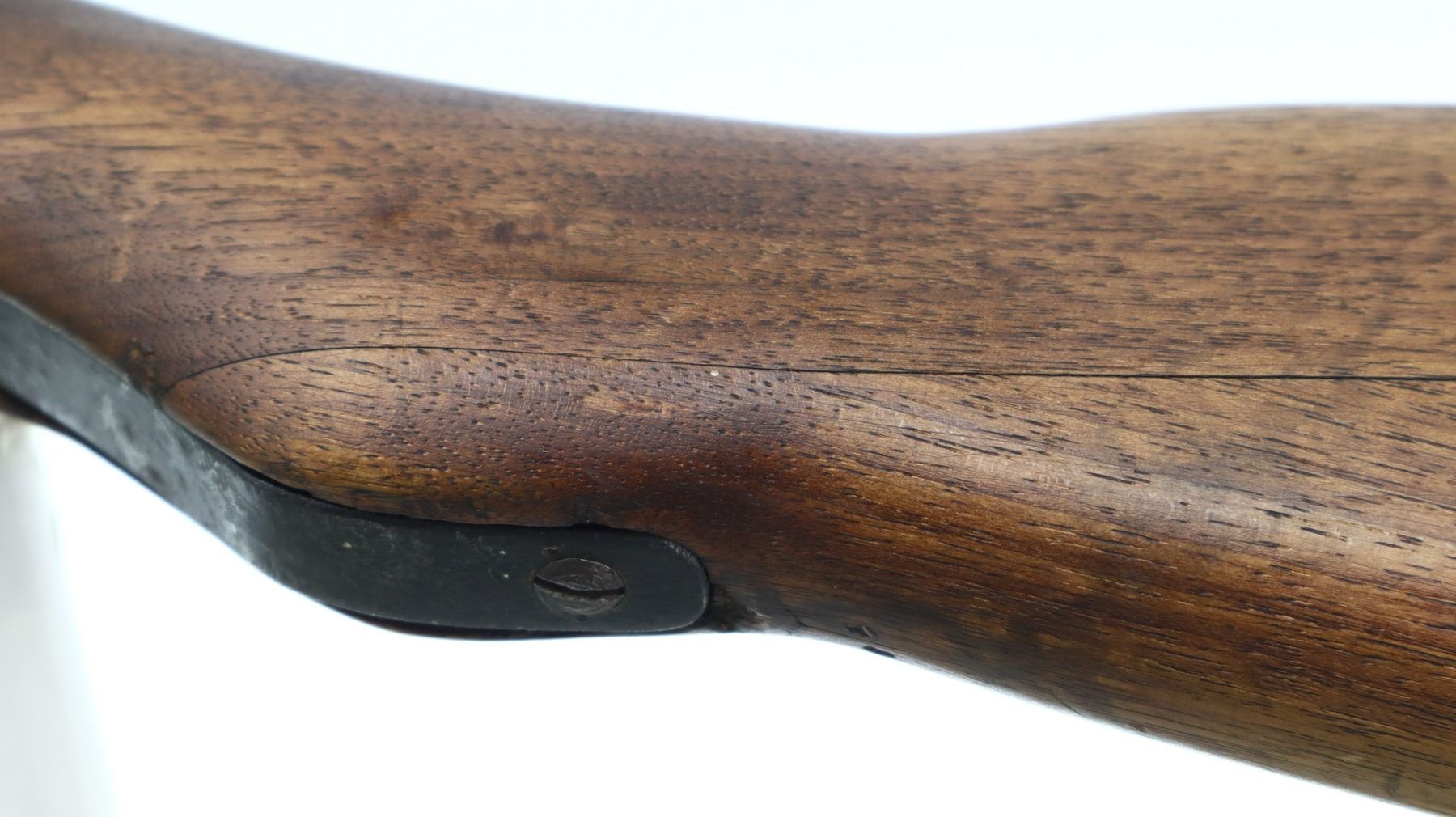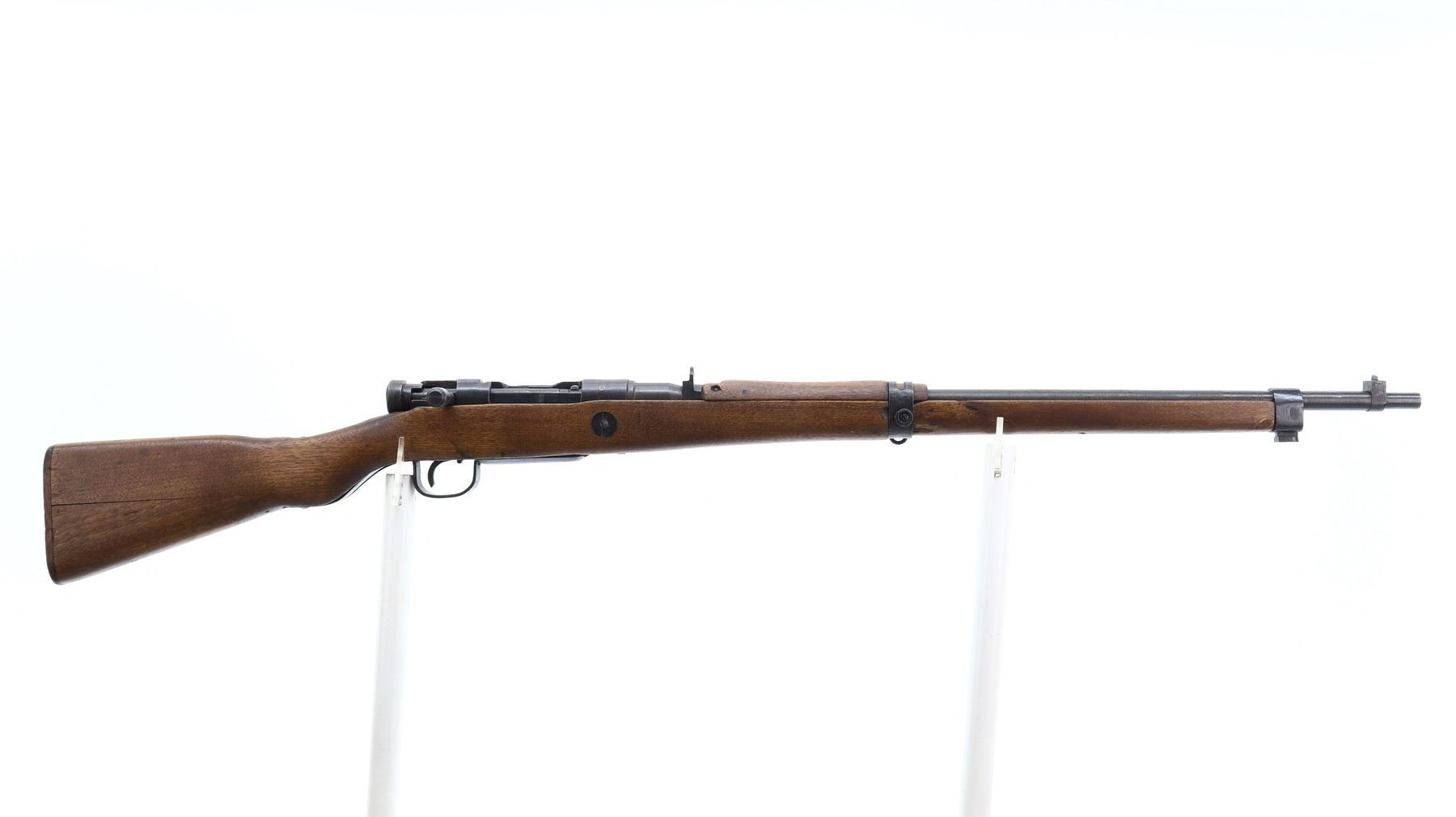 7/10, JAPANESE ARISAKA, MODEL: TYPE 99 LAST DITCH, CALIBER:7.7 X 58, BORE IS FAIR, WORN, LIGHT PITTING. BOLT MATCHES. BARLEY CORN FRONT SIGHT WITH RAMP, FIXED REAR PEEP SIGHT, CHRYSANTHEMUM GROUND OFF, NO PROVISION FOR DUST COVER, FLAT SIDED BOLT KNOB. TWO PIECE FULL MILITARY WOOD STOCKS, PISTOL GRIP, SMOOTH WOOD BUTT PLATE, SLING SWIVELS, BAYONET LUG. RIFLE EXHIBITS ROUGH MACHINING AND FITTING OF LATE WAR MANUFACTURE. METAL FINISH SHOWS SOME SCRATCHES, HANDLING MARKS AND WEAR. STOCKS SHOW SOME MARKS, SCRATCHES AND WEAR. , ACTION: BOLT ACTION RIFLE, BARREL LENGTH: 26", SERIAL # 77883, CONDITION: 7/10, CLASS: CANADIAN NON RESTRICTED